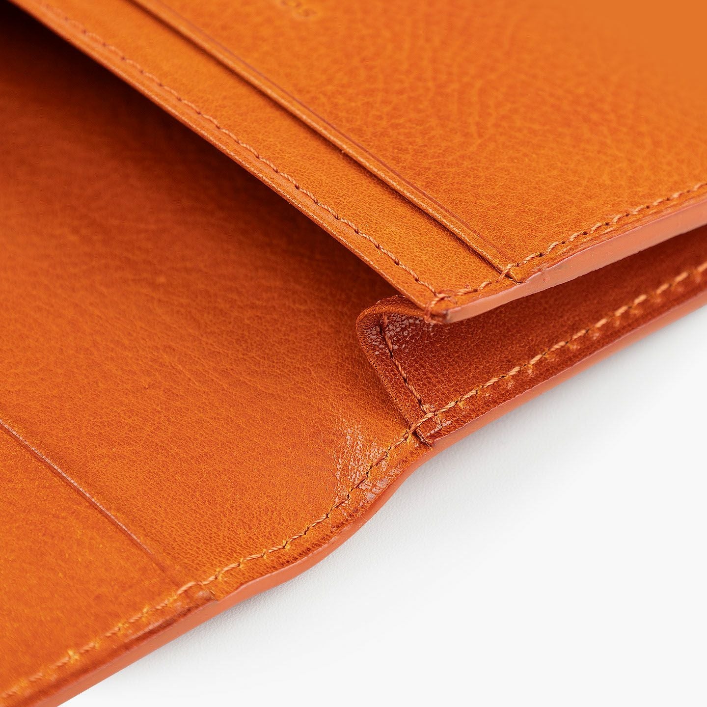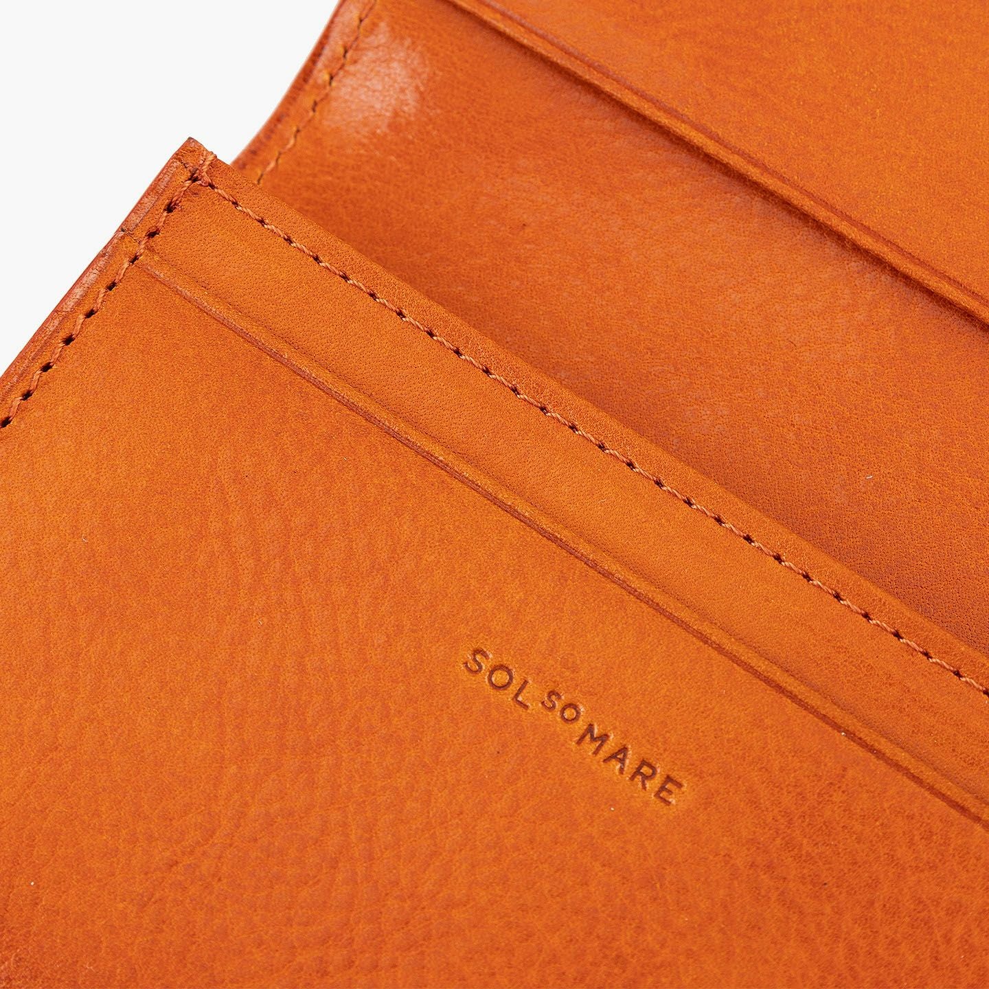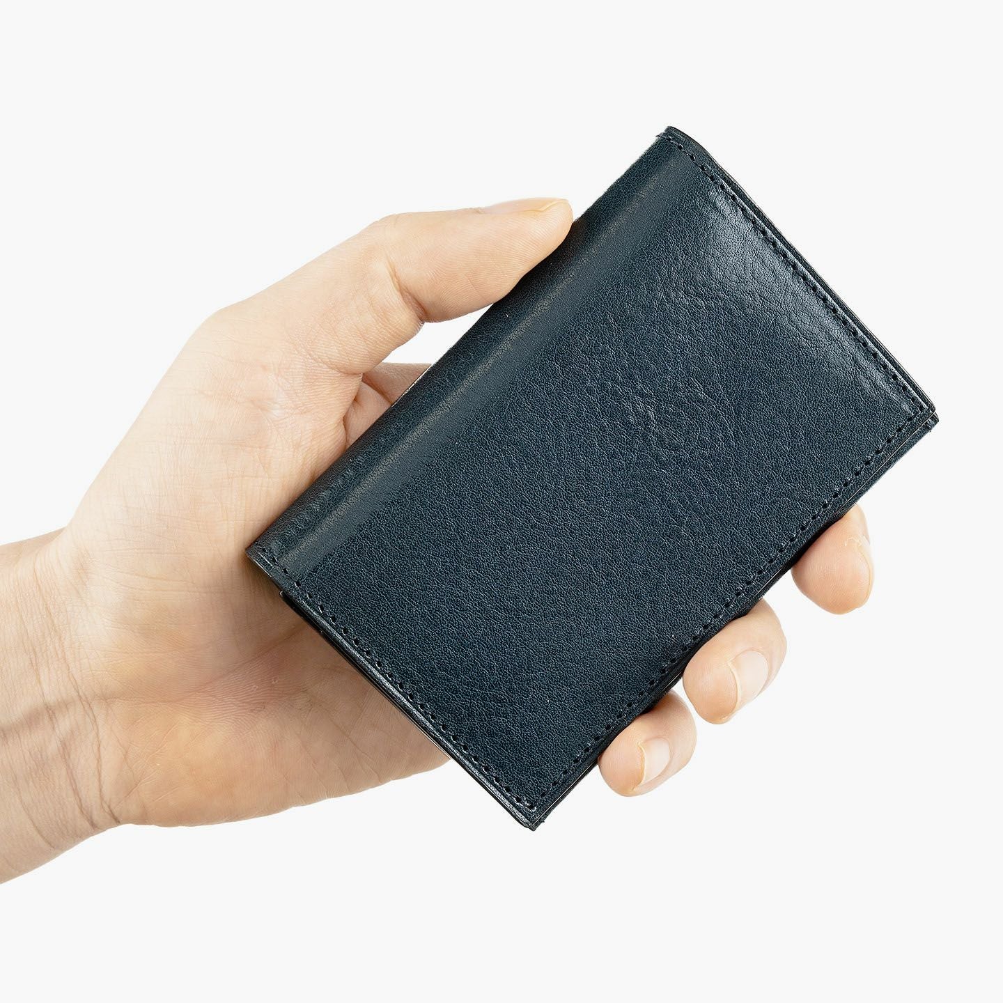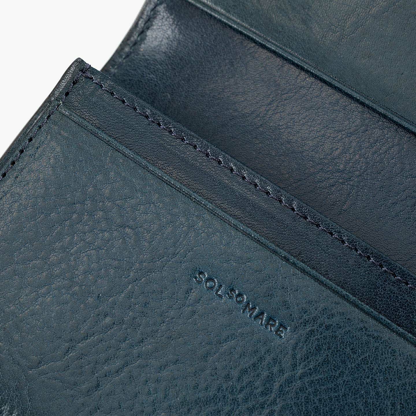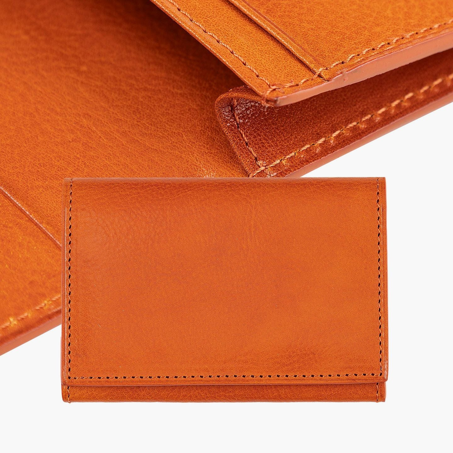 あなたが暮らしているモノがあふれる時代に、自然の情緒と色彩の感動を綴ったレザーアイテムを届けている、ファクトリーブランド『SOLSOMARE』のササマチ名刺入れ。深みと落ち着きのある「イタリアンショルダー」の、Orange/Navy Blueのいずれかの色合いからセレクトでき、厳選された牛革を鞣しの段階でオイルを含ませた丈夫さとエイジングの楽しさを両立。20枚ほどの名刺を収納できるササマチ付きポケット1つとカードポケット2つを備えながら、スーツなどの胸ポケットにも収まるスリムなフォルムが、ビジネスシーンにスマートな活躍をもたらしてくれる。