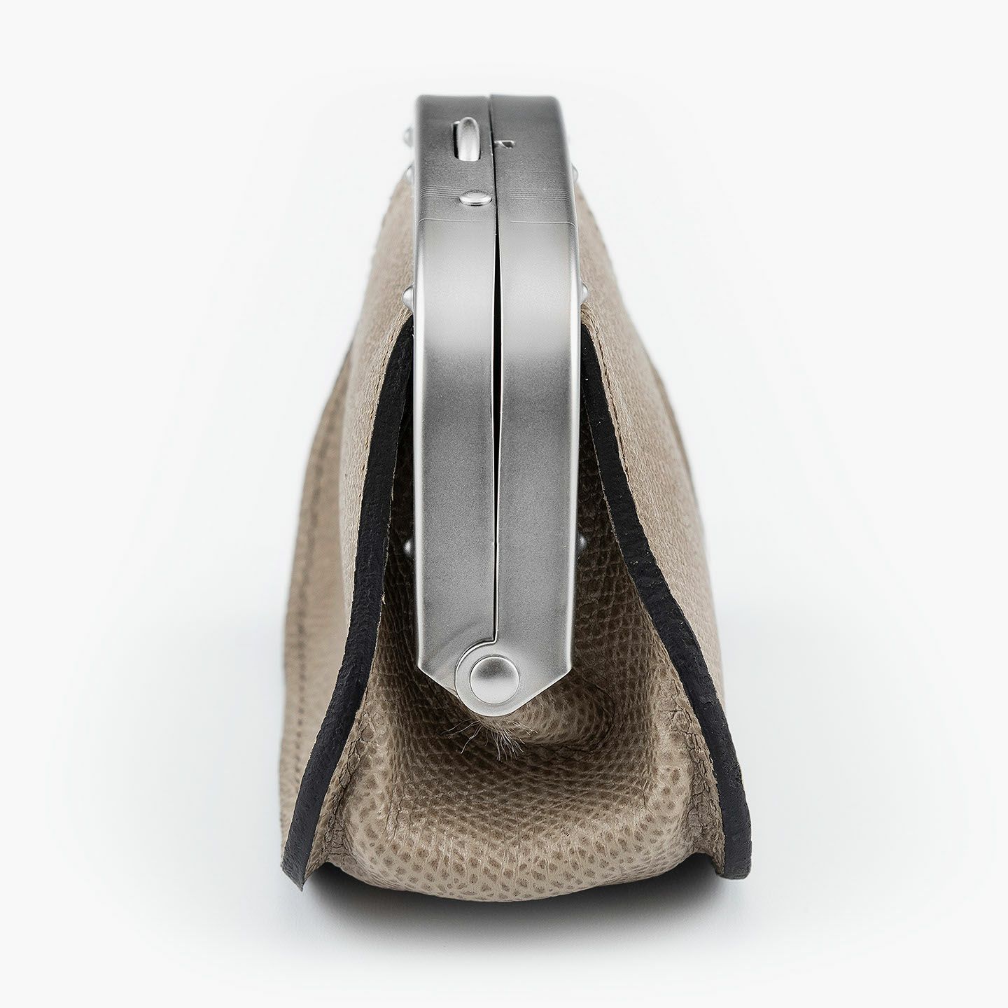 未来のスタンダードとして、独自のデザイン性を取り入れながら日常に彩りを与えていく、ユニークなファクトリーブランド『SOPO』による、がま口ミニウォレット。最高級カーフレザー「ドーフィン」の上質感を、コンパクトな愛らしいフォルムで印象的に引き立てながら、ダイキャスト成型のフレームによる個性的な形状と、ツヤ消しのシルバーによる洗練されたセミマット感で、現代的な“がま口”へとアップデート。上部のボタンで開く内部には、可動する仕切りによりマルチポケット2つを備え、小銭と紙幣(四つ折り)を分けられるなどの実用性も感じさせてくれる。