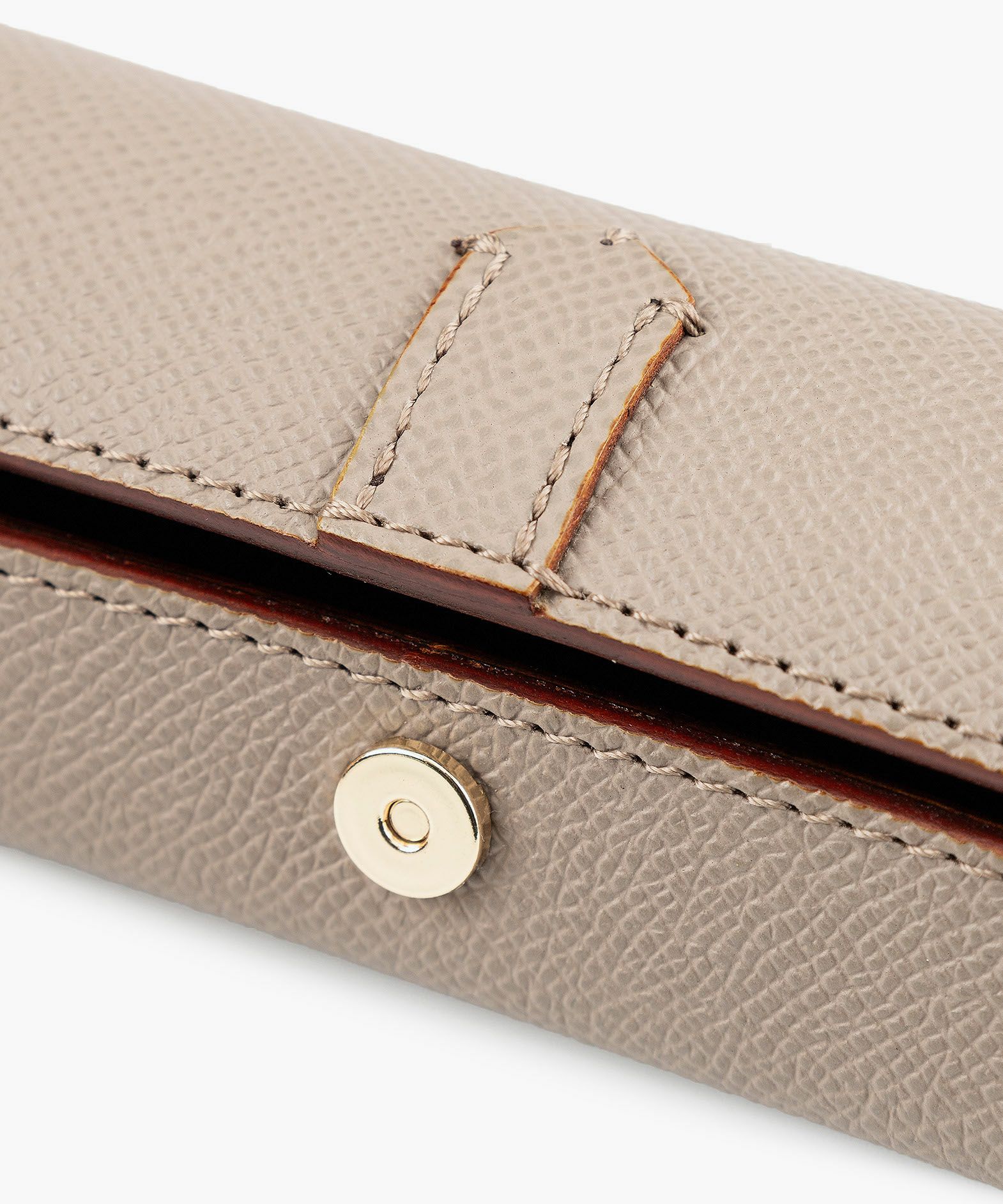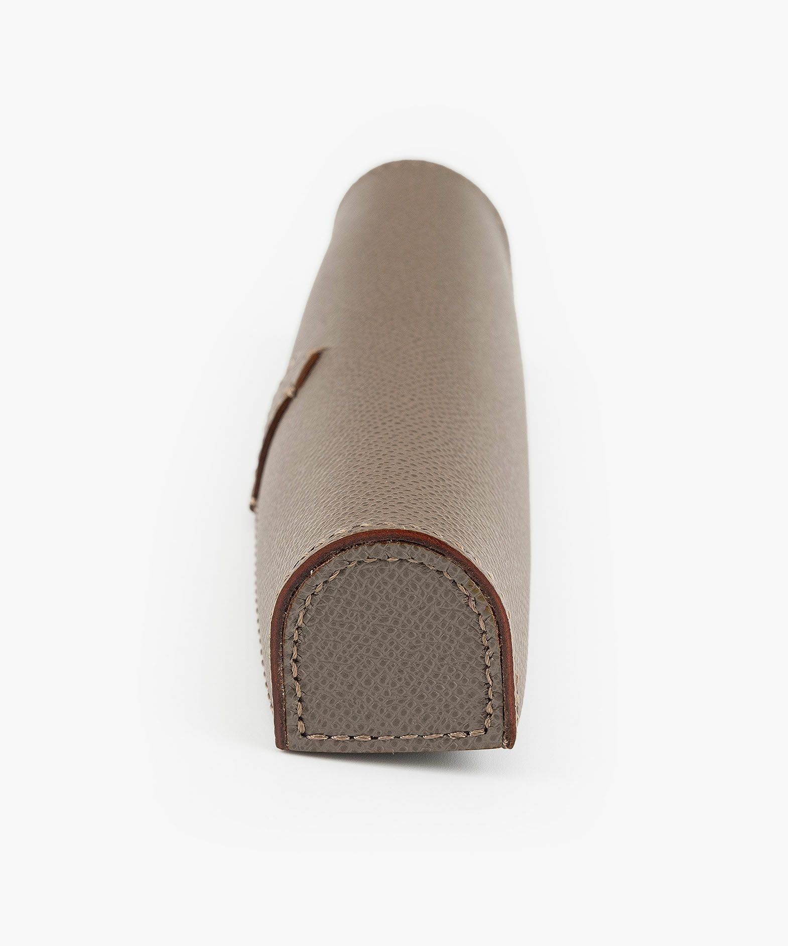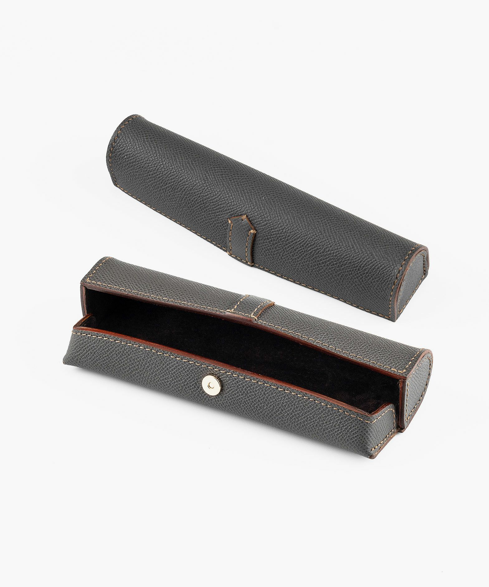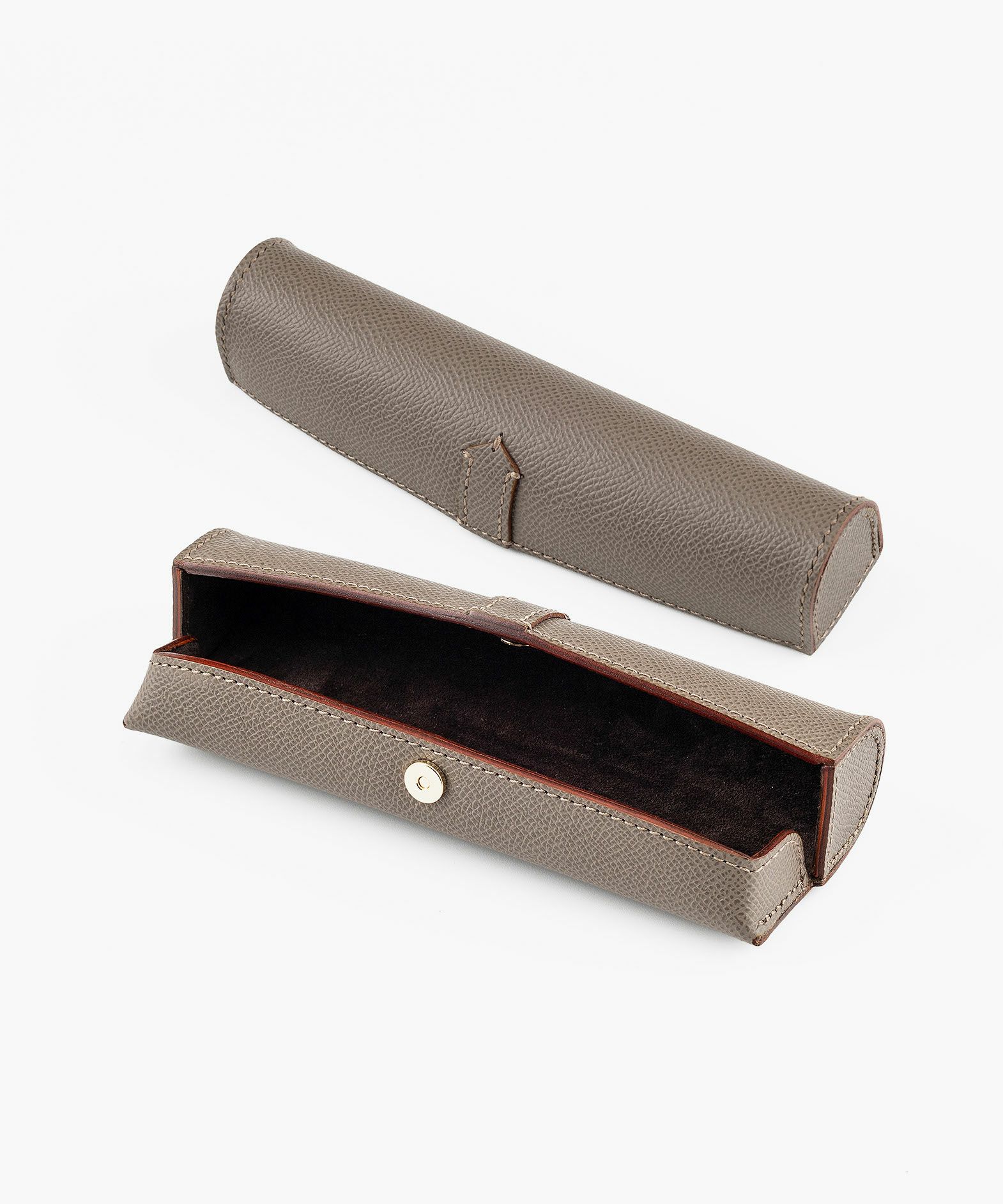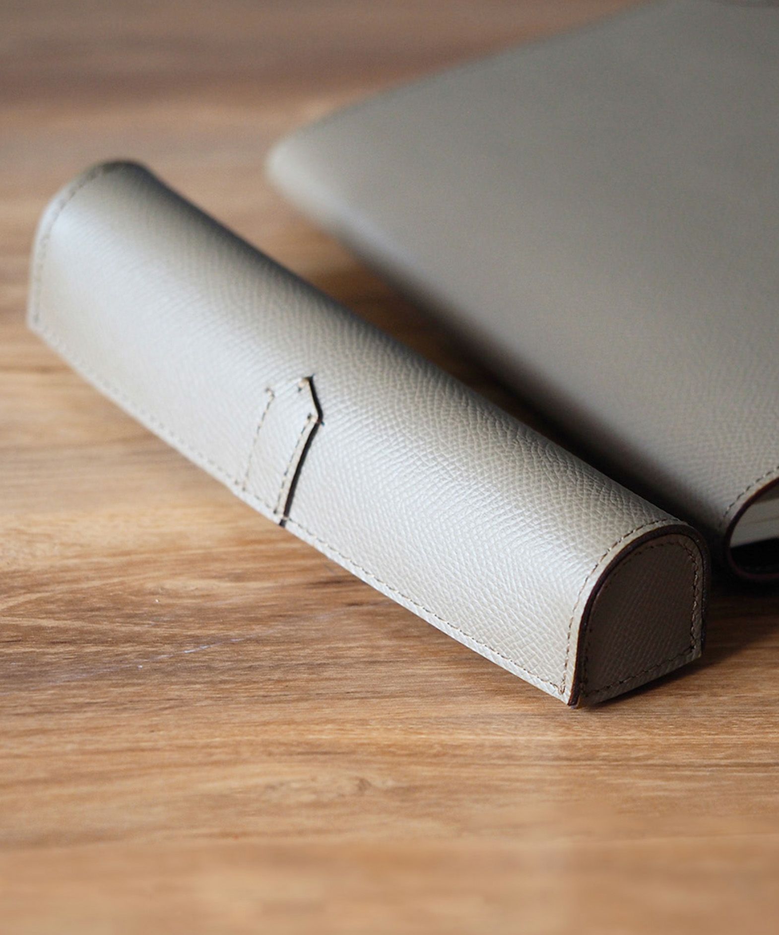 ドーム状のフォルムが外部からの衝撃を抑えるとともに、開いたまま置いておくとペントレーとしても使える形状になる、ペンケース“HANGAR-S”。その印象的なデザインの外装には、マットな型押しの表情が美しく、有名な老舗メゾンでも愛用されている、フランス・アース社製「ダービー」を採用。小キズ・汚れ・水分にも強いので、キレイな状態のまま長く使い続けられる特長も。内装の「ピッグスエード」は、高いクッション性で収納している筆記具をやさしく保護するとともに、手触りの良さも快適感を創出。マグネットホック式でワンタッチ開閉ができるとともに、大きく開くので視認性も高く、出し入れもしやすい構造。高級感あふれる上品なステーショナリーが、大人の洒落感をさらに引き上げてくれる。