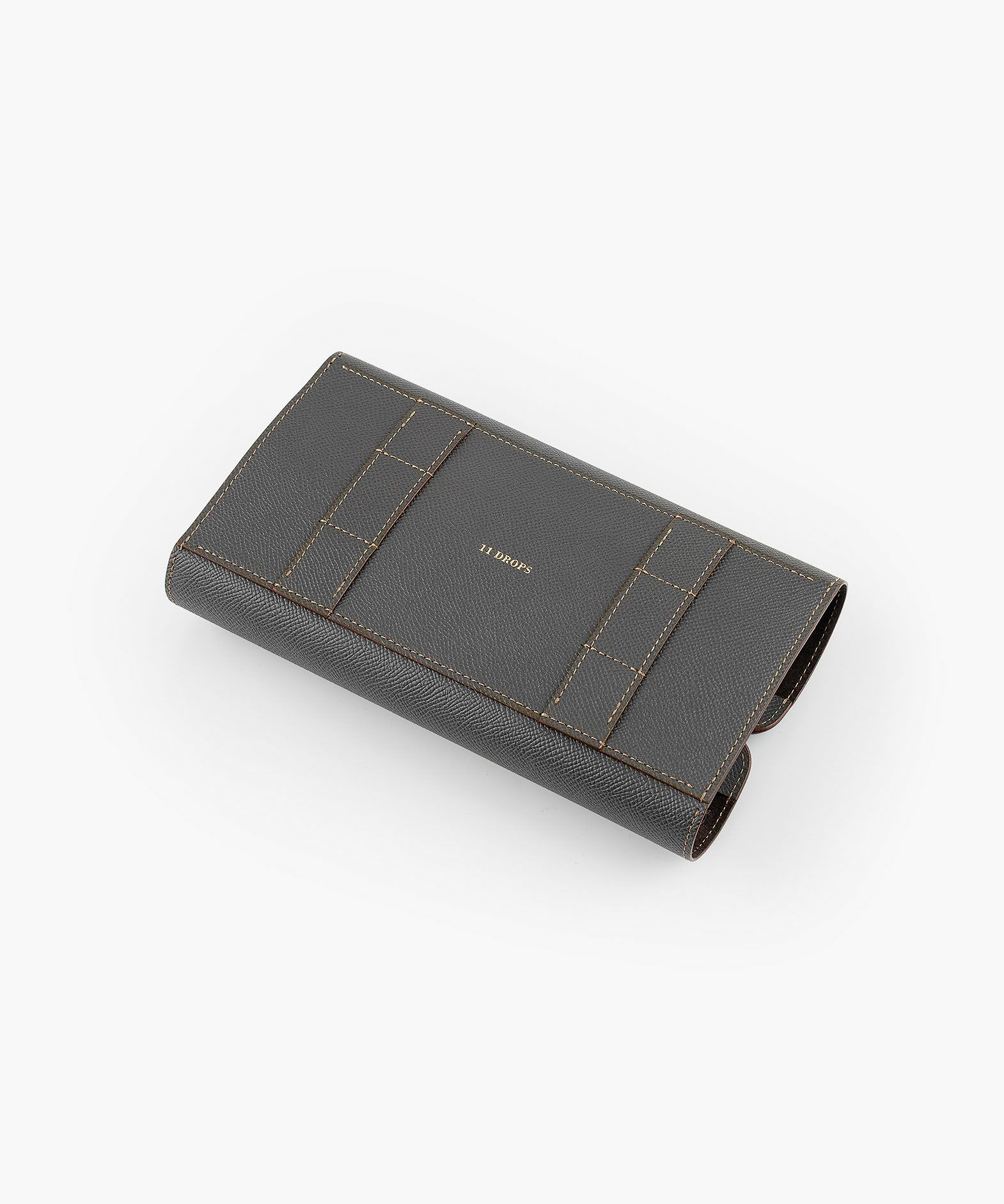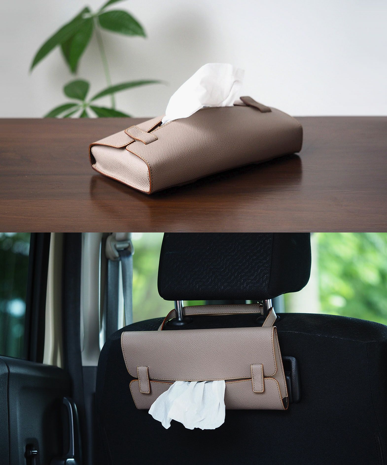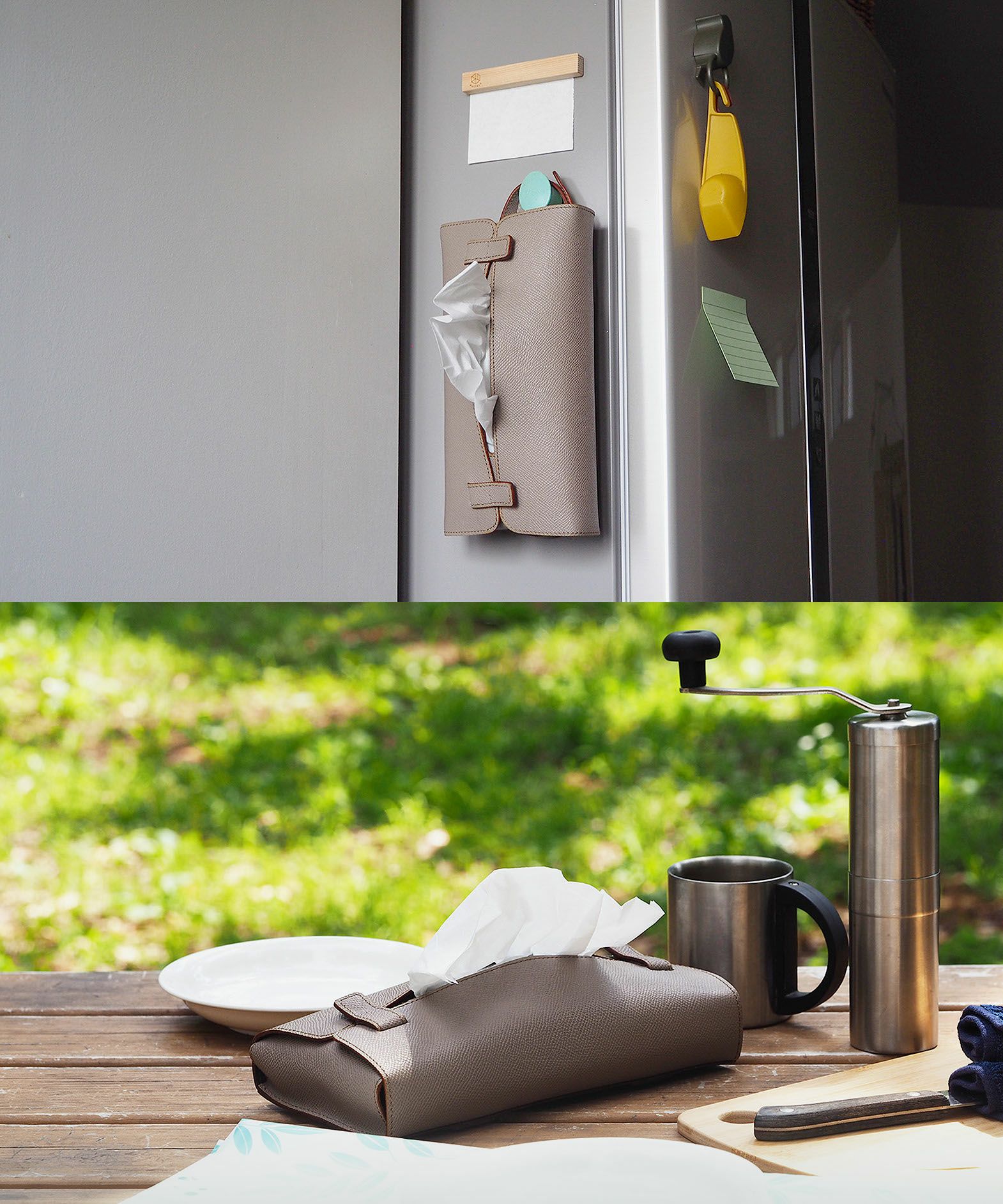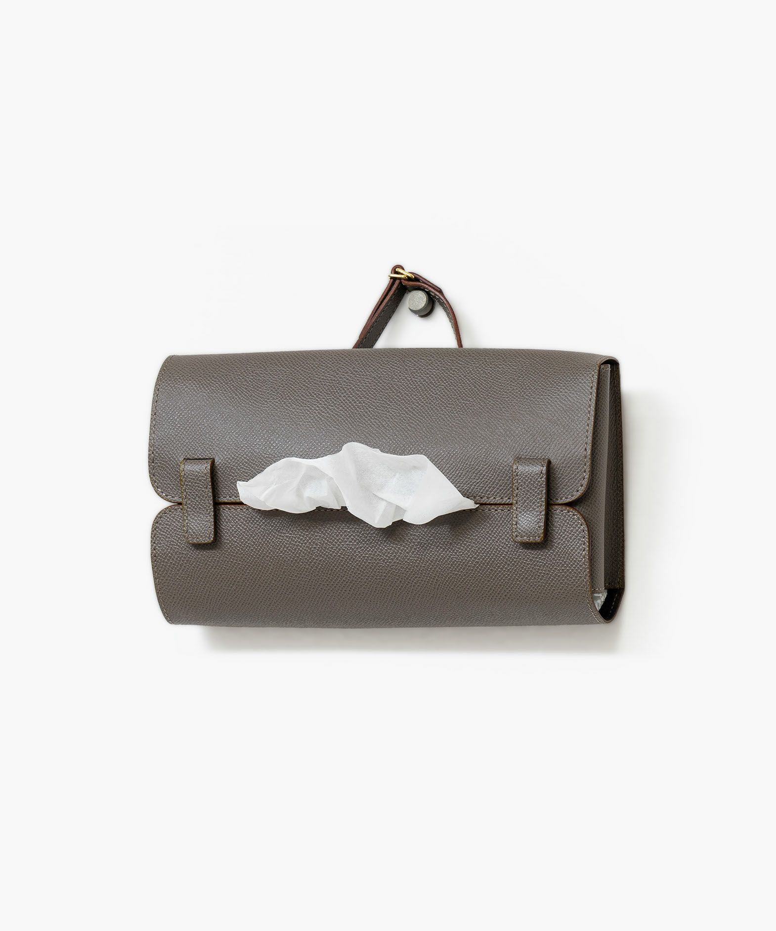 独自のマチ構造により、ティッシュの内容量(収納枚数)に合わせて、ボディ全体が膨らんだり萎んだりして厚みが変わる、ソフトパック専用の折り畳み型ティッシュカバー“Swell”。細かな型押しのマットな表情が美しい、フランス・アース社製「ダービー」を外装として採用。小キズ・汚れ・水分に強いので、ラフに扱ってもキレイな状態のまま長く使い続けられるのも特長。長さ約70cmのレザーストラップを付属し、壁掛けや自動車シートなどに提げて使うことも。ティッシュを取り出すたびに小さくなっていく佇まいが、使い込むたびに大きくなっていく愛着感にもなり、シーンを問わず満足感をもたらしてくれる。