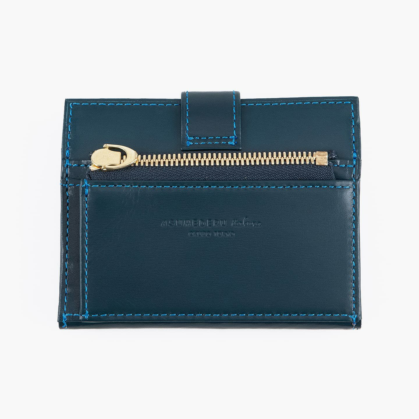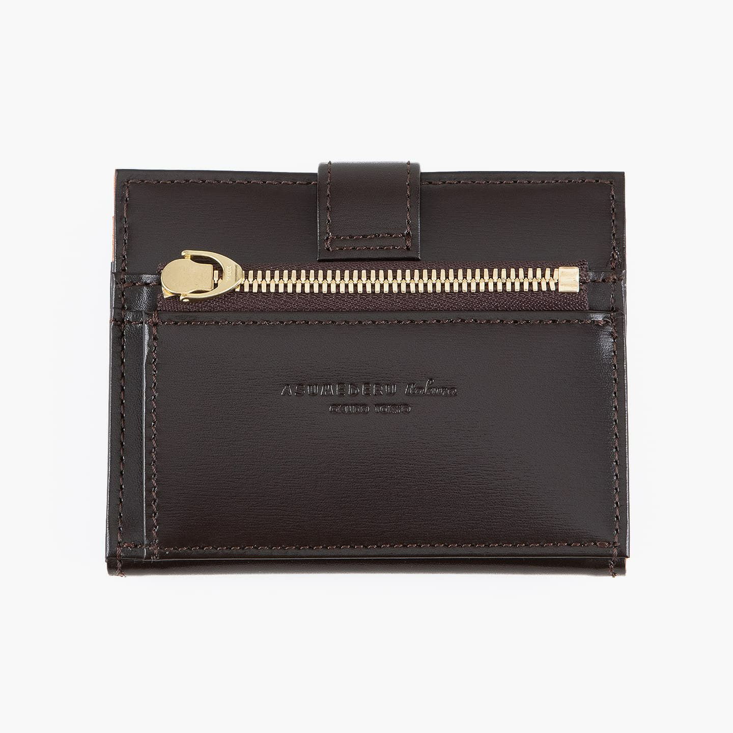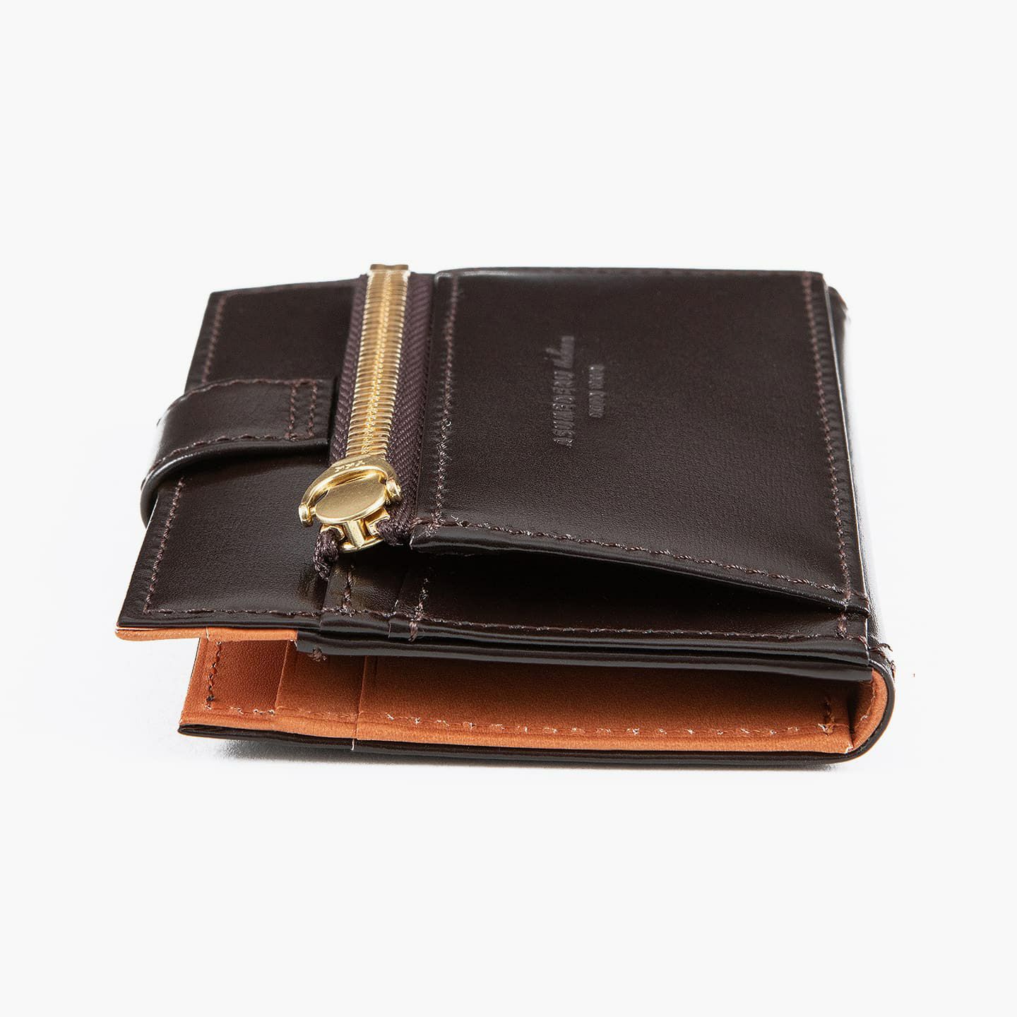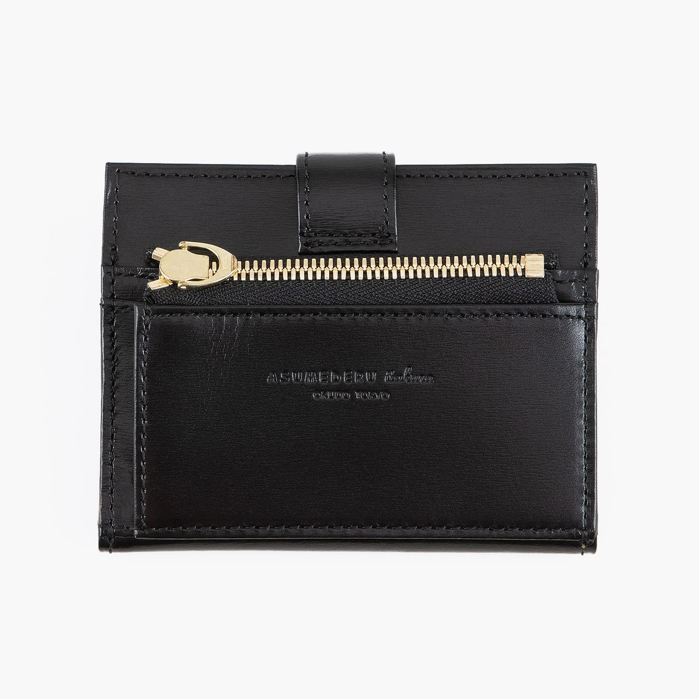 40年以上も試行錯誤を重ねながら、財布を作り続けている革製品ブランド『ASUMEDERU』のコンパクトウォレット。コンパクトなサイズでありながら、実用新案登録も取得しているマネークリップのような札押さえ付きポケット財布として、洒落感と機能性を併せ持つ。ホック付きのベルトがデザイン性と安心感を創出しながら、最高級ボックスカーフ「クリスぺルカーフ」とカジュアルな仕様との融合が真新しさを感じさせるとともに、ゴールドファスナーとの調和が大人の魅力も高めてくれる。