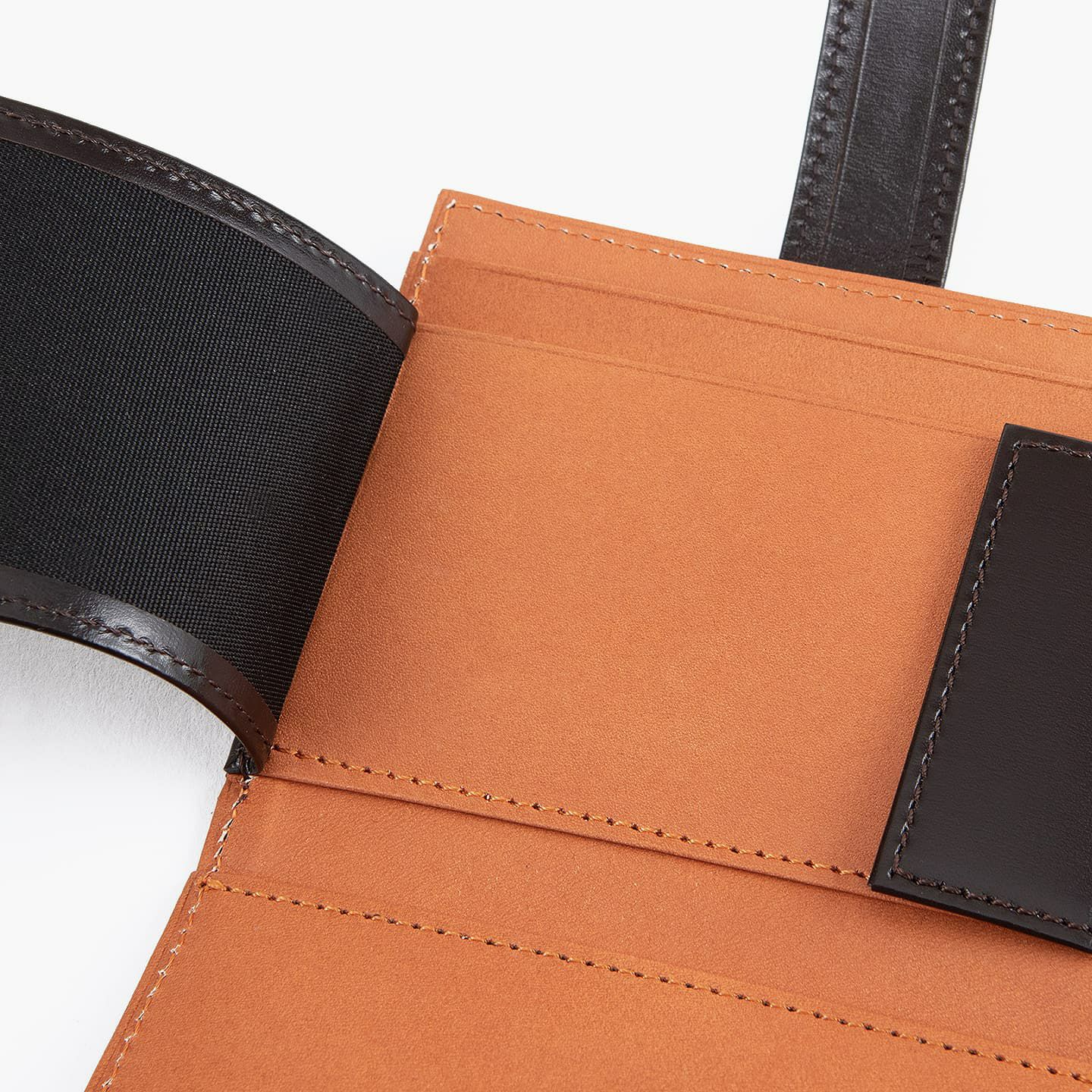 紙幣をポケット構造の札入れに収納するという既成概念を革新させ、薄くて軽い財布を追求。紙幣を押さえるベラは、紙幣を添えた後に、左右の革で押さえて挟み込みますが、短いベラを上にすることで、紙幣が動かず留められます。また、紙幣の留め方には、紙幣を折らずに真っ直ぐ押さえる方法と、紙幣を二つ折りにしてベラに引っ掛ける方法の2通りがあります。