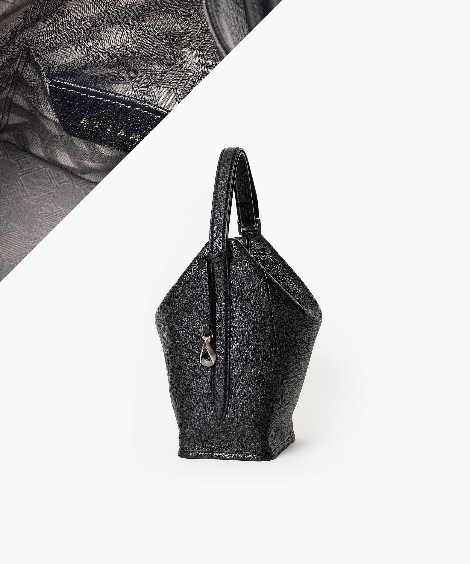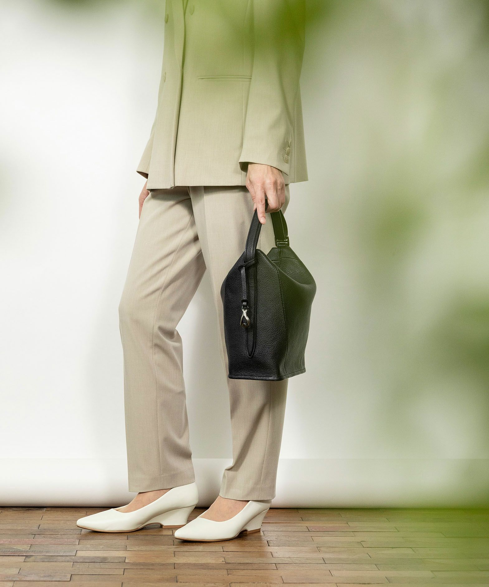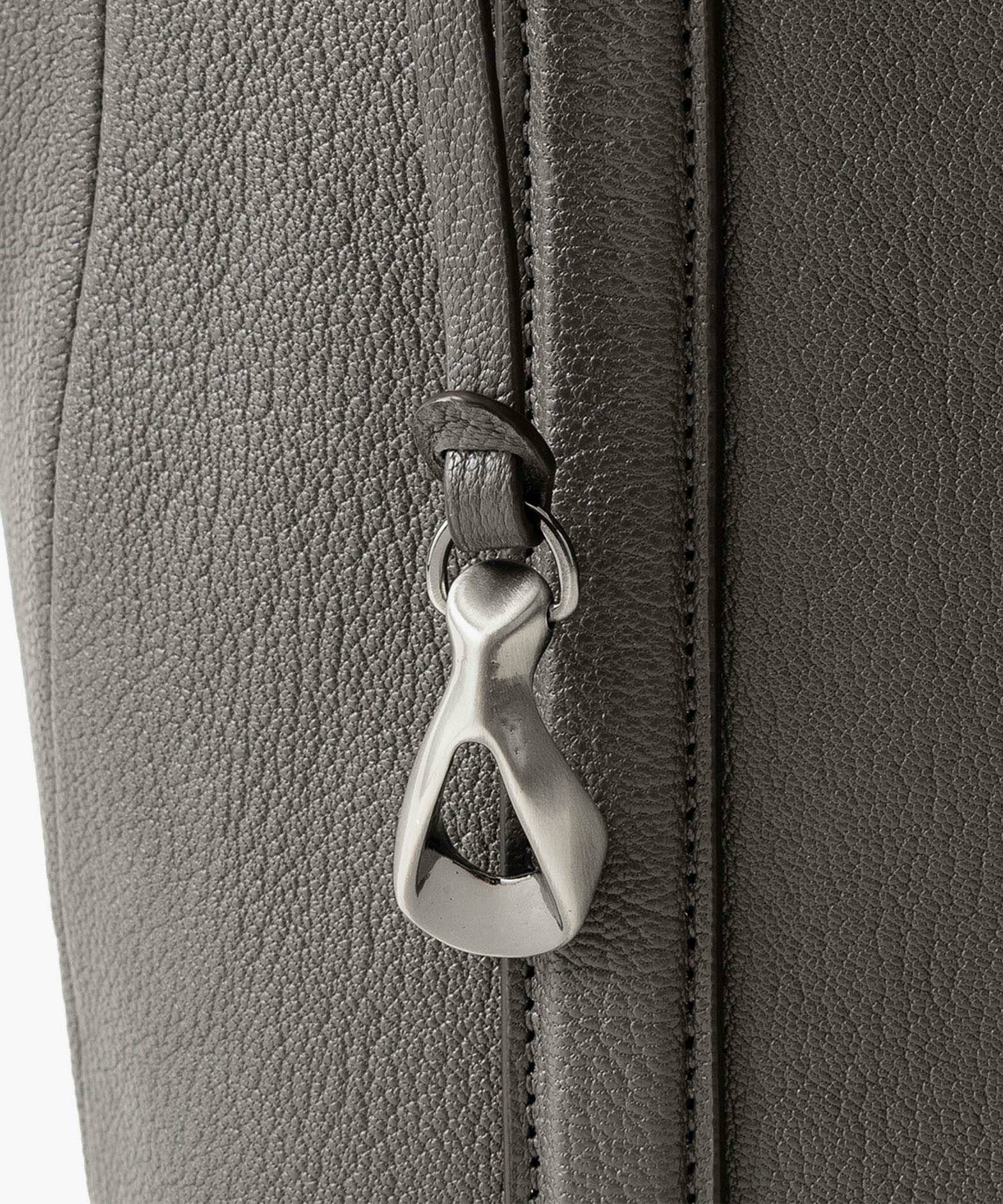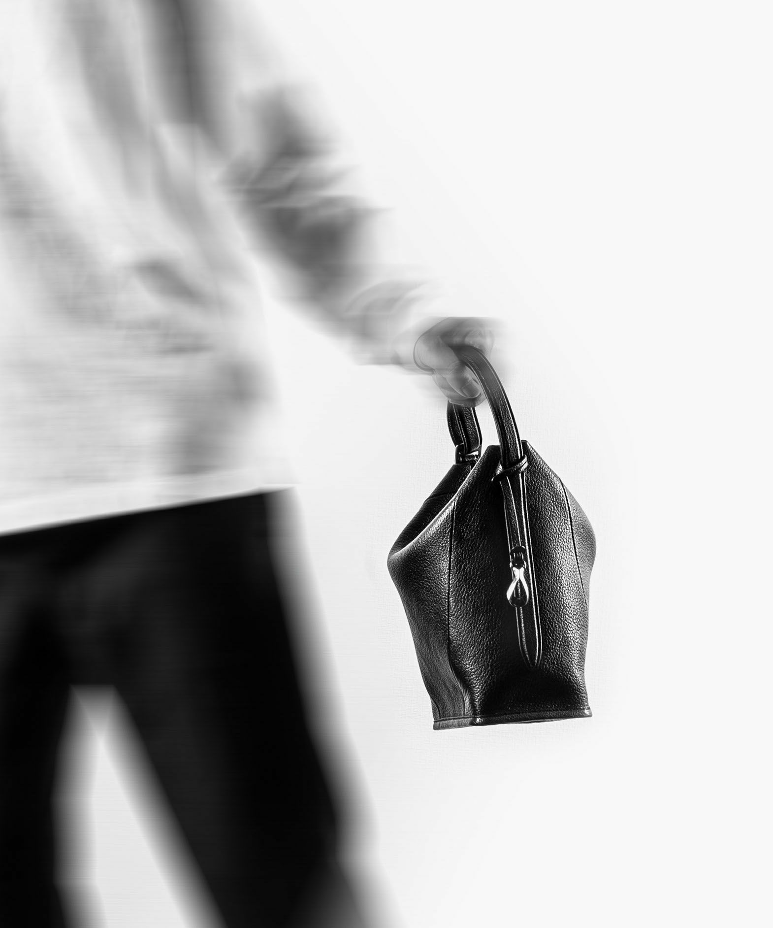 ハンドルを軽やかに手首に引っ掛けて、バッグが自分を追い掛けてくるような軽快さで持ち歩ける、スマートなハンド&バングル“Follow”。フランス・ジュリアン社製ゴードレザー「シェーブル」の外装が、美しく立体的なシボによる高級感で魅了するとともに、キズが目立ちにくく余り経年変化もせず、キレイなままラフに使えるのも魅力。海外の有名メゾンでも愛されている表情に、ETiAM特注によるセミマットを融合させ、高品位なエレガントさへと昇華。ブラックニッケルにシルバーヘアラインを施した、特別仕様のオリジナル真鍮金具は、エッジの効いたアクセントに。二重ハンドルの1本だけを伸ばして異なるフォルムも楽しめ、2つのシルエットともスタイリッシュな佇まいで、大人のこなれ感を纏わせてくれる。