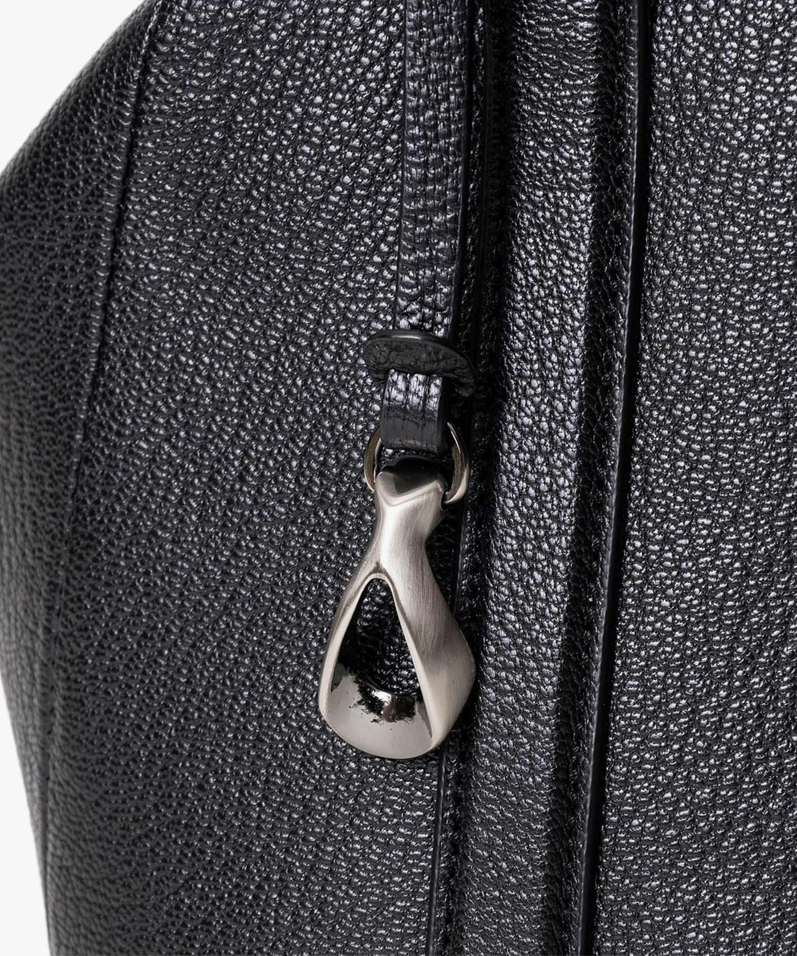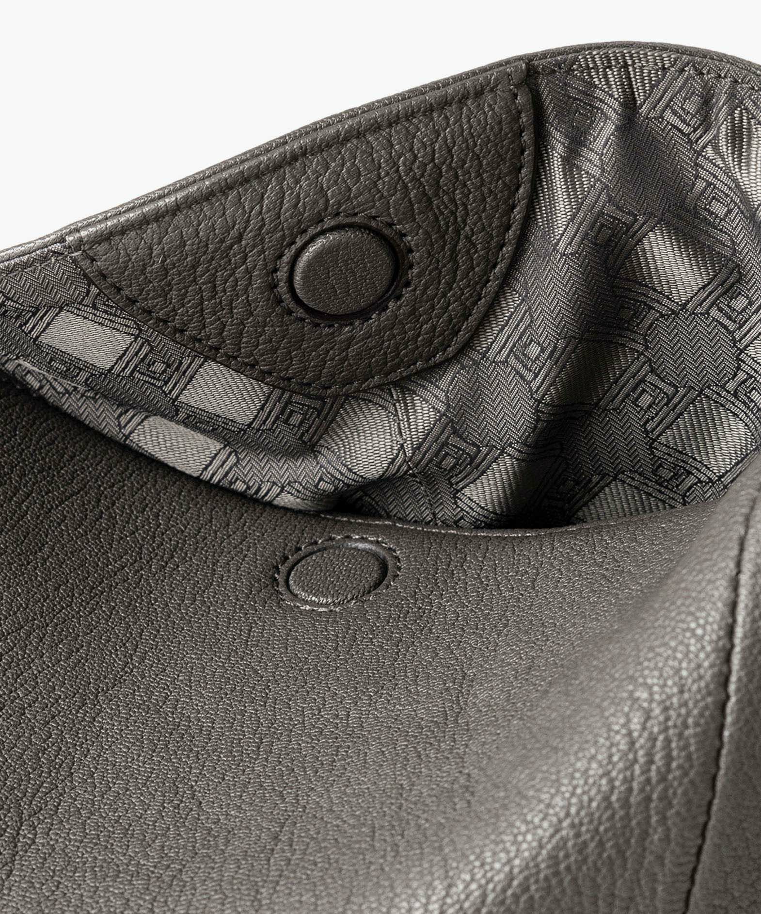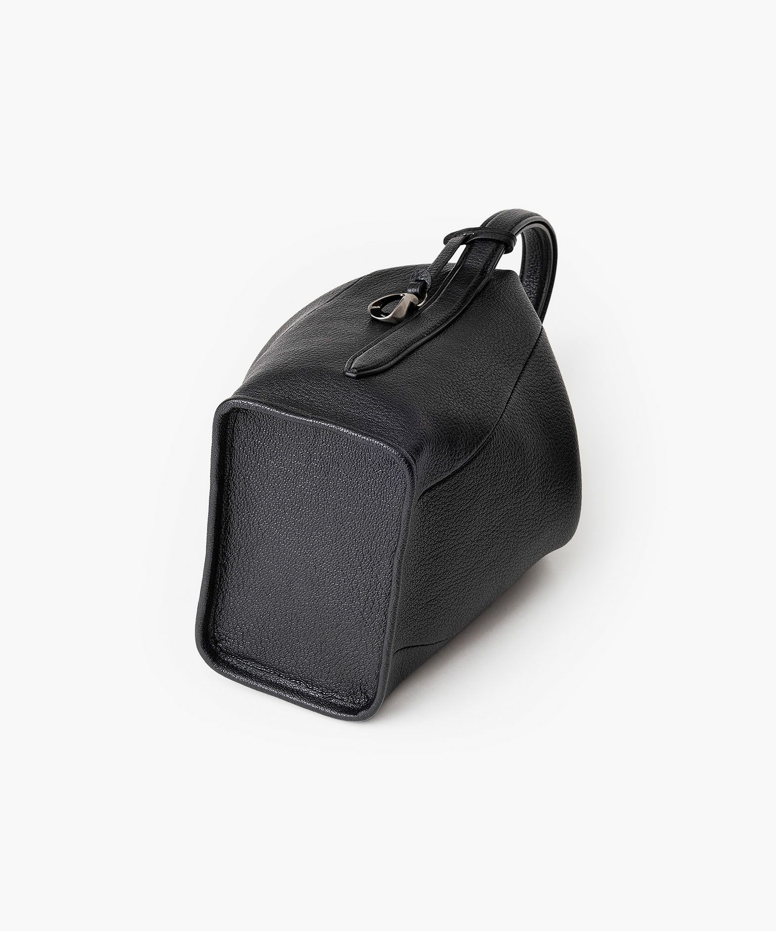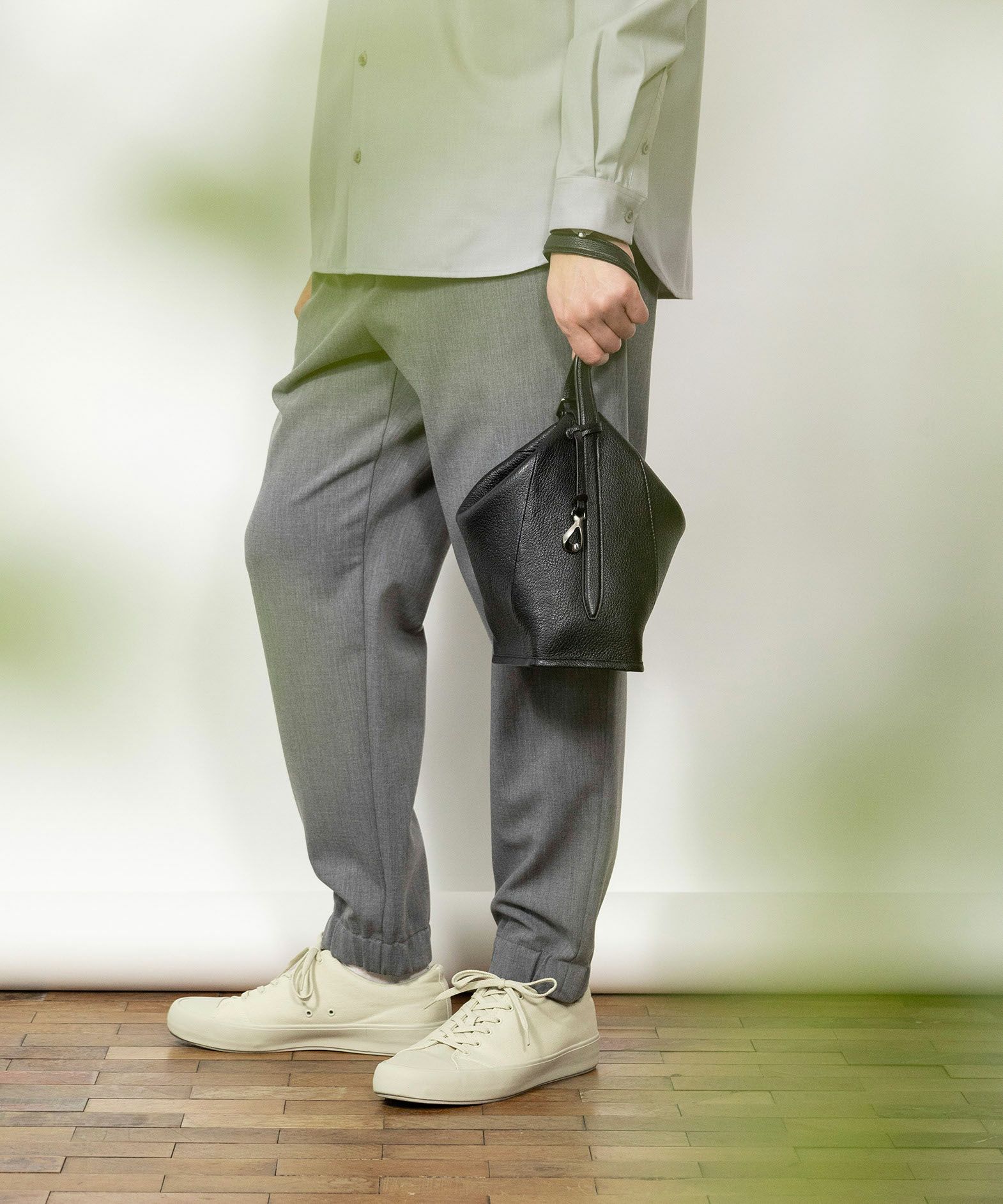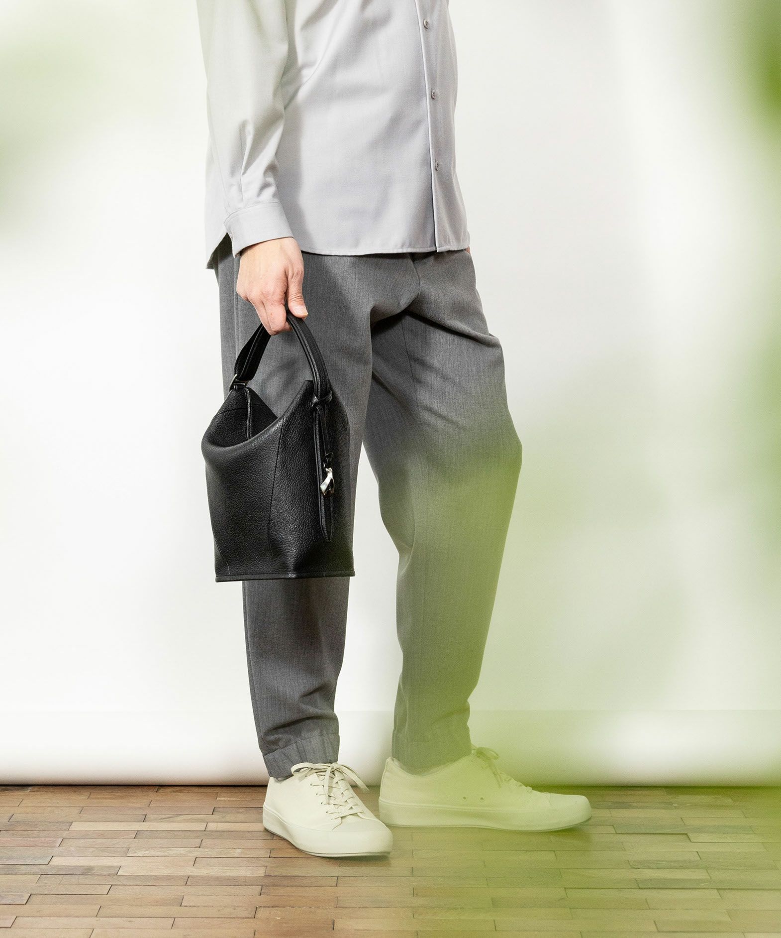 ハンドルを軽やかに手首に引っ掛けて、バッグが自分を追い掛けてくるような軽快さで持ち歩ける、スマートなハンド&バングル“Follow”。フランス・ジュリアン社製ゴードレザー「シェーブル」の外装が、美しく立体的なシボによる高級感で魅了するとともに、キズが目立ちにくく余り経年変化もせず、キレイなままラフに使えるのも魅力。海外の有名メゾンでも愛されている表情に、ETiAM特注によるセミマットを融合させ、高品位なエレガントさへと昇華。ブラックニッケルにシルバーヘアラインを施した、特別仕様のオリジナル真鍮金具は、エッジの効いたアクセントに。二重ハンドルの1本だけを伸ばして異なるフォルムも楽しめ、2つのシルエットともスタイリッシュな佇まいで、大人のこなれ感を纏わせてくれる。