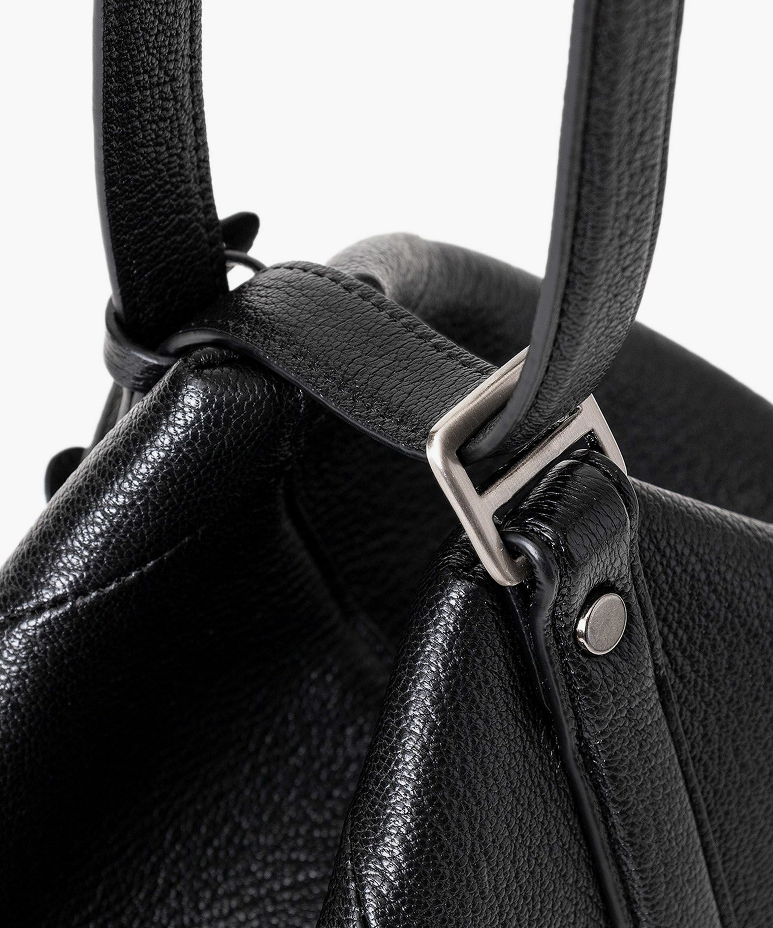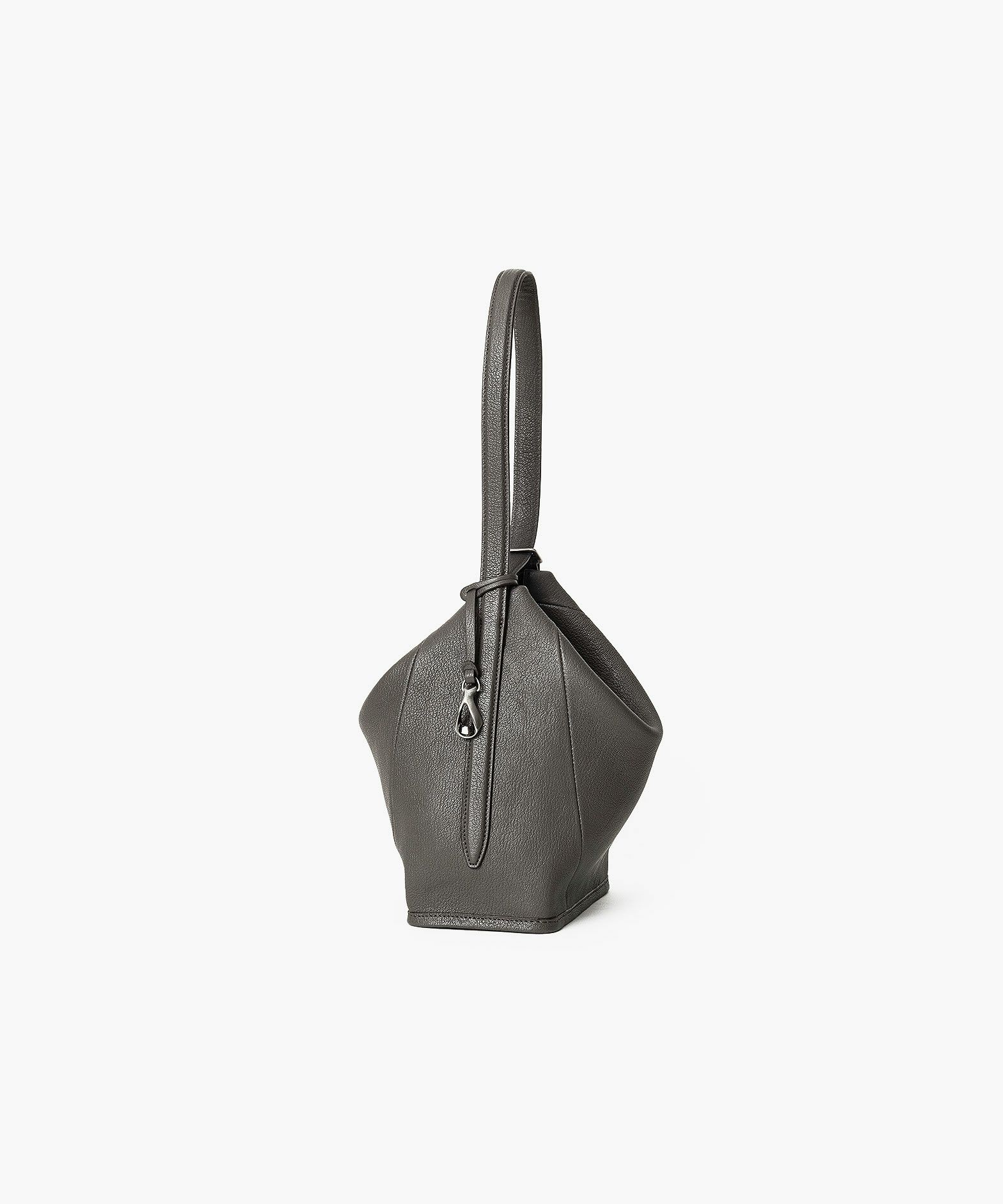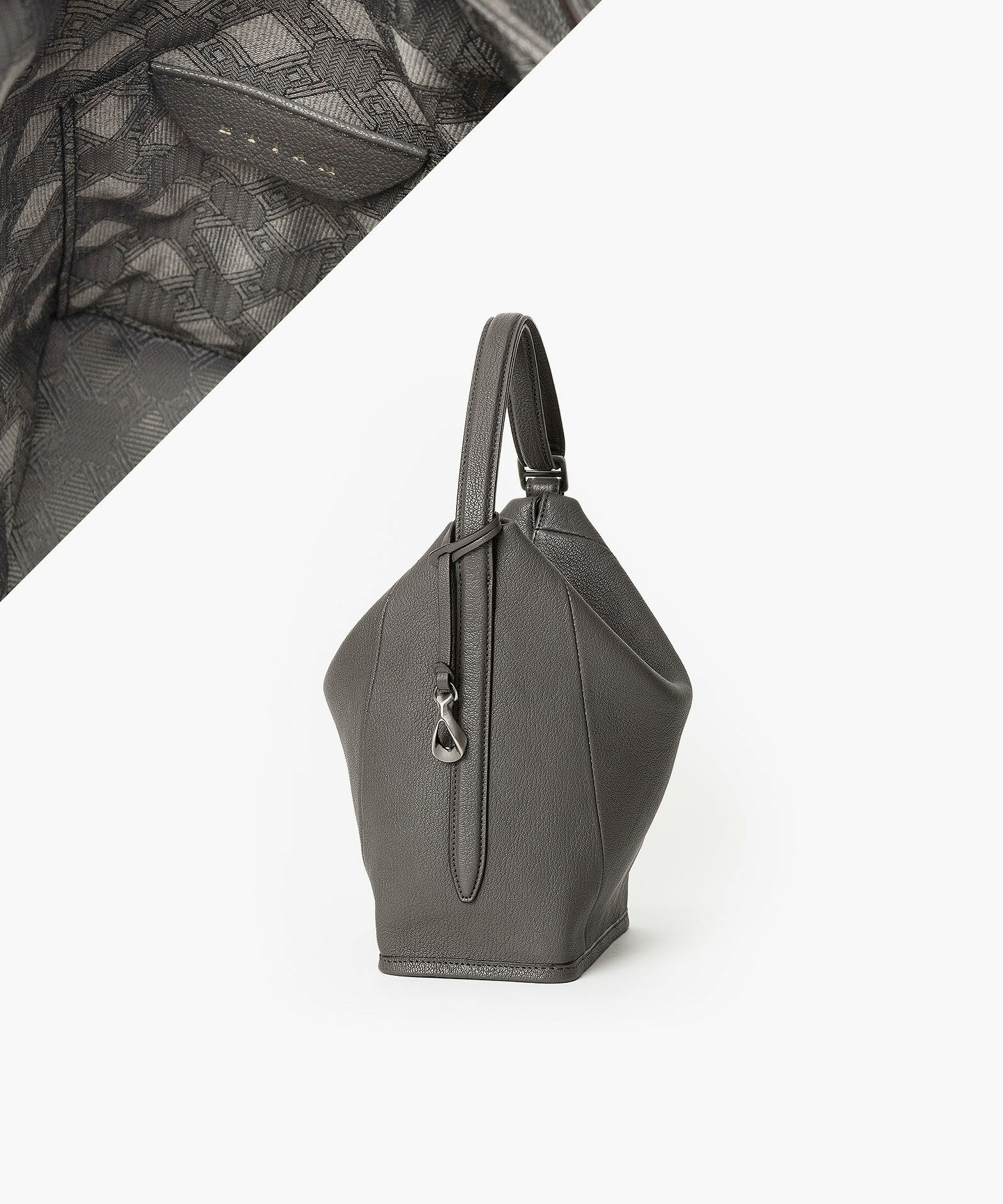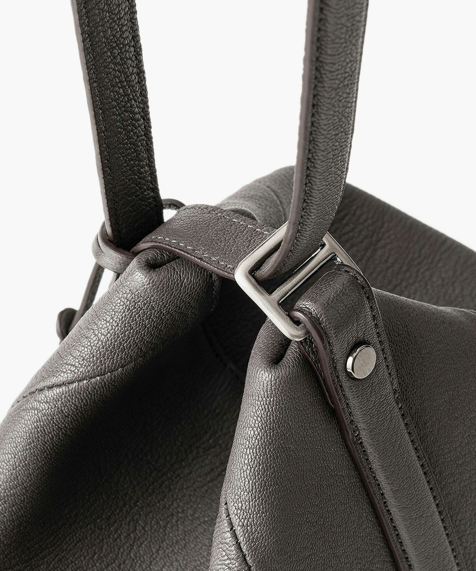 ハンドルを軽やかに手首に引っ掛けて、バッグが自分を追い掛けてくるような軽快さで持ち歩ける、スマートなハンド&バングル“Follow”。フランス・ジュリアン社製ゴードレザー「シェーブル」の外装が、美しく立体的なシボによる高級感で魅了するとともに、キズが目立ちにくく余り経年変化もせず、キレイなままラフに使えるのも魅力。海外の有名メゾンでも愛されている表情に、ETiAM特注によるセミマットを融合させ、高品位なエレガントさへと昇華。ブラックニッケルにシルバーヘアラインを施した、特別仕様のオリジナル真鍮金具は、エッジの効いたアクセントに。二重ハンドルの1本だけを伸ばして異なるフォルムも楽しめ、2つのシルエットともスタイリッシュな佇まいで、大人のこなれ感を纏わせてくれる。