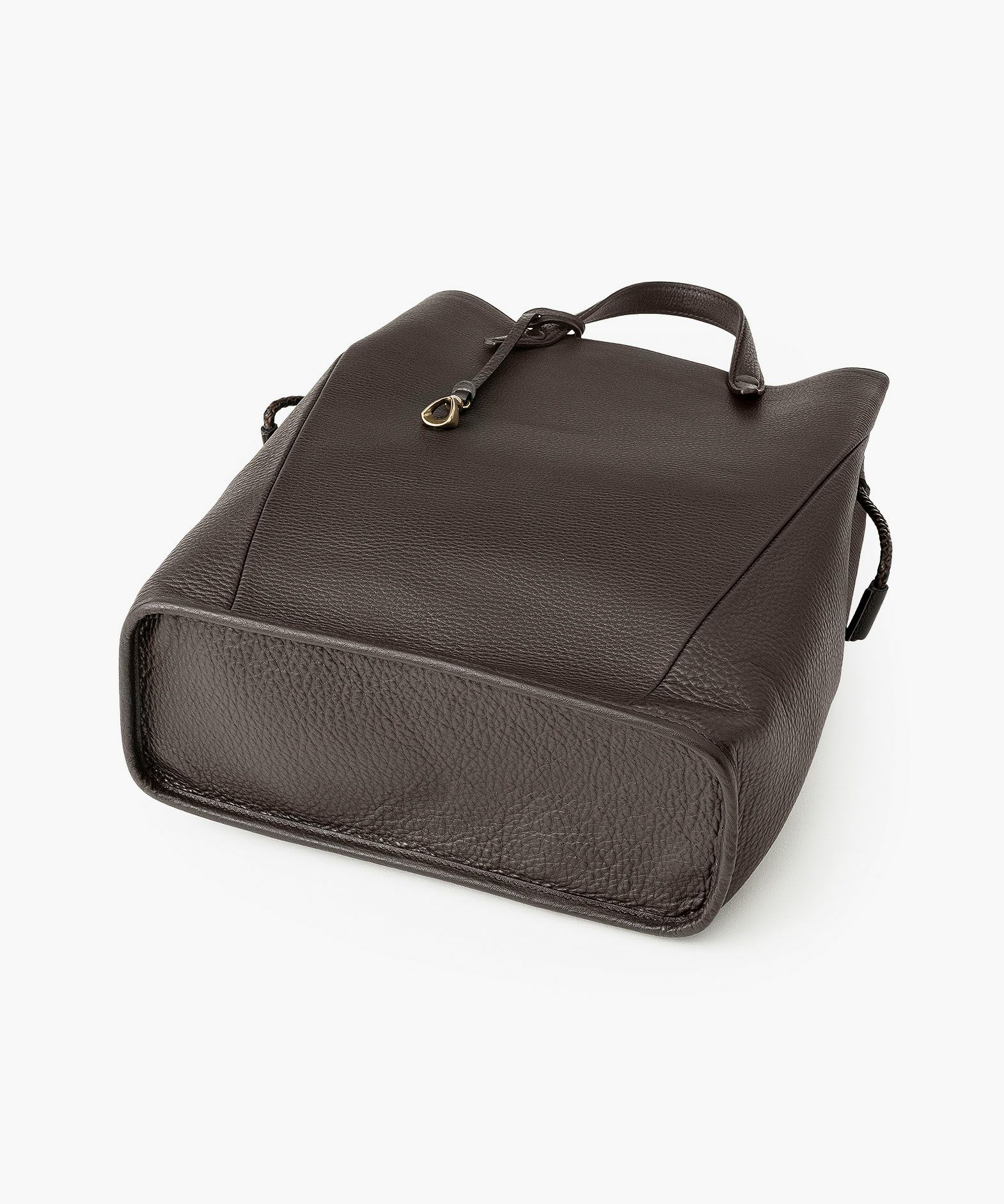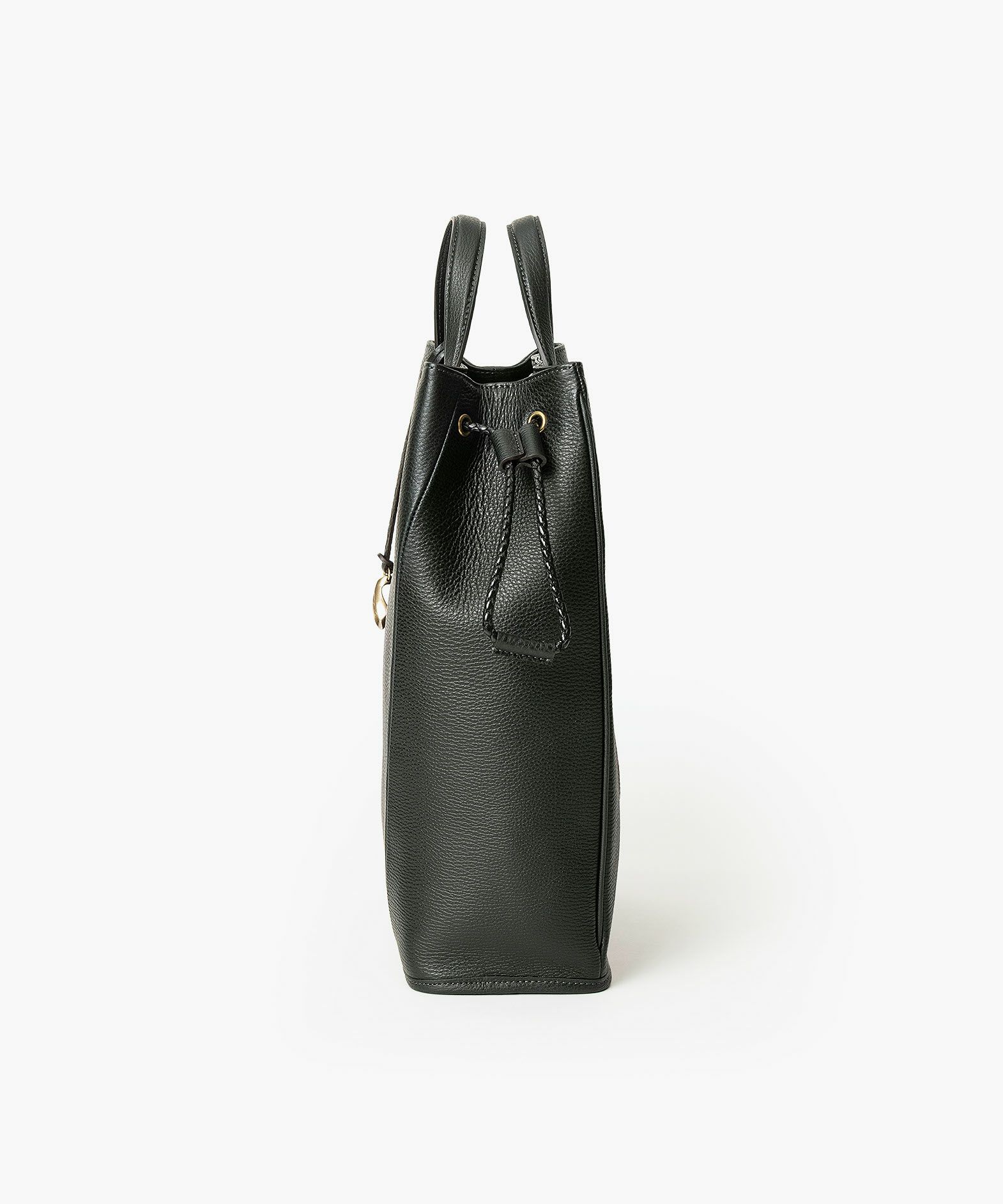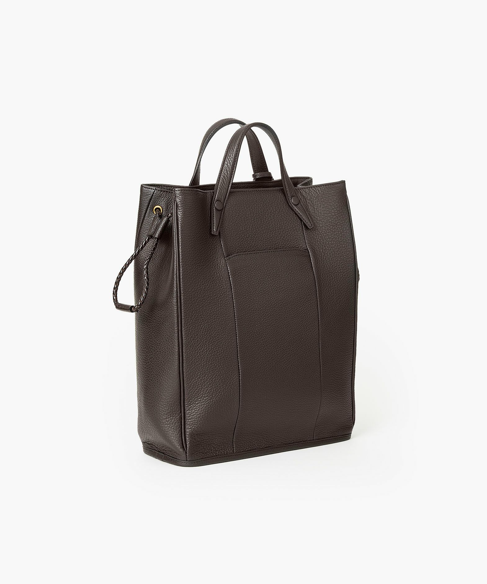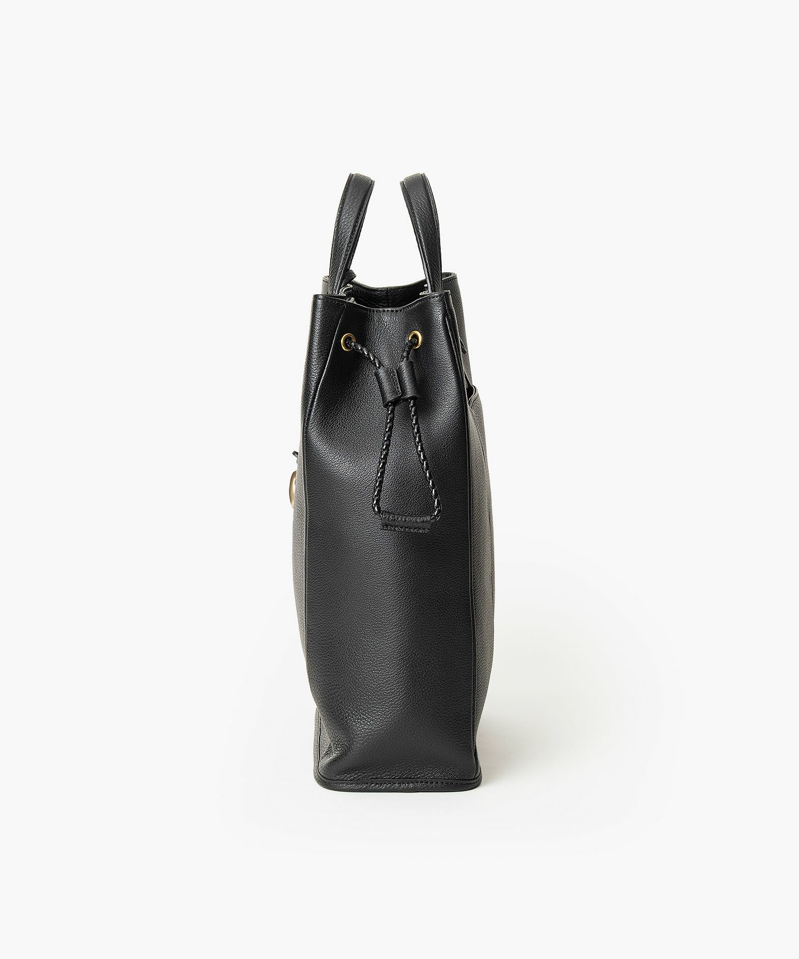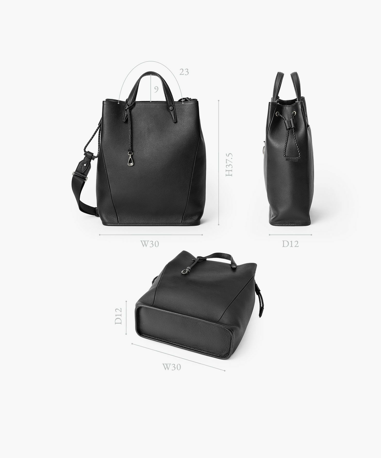 フォルムの変化に対して自然に対応しながら、しっかりとA4サイズを収納できる、ドローストリングショルダーバッグL“Inflect”。シボ感が美しい「シュリンクレザー」のボディに、マチ上部から前面下部にかけた優雅な曲線の繋ぎ目を、左右シンメトリーで設けて縦ラインを強調。巾着型のドローストリング仕様で、紐の動きが美しく絞られたマチに遊び心を添えながら、前面・背面は内装に通すことで、洗練されたスタイリュシュな佇まいへ。レザーを編み込んだような上質なポリエステル製で、先端のレザー部にショルダーベルトを接続できる設計により、軽やかでアクティブな雰囲気を演出。手持ち・手首掛け・肩掛けなど、気分や用途に合わせたスタイルで軽やかに持ち歩くことができ、洗練された印象を引き立ててくれる。