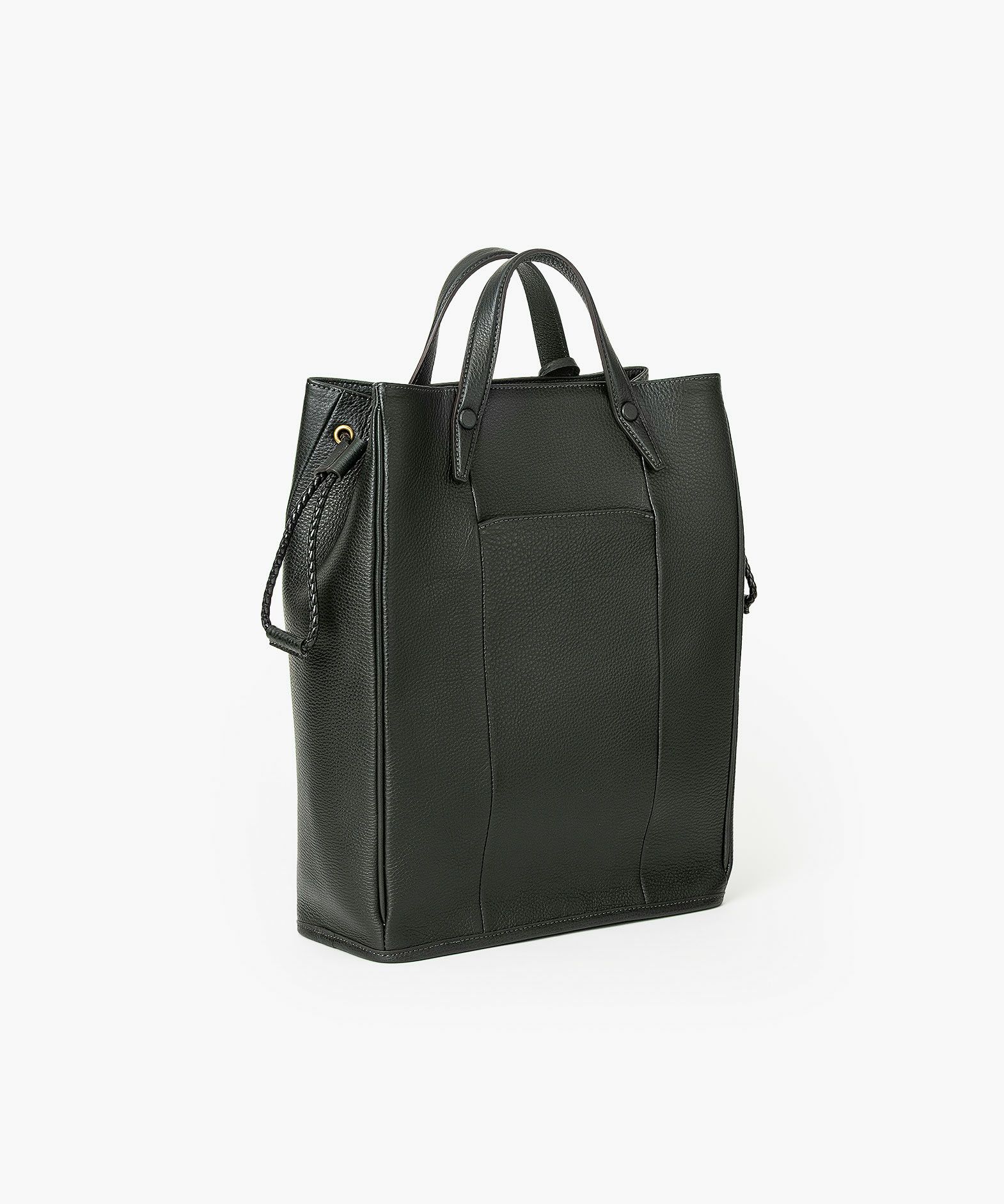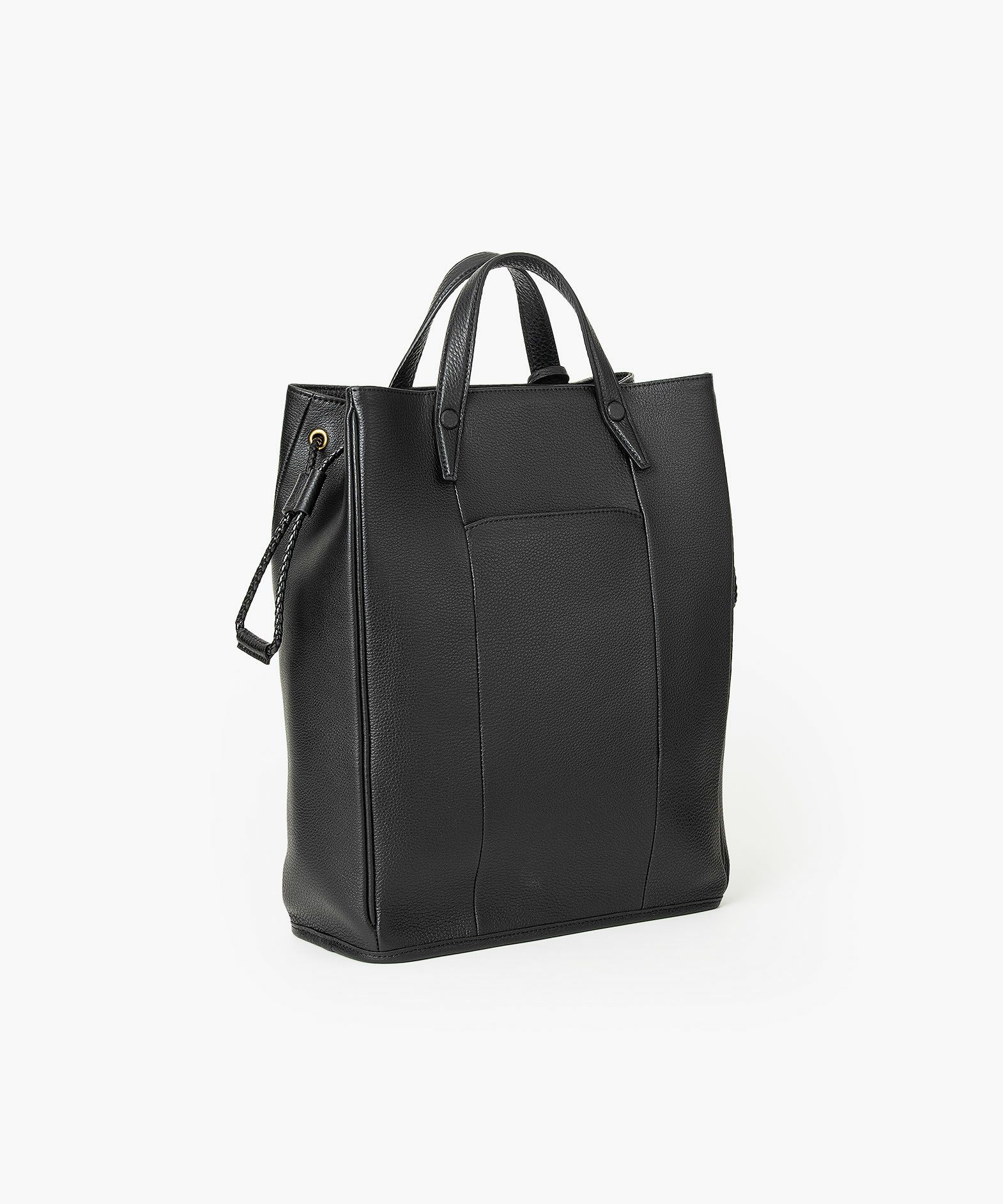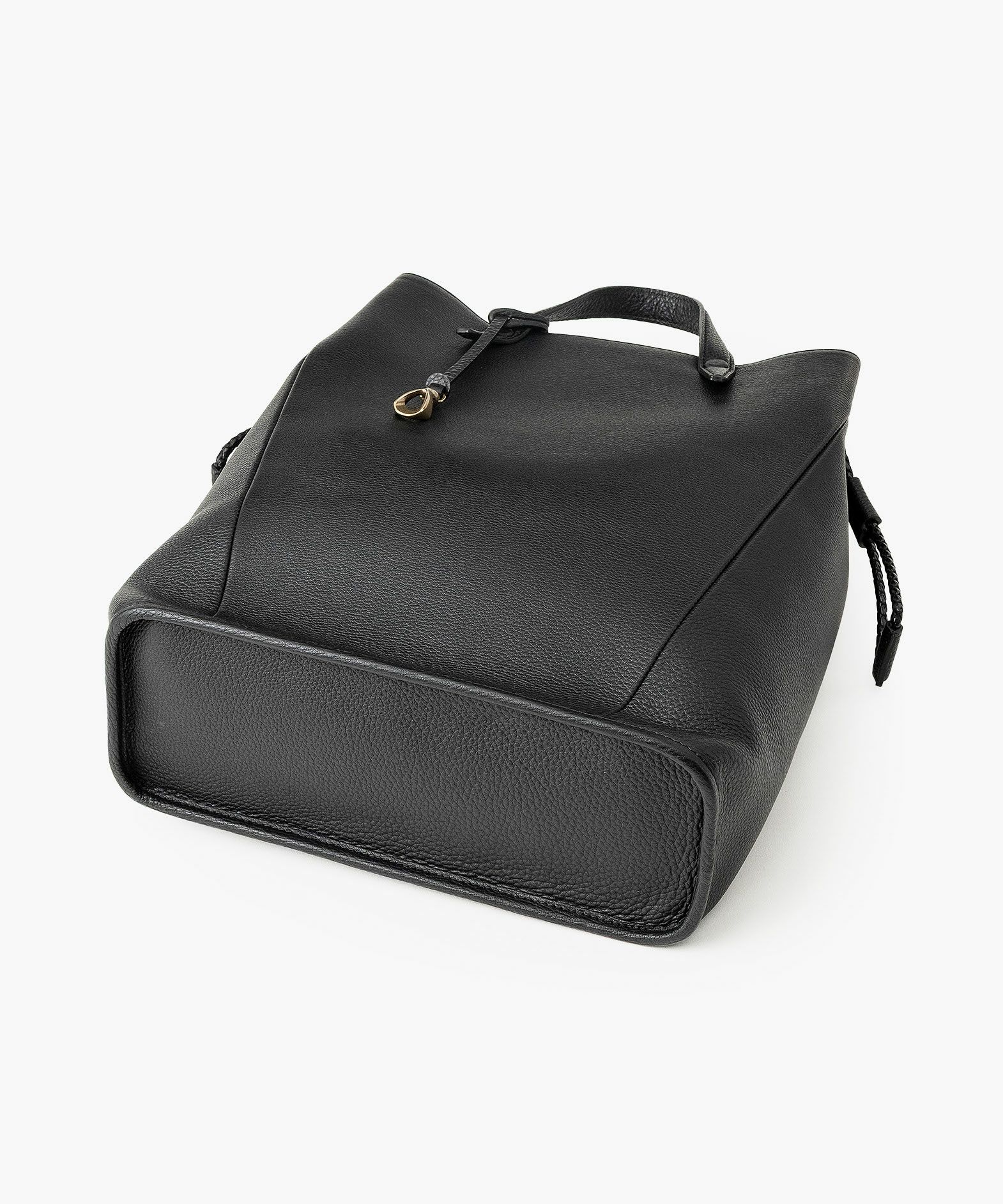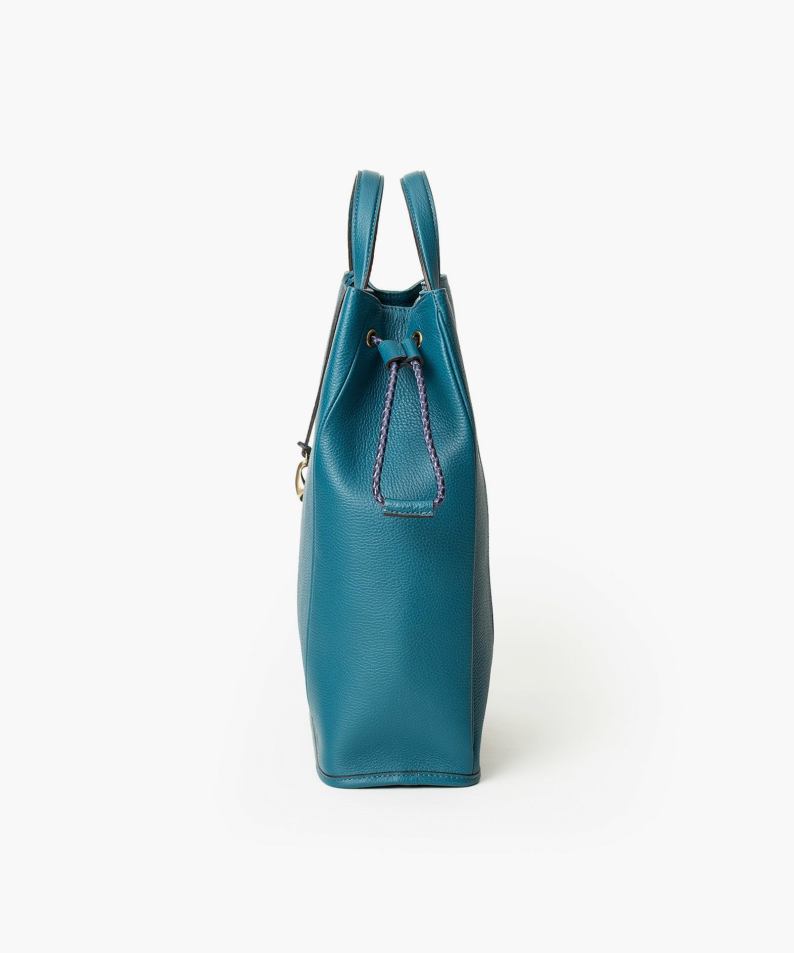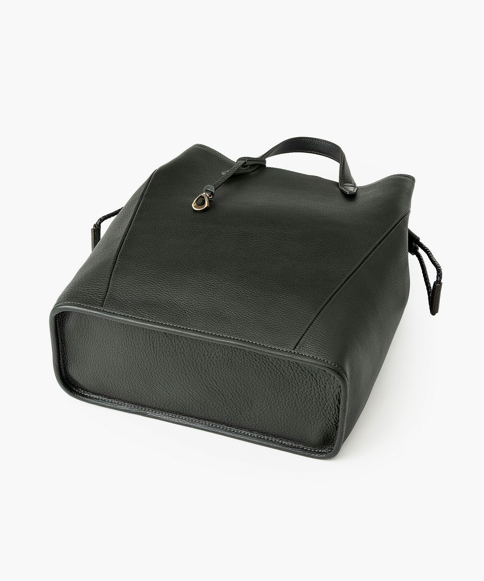 フォルムの変化に対して自然に対応しながら、しっかりとA4サイズを収納できる、ドローストリングショルダーバッグL“Inflect”。シボ感が美しい「シュリンクレザー」のボディに、マチ上部から前面下部にかけた優雅な曲線の繋ぎ目を、左右シンメトリーで設けて縦ラインを強調。巾着型のドローストリング仕様で、紐の動きが美しく絞られたマチに遊び心を添えながら、前面・背面は内装に通すことで、洗練されたスタイリュシュな佇まいへ。レザーを編み込んだような上質なポリエステル製で、先端のレザー部にショルダーベルトを接続できる設計により、軽やかでアクティブな雰囲気を演出。手持ち・手首掛け・肩掛けなど、気分や用途に合わせたスタイルで軽やかに持ち歩くことができ、洗練された印象を引き立ててくれる。