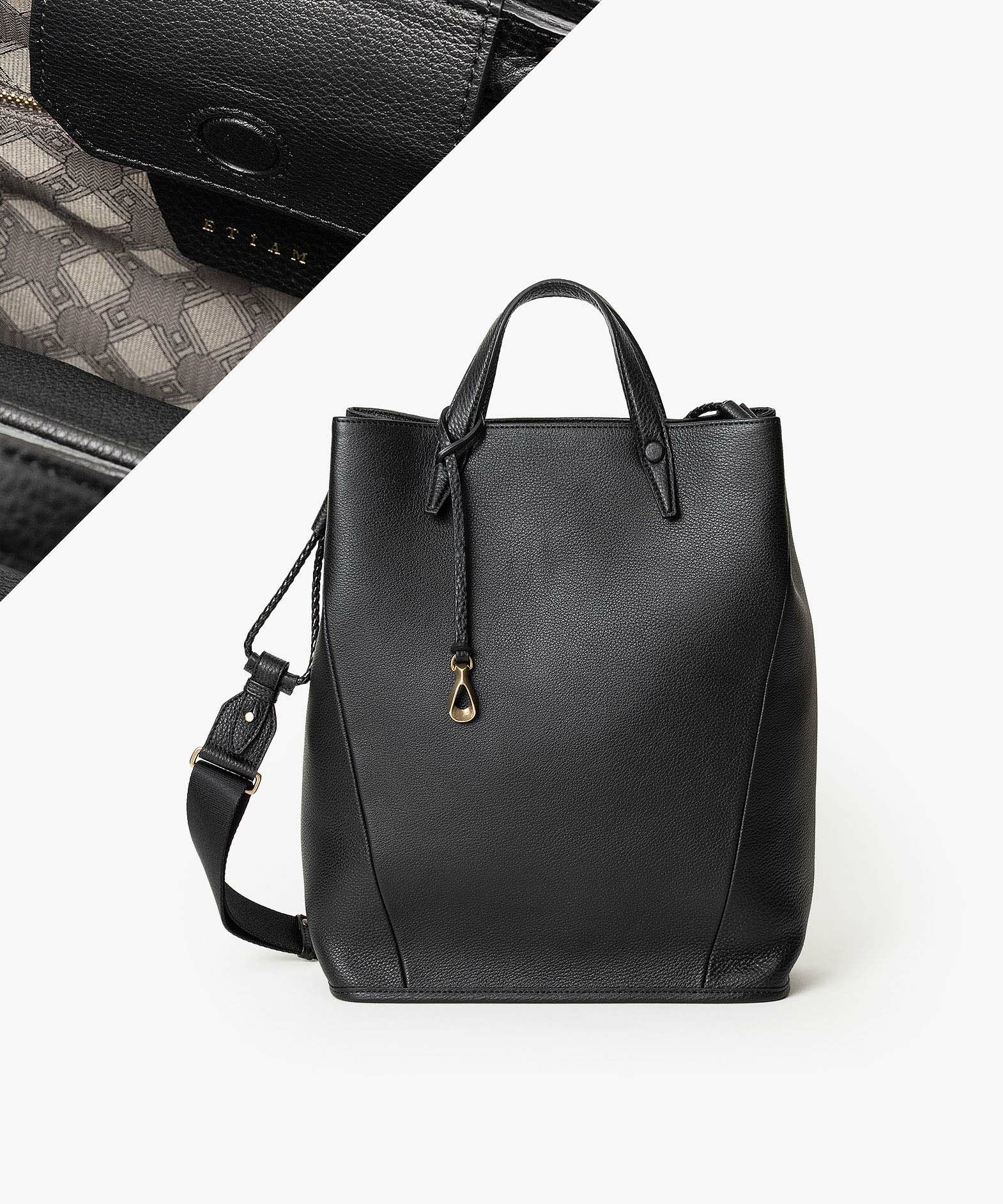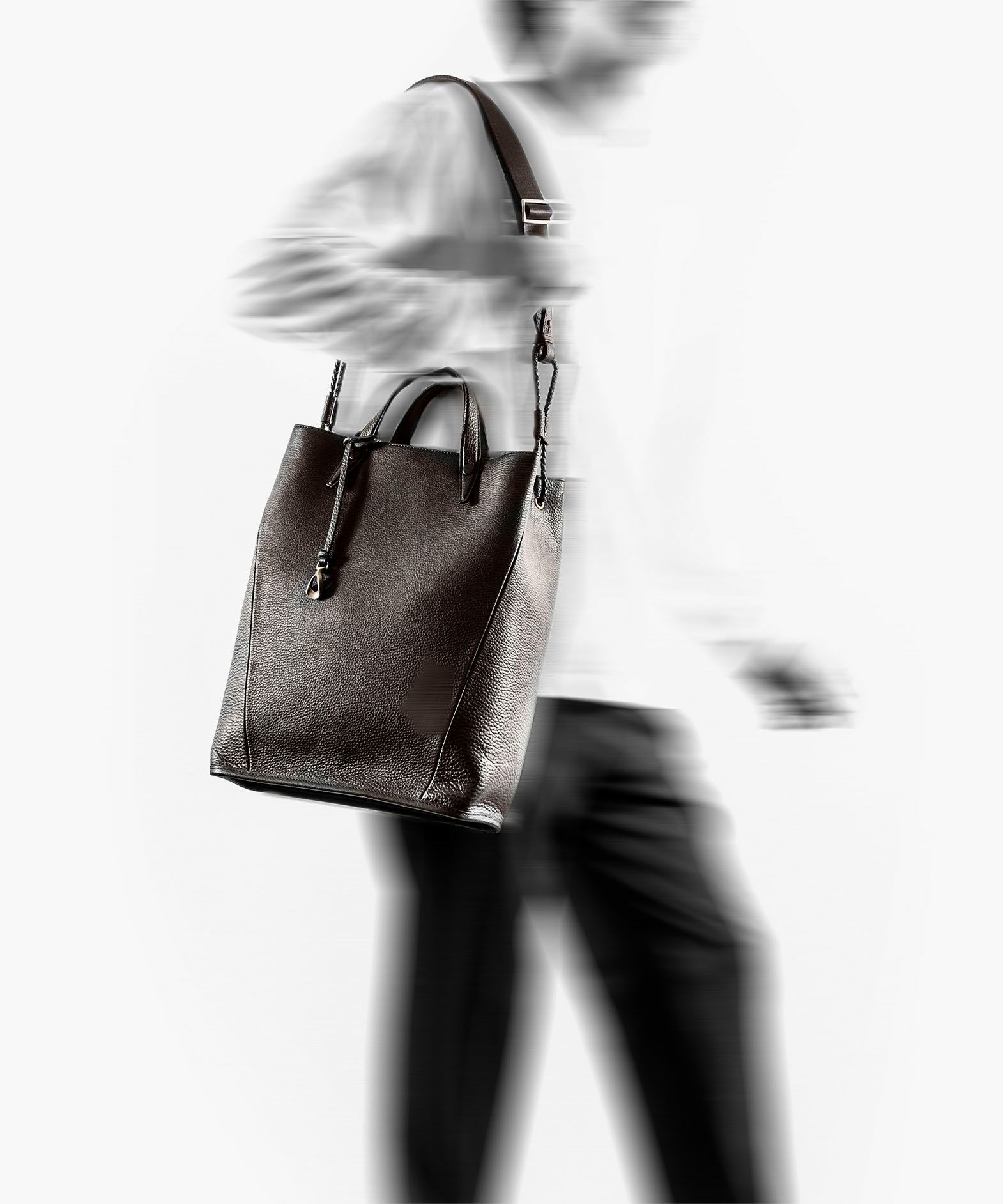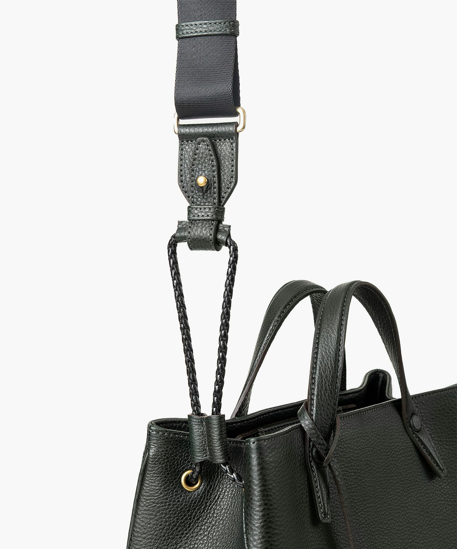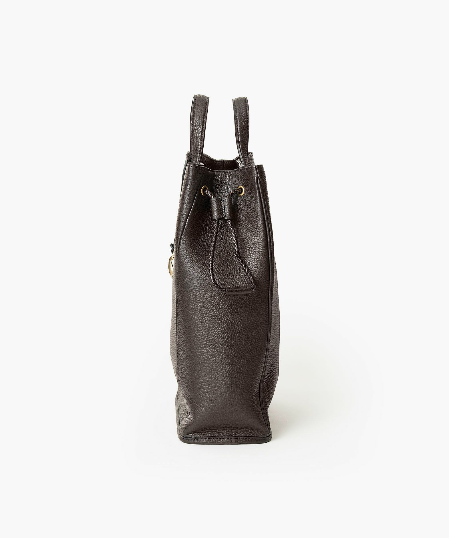 フォルムの変化に対して自然に対応しながら、しっかりとA4サイズを収納できる、ドローストリングショルダーバッグL“Inflect”。シボ感が美しい「シュリンクレザー」のボディに、マチ上部から前面下部にかけた優雅な曲線の繋ぎ目を、左右シンメトリーで設けて縦ラインを強調。巾着型のドローストリング仕様で、紐の動きが美しく絞られたマチに遊び心を添えながら、前面・背面は内装に通すことで、洗練されたスタイリュシュな佇まいへ。レザーを編み込んだような上質なポリエステル製で、先端のレザー部にショルダーベルトを接続できる設計により、軽やかでアクティブな雰囲気を演出。手持ち・手首掛け・肩掛けなど、気分や用途に合わせたスタイルで軽やかに持ち歩くことができ、洗練された印象を引き立ててくれる。