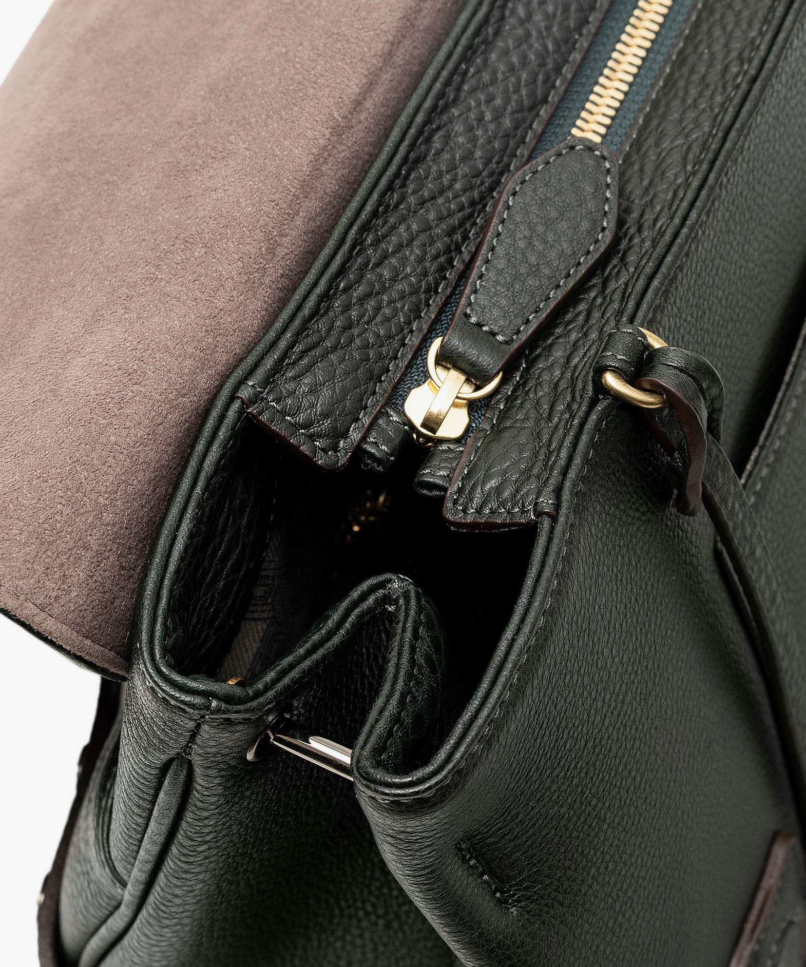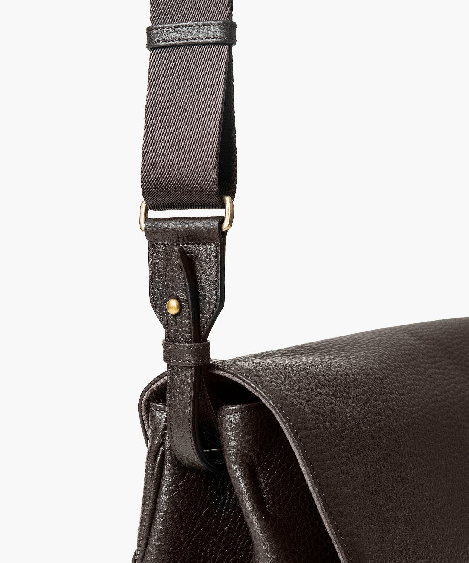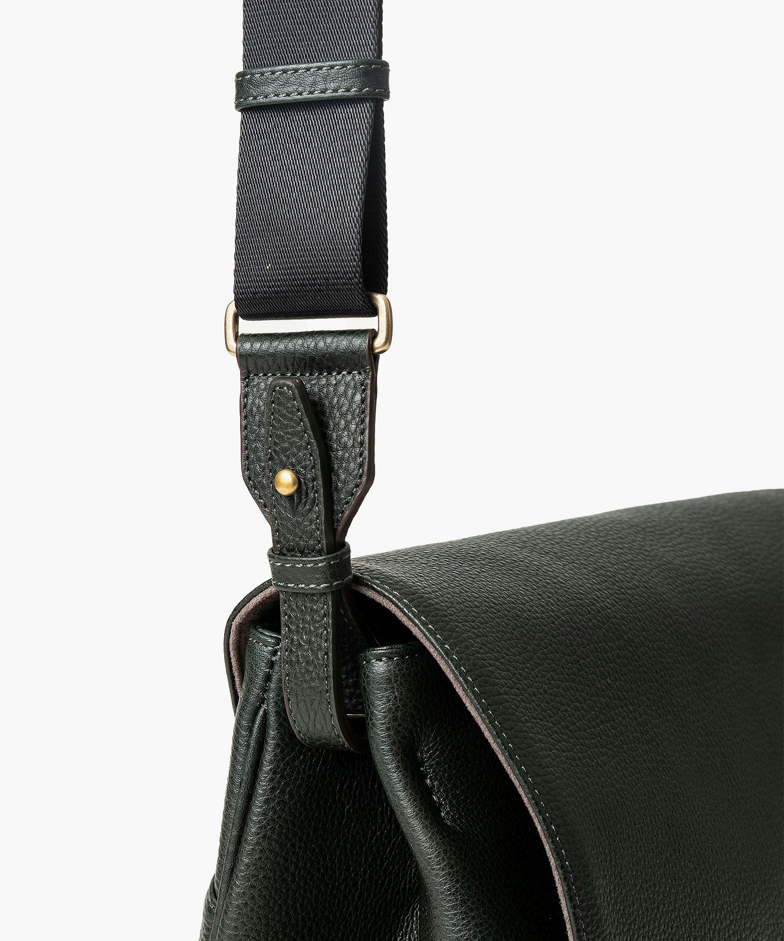 前向きにオン・オフをサポートする、フラップショルダーバッグ。