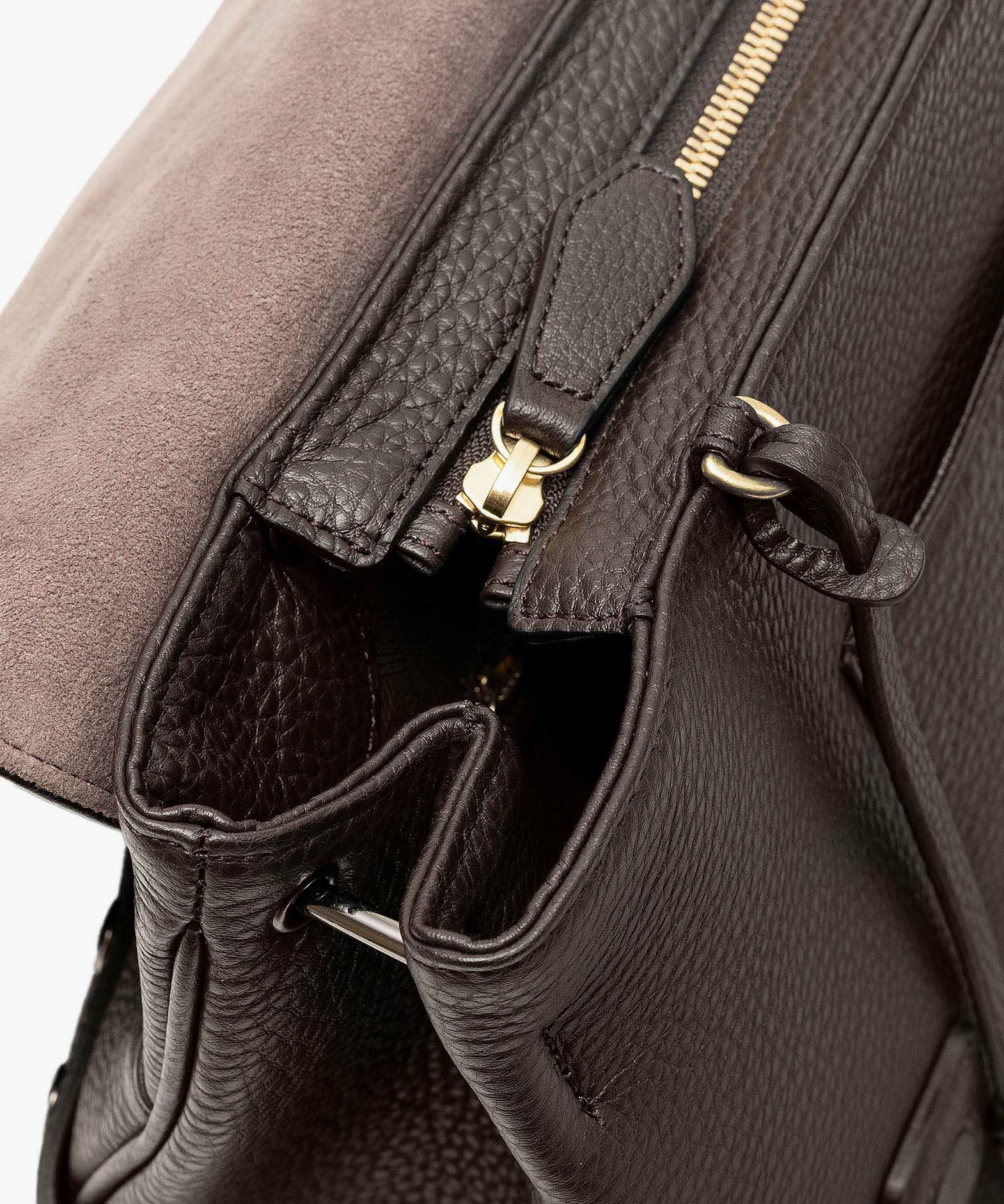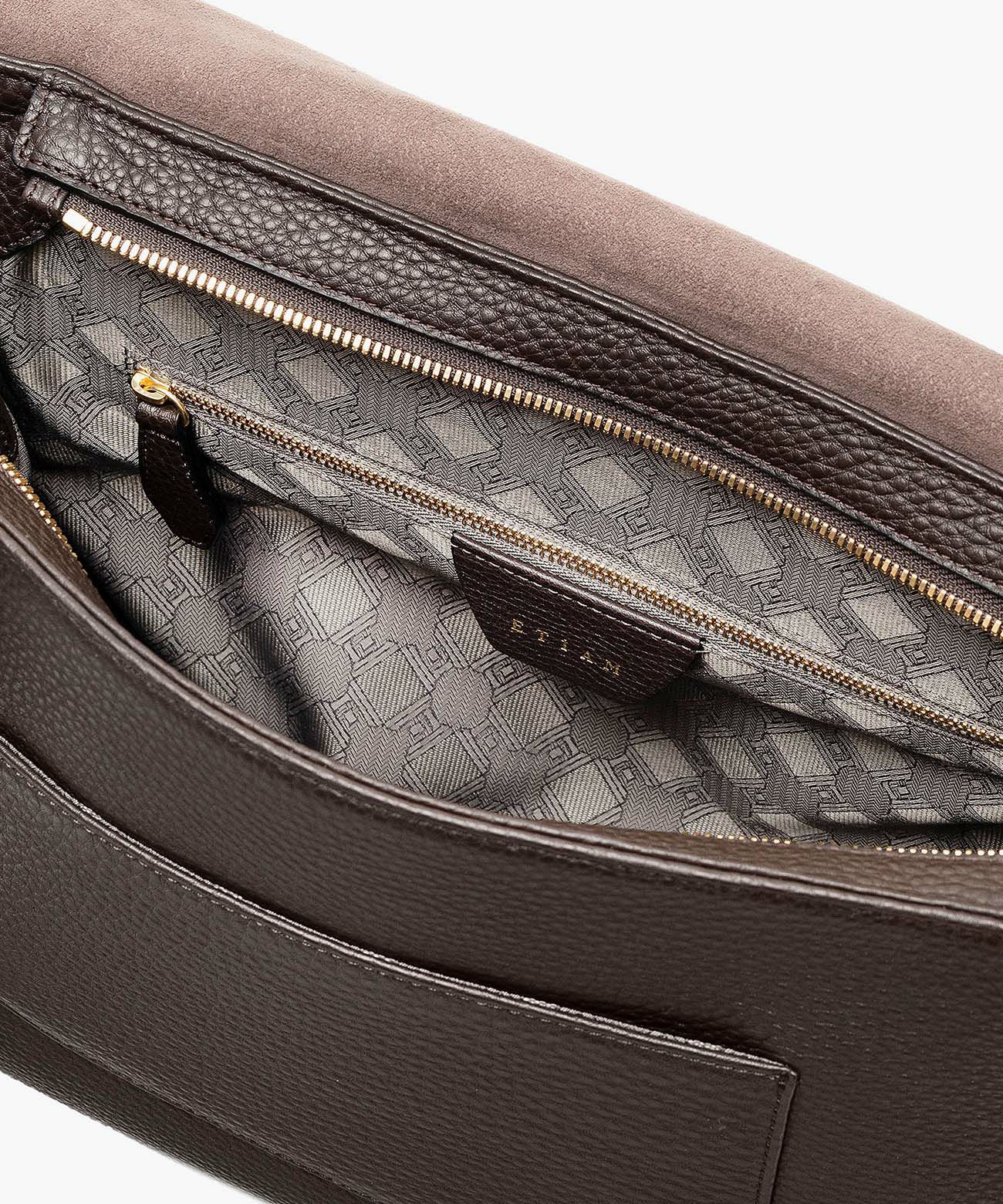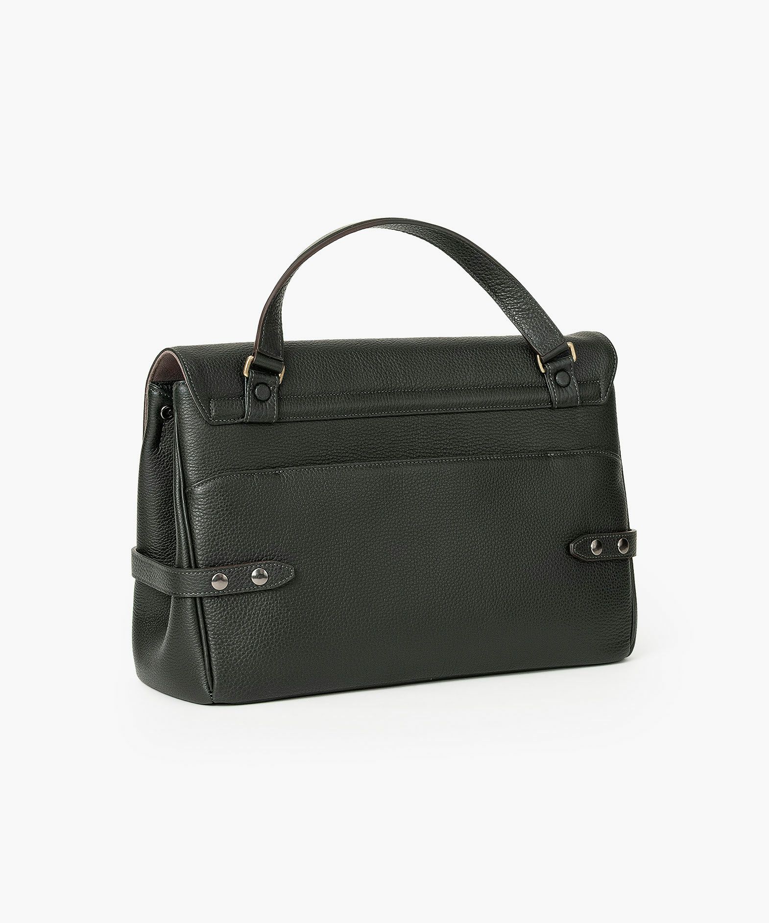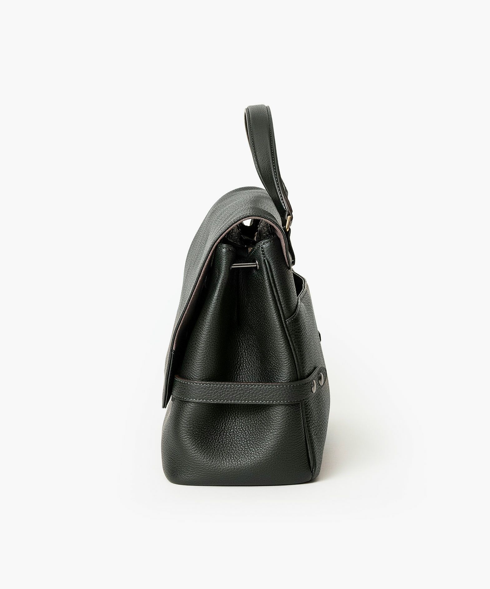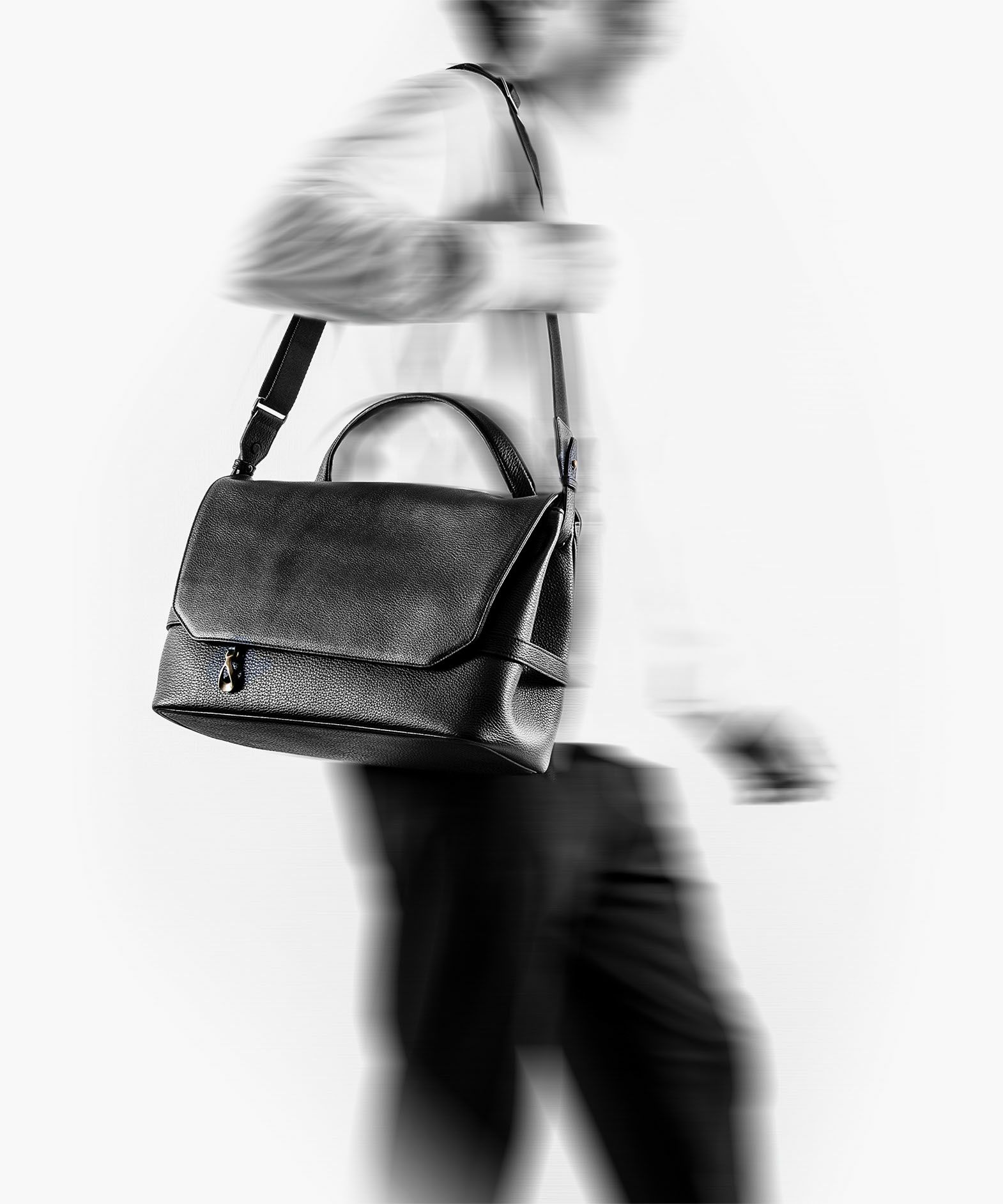 スマートな収納力とスタイリッシュな上質感で、進化し続けるビジネススタイルを前向きにサポートする、フラップショルダーバッグ“Forward”。多様化するスタイルにも合わせやすい機能性と柔軟性を併せ持ち、オン・オフ問わずフィットする使い心地も魅力。クラシックなデザインのフラップは、マグネット開閉式で使いやすく、柔らかく仕上げられた「シュリンクレザー」により軽やかな印象を演出。マチの上部に取り付けているショルダーベルトの接続金具には、ブラックニッケルメッキを施したオリジナル真鍮を採用し、ベルトを外しているときでも洗練された佇まいへ。高く広めに設計されたハンドルは、手持ちだけでなく肩掛けもでき、ショルダーベルトとの3WAYを優雅に使いこなせる楽しさをもたらしてくれる。