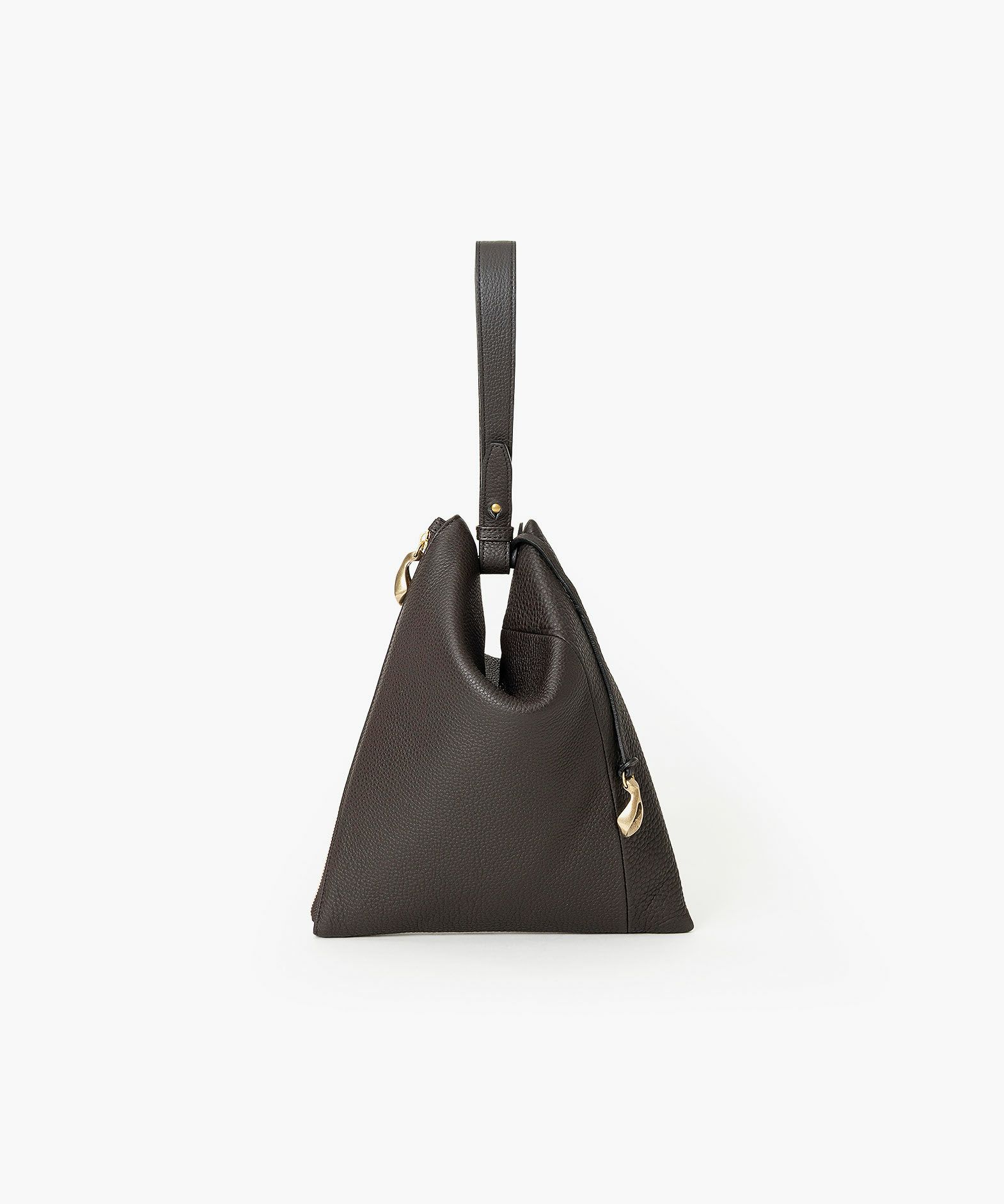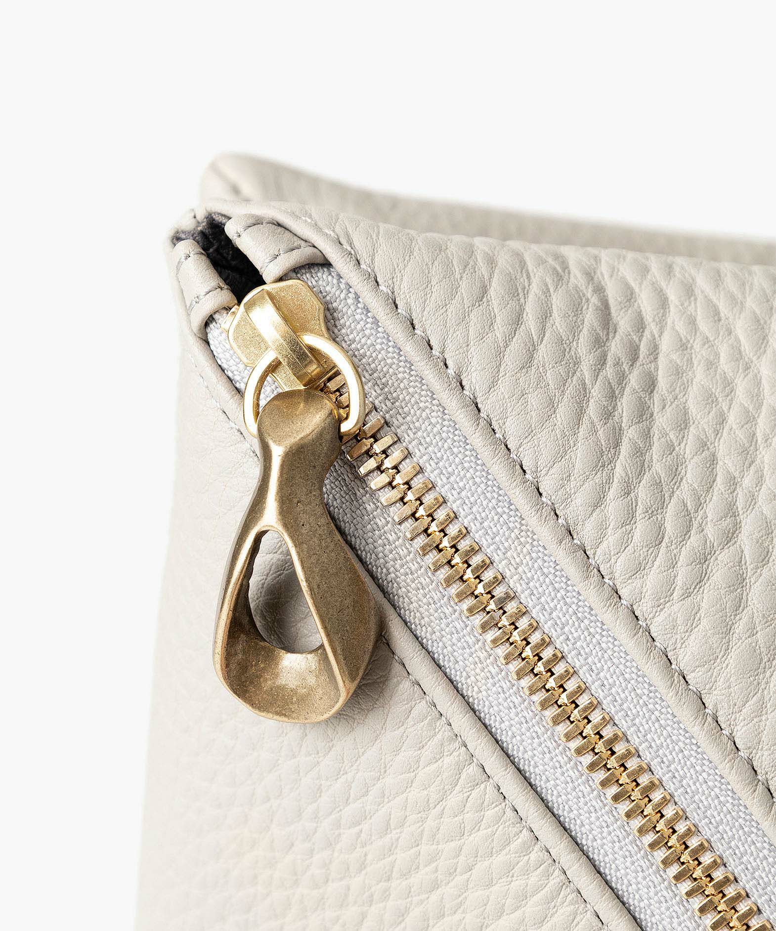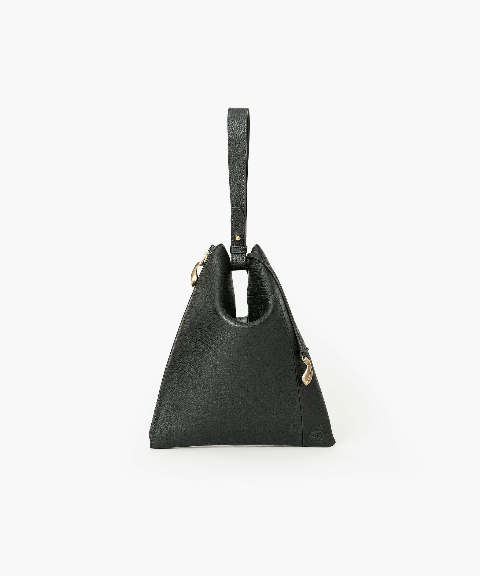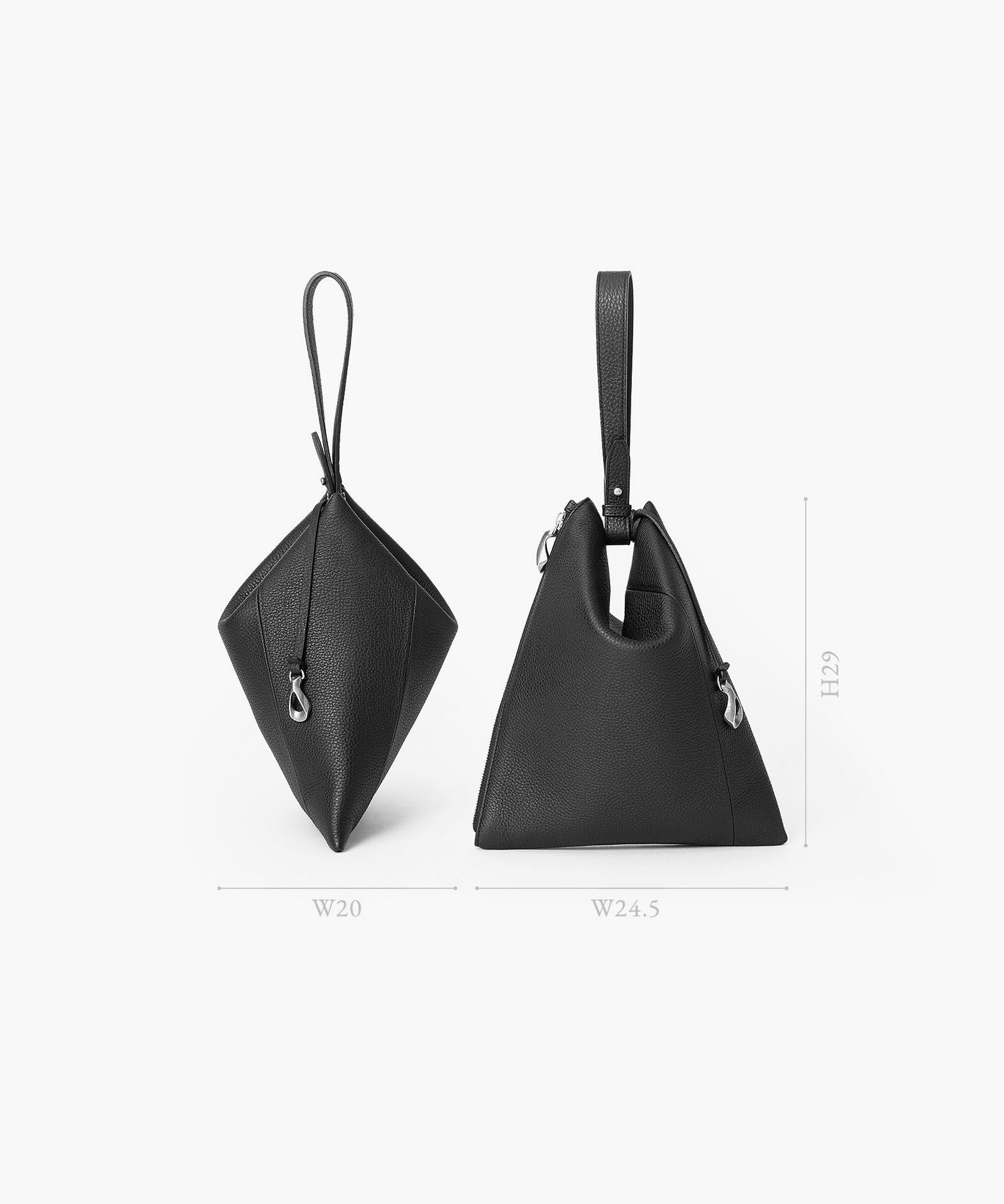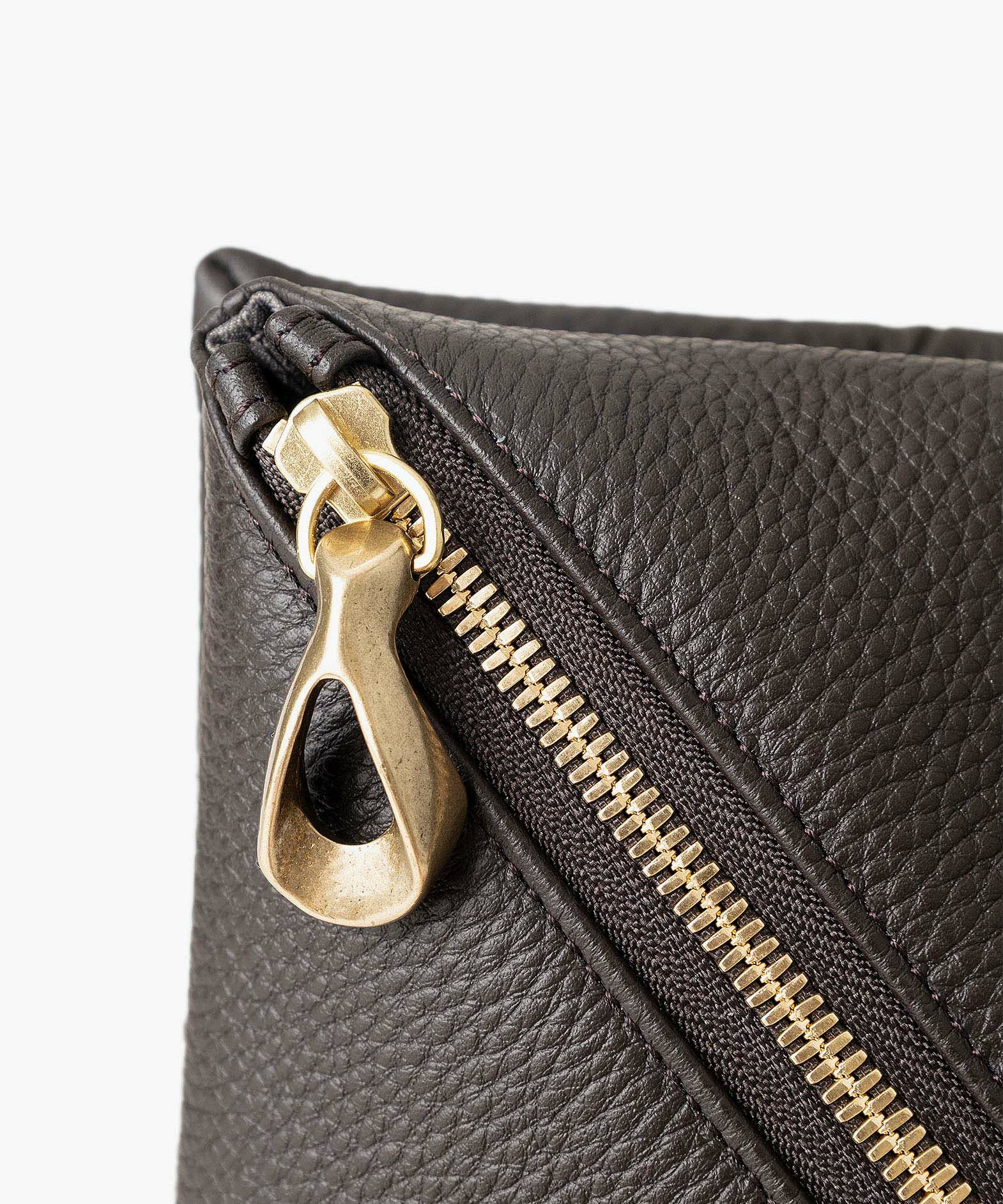 光を分散・屈折させて生まれる多彩な色を放つ光線のように、何気ない日常に鮮やかな色彩の輝きを添えてくれる、ユニセックスなデザインのトライアングルポーチ“Prism”。シボ感が美しい「シュリンクレザー」のボディとストラップを繋ぐ上部のオリジナル金具により、たわみが美しい巾着のようなシルエットを創り出し、トライアングルを想わせる洗練されたフォルムを実現。ハギ(繋ぎ目)は、前面センターではなく、あえて両サイド斜めに設けることで、上部の三角形を生かした菱形のエレガントな印象へ。また、下部を内側に折り畳んで平たくコンパクトにでき、かさばらずにバッグやスーツケースに収納することも。軽やかなシャープさが、普段使いだけでなく、旅先や出張先などでもスマートに活躍してくれる。