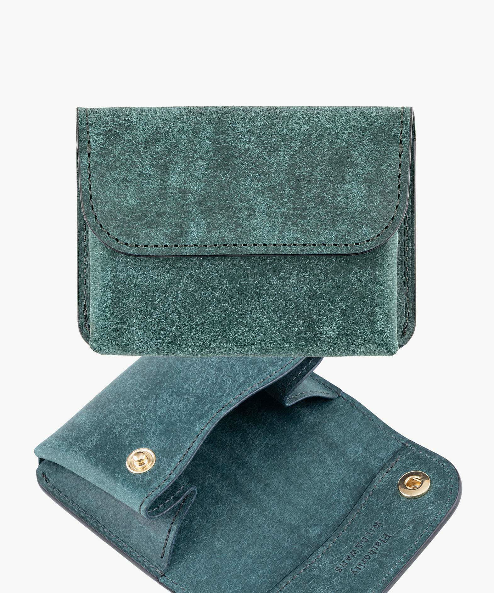 FlathorityとWILD SWANSの手によって生まれたフラップ付きコンパクトケースは、ミニマルな見た目ながら、日常使いにちょうどいい実用性を備えたレザーアイテムです。メインのフラップポケットにはカードや折り畳んだ紙幣、小銭をまとめて収納でき、背面にはカード専用ポケットを装備。極小財布としても活躍するつくりで、他のアイテムと組み合わせても無理のないサイズ感に仕上げられています。素材には、イタリア・バダラッシィ・カルロ社による高級レザー「プエブロ」を採用。和紙のように起毛された独特の風合いは使い始めはざらつきがありながら、使い込むうちにオイルが馴染み、自然な艶と深みが現れる豊かな経年変化を楽しめます。Gray、Green、Ortensia、Camelの4色展開。飾りすぎず、それでいて革の魅力を確かに感じさせてくれる佇まいは、コンパクトであることを忘れるような存在感を放ちます。毎日の所作の中で静かに寄り添う、手のひらサイズの機能美です。