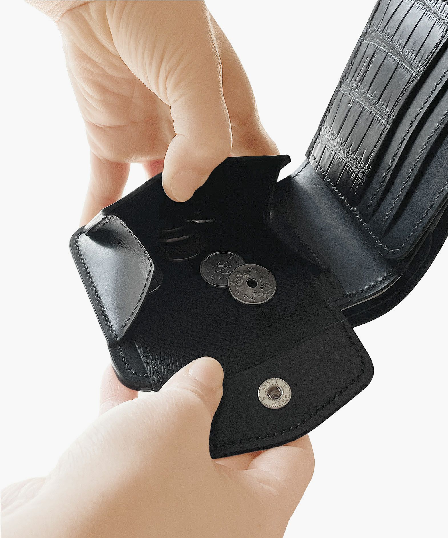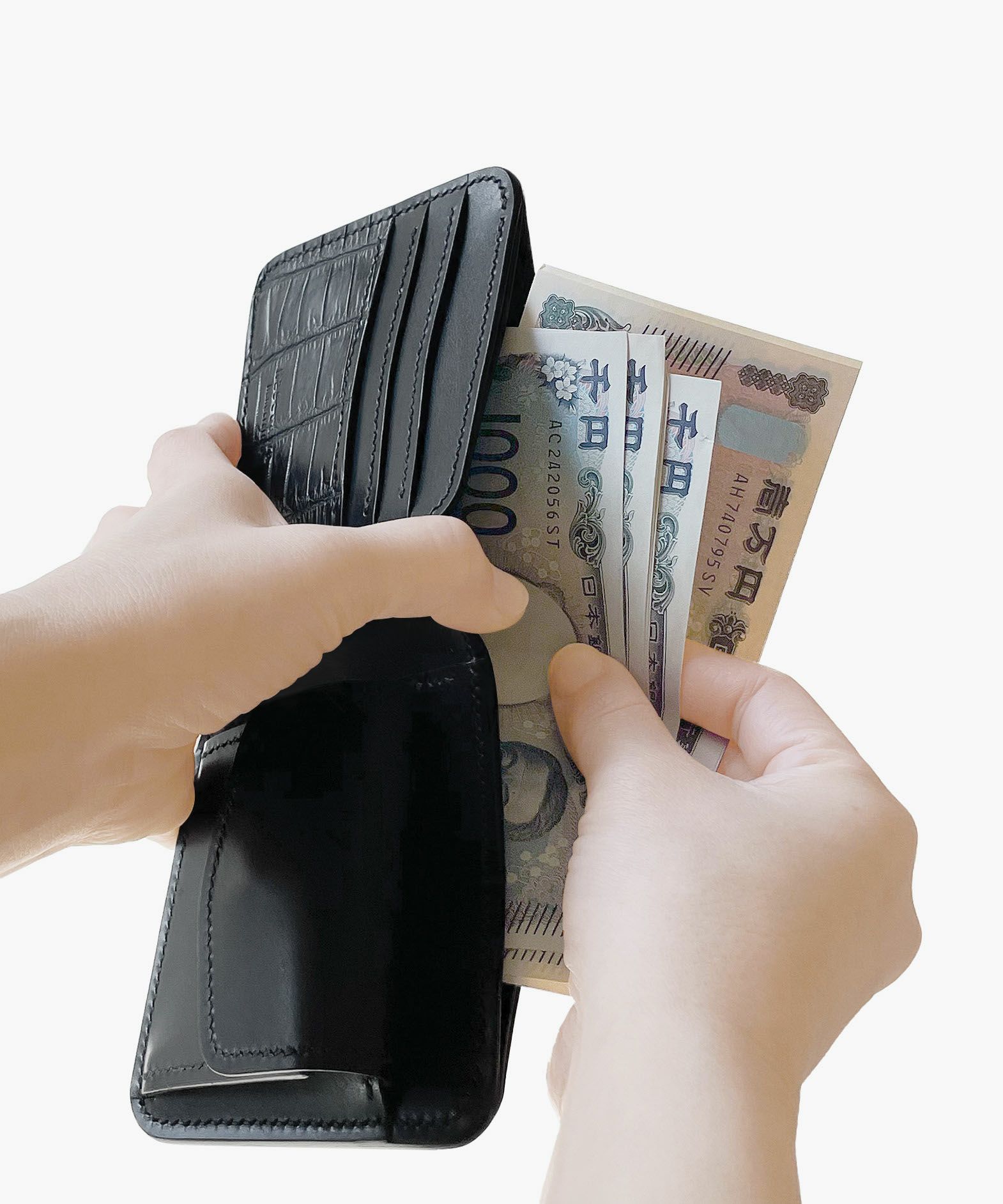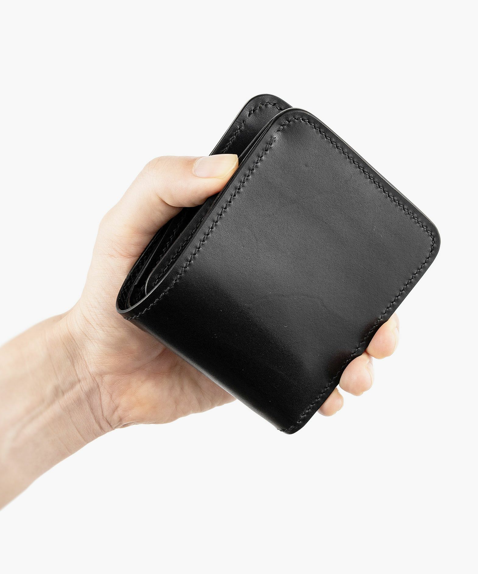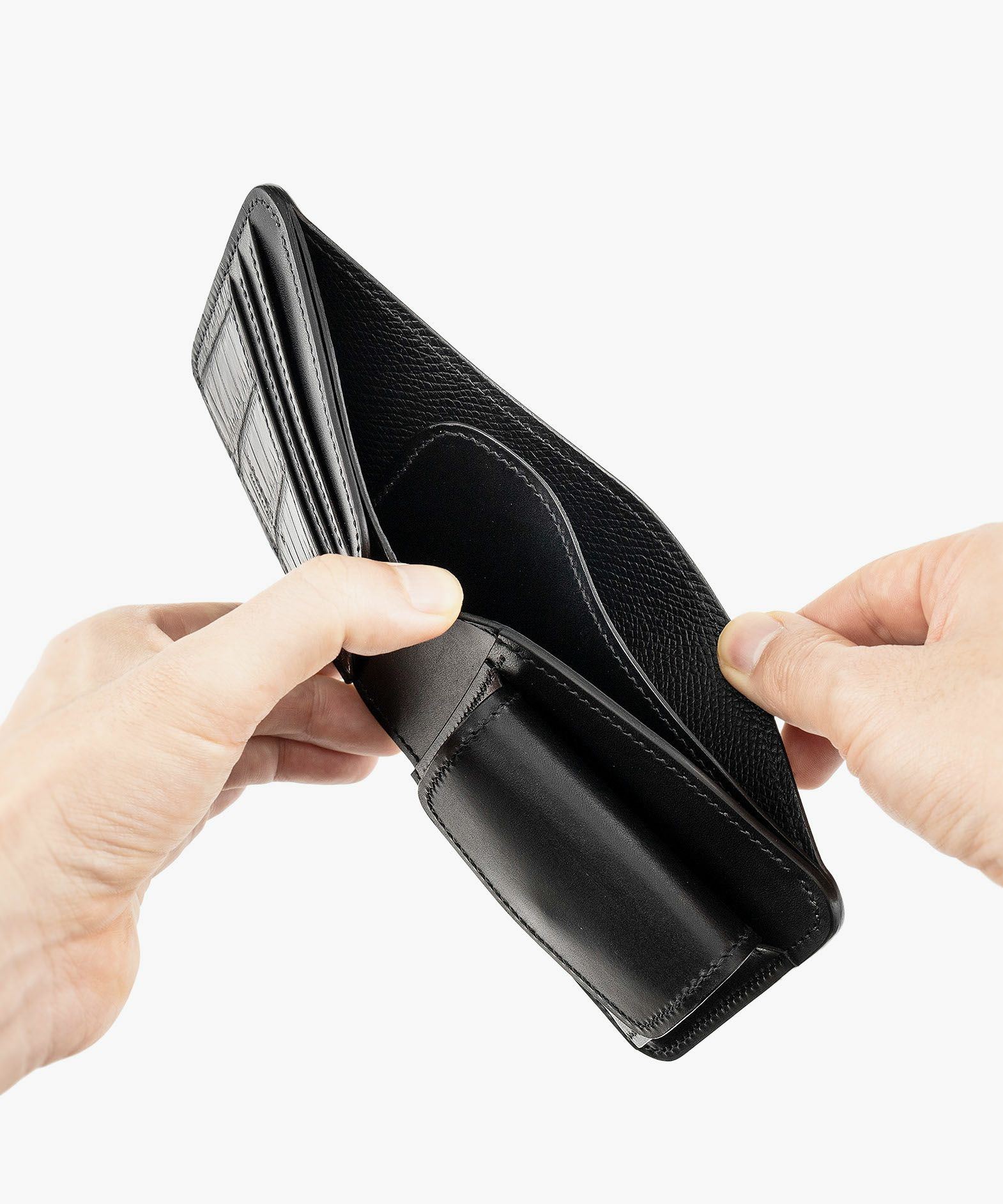 二つ折りにしては大きめのサイズ感と、分厚く美しいコバによる存在感が、ワイルドな雰囲気を漂わせて魅了する、二つ折り財布“Score”。外装・内装に纏わせた国産の植物タンニン鞣し革「ハーヴィー」による、天然素材ならではの血筋やトラ模様も、野生味を醸し出させる一因に。しなやかな質感によるハリ感も魅力で、使うたびに味わい深いツヤ感が増して、申し分のないエイジングを楽しめるのも特長。無骨な印象を与えながらも、丸みや曲線を施した繊細なデザインが、丁寧な手縫いや上質な仕立てとともに、エレガントで繊細なジェントル感も醸成。内装装飾のオプションとして、ブラックのクロコダイルに変更できる遊び心が、ひとつ上の小洒落感も演出しながら、洗練された大人のセンスまでも刺激してくれる。