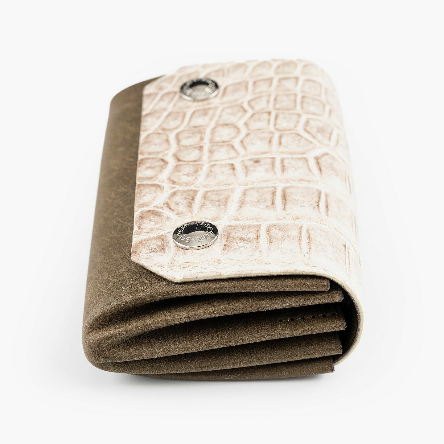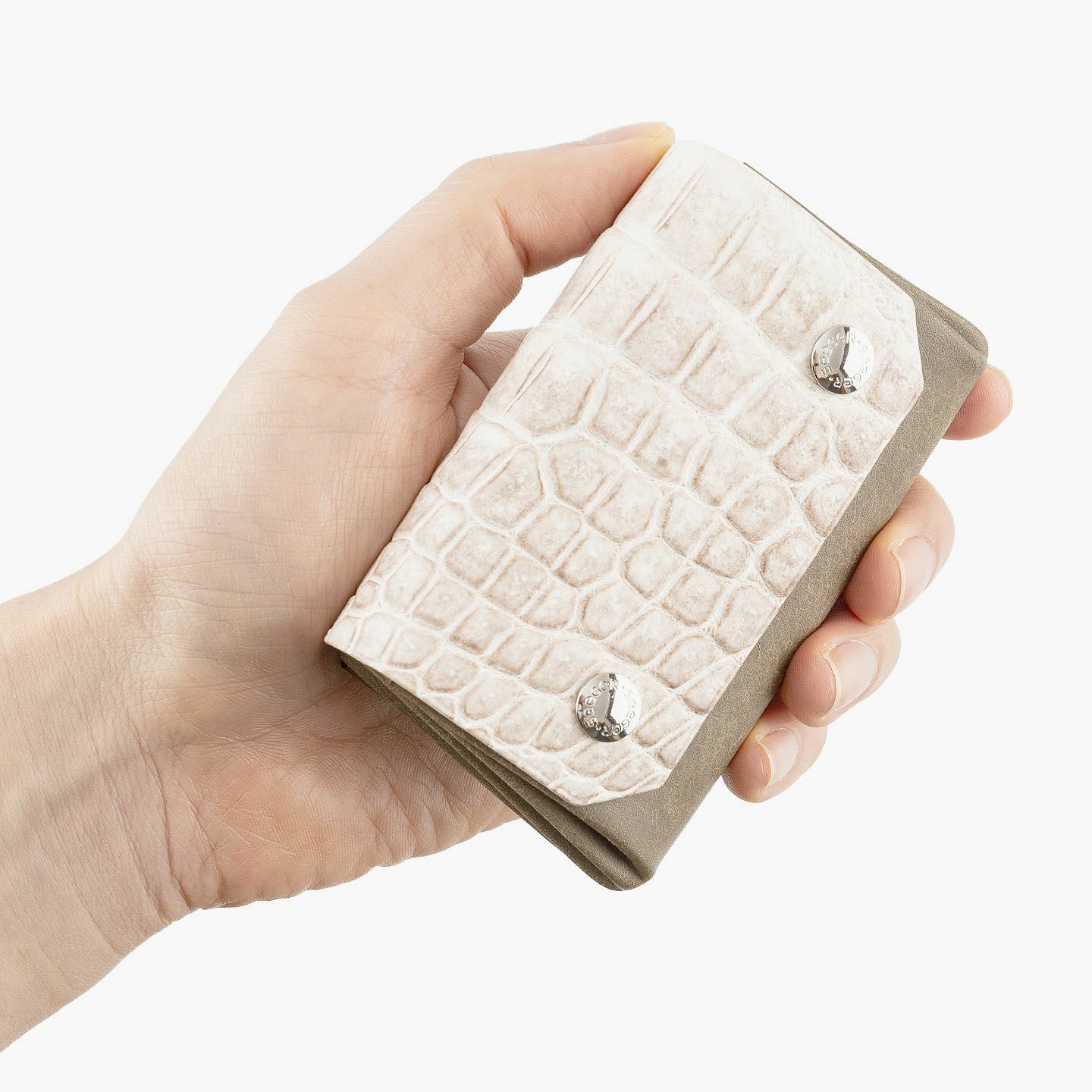 数多くの受賞歴を誇ってきた技術に恥じぬよう、日本の職人とタンナーが手を組み、最高峰のプロダクトを生み出しているブランド『SEEGER』のマルチコインケース“Hades”。地球環境に配慮して“メタルフリー”で鞣したカブセ外装の「ヒマラヤクロコ」が、個性的な表情で魅了するとともに、「プエブロ」との異なる質感・色合いによる融合が、至極感あふれる佇まいを創出。手のひらサイズで丸みを帯びた愛らしいフォルムの内部には、ジャバラ構造のコインポケットを2つ備え、小銭だけでなく折り畳んだ紙幣・レシートなどをフレキシブルに収納できるなど、異素材の経年変化も存分に楽しみながら、この上ない愛着感を抱かせてくれる。