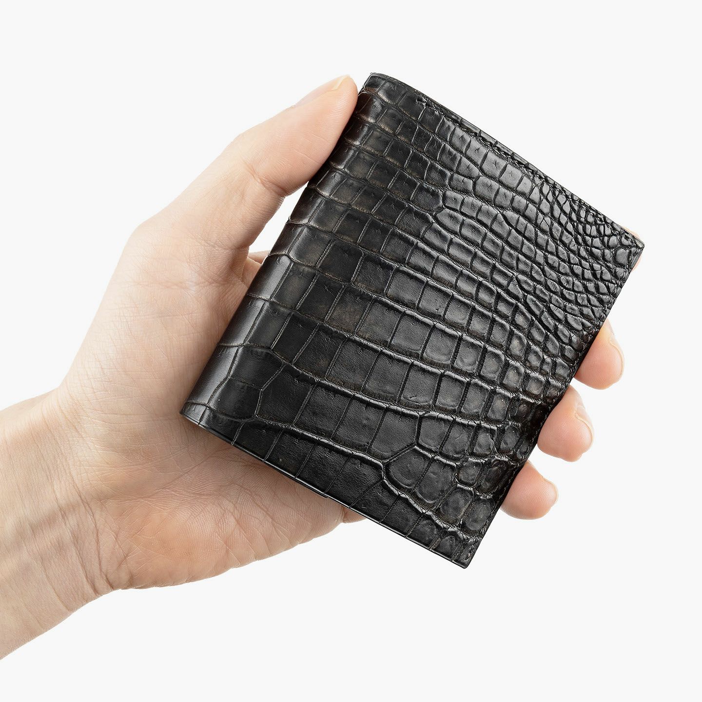 ドイツで1889年に創業し、世界中のセレブリティから愛されながらも衰退してしまうが、日本の職人たちの手で現代に蘇らせたブランド『SEEGER』の二つ折り財布“Perseus”。外装として纏わせた「墨染めクロコダイル」は、環境に配慮した“メタルフリー”で鞣し、墨汁による染色を施した贅沢なマテリアル。内装には、高級感があり小キズにも強い、型押し牛革「ボーダーハード」を採用。異なる質感・表情をブラックカラーで統一させることで、重厚感と極上感を併せ持たせながら、ややコンパクトにしたサイズ感がスマートな扱い心地へ。魅惑的な美しい表情と、スリムさを追求した佇まいが、洗練された大人のクールさを漂わせてくれる。