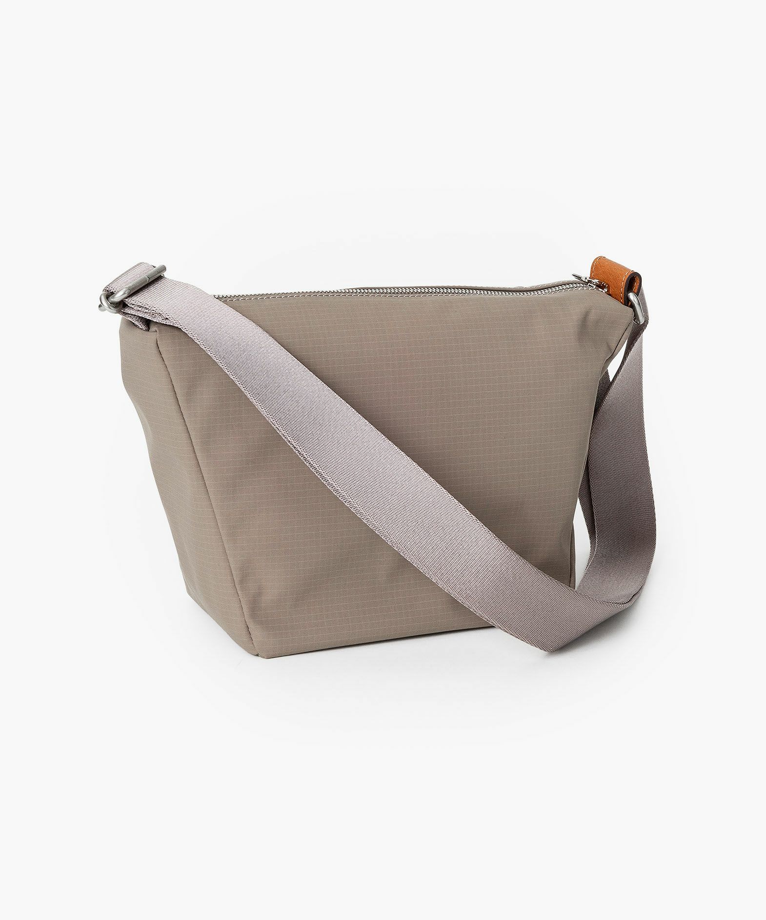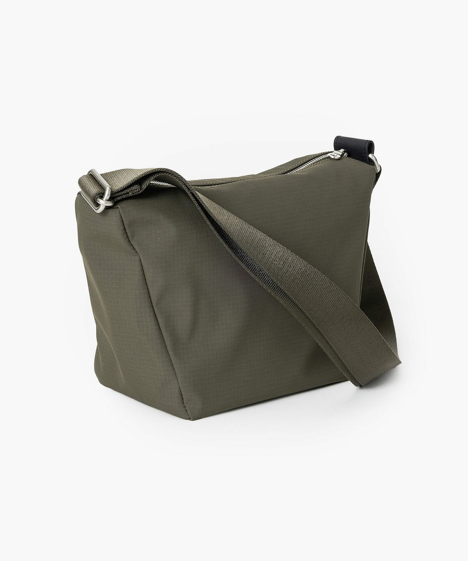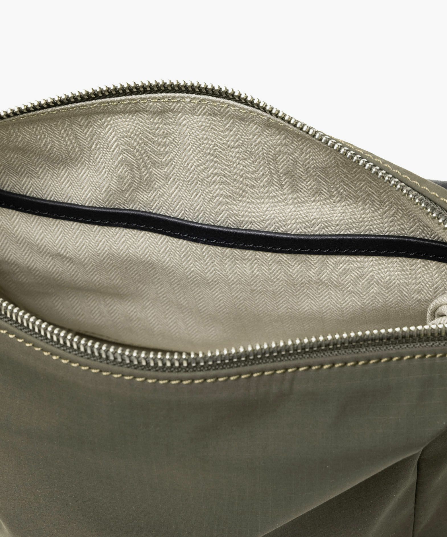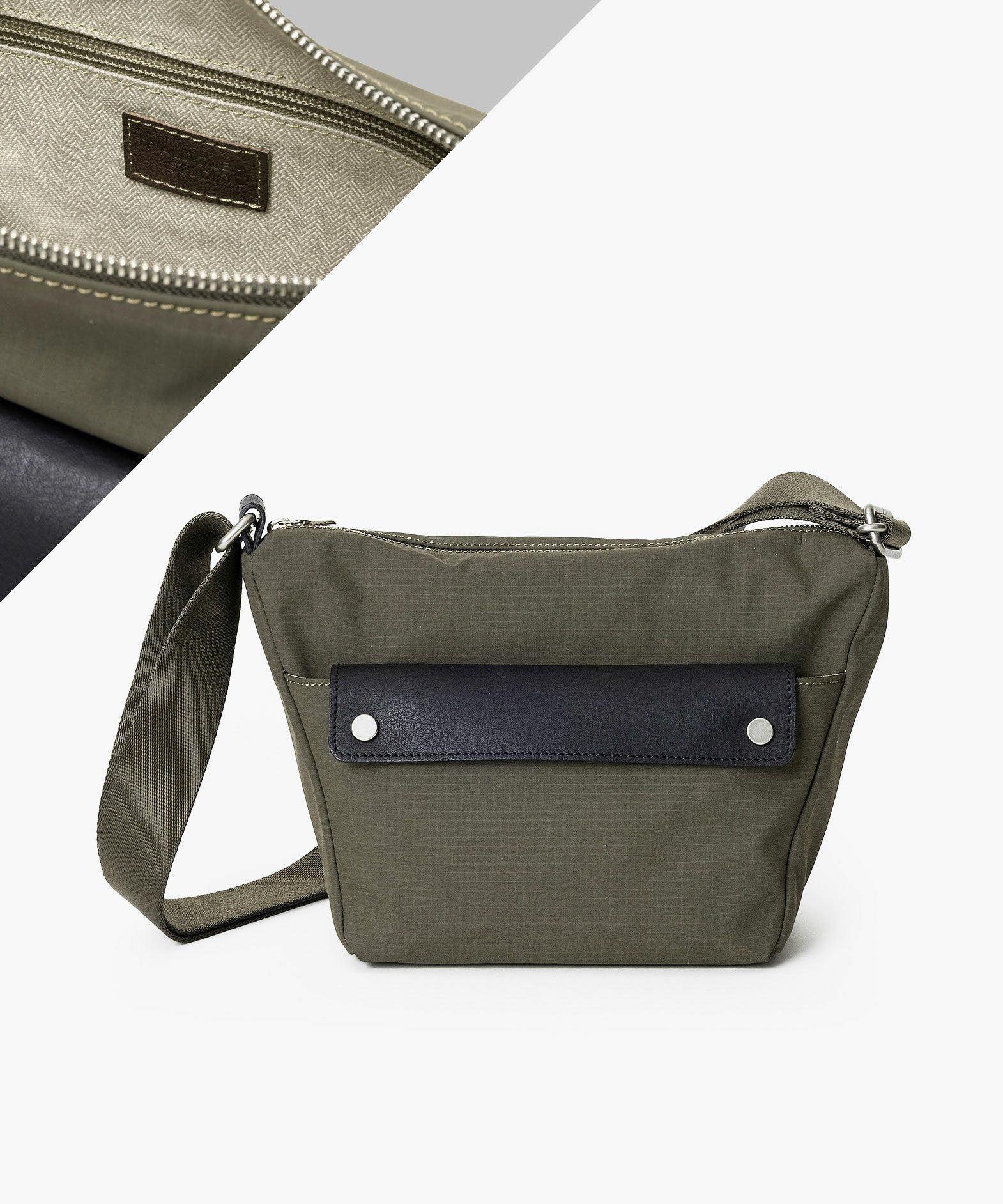 メインポケットのファスナーが大きく開いて、荷物の出し入れをしやすくするため、底部よりも天部を長くした台形のフォルムが印象的な、愛らしいミニショルダーバッグ。メインの素材には、海外メゾンからも信頼されているDICROSの「リップストップ生地」を採用し、Black・Khaki・Beigeの3色からセレクトオーダーを楽しむことも。しなやかな風合いが漂う外装のアクセントとして、前面ポケットのフラップに「ヌメ革」をあしらうことで、両サイドの斜めラインがさらに強調され、ソフィスティケートされた佇まいへと昇華。スマートフォンを前面ポケットに入れても影響ないように、マグネット式ではなくホック式にする配慮も。ジェンダーレスでスタイリッシュなデザインが、大人のセンスを引き立ててくれる。