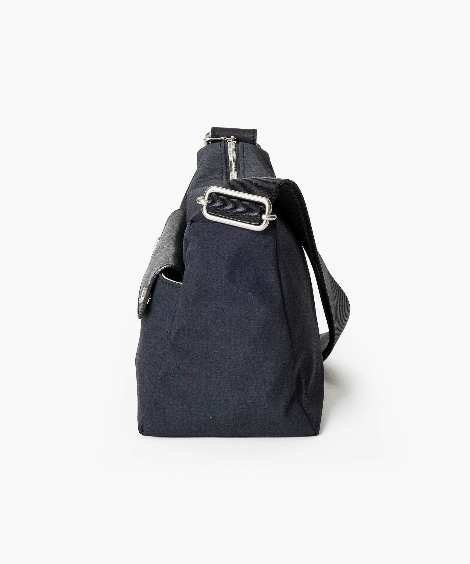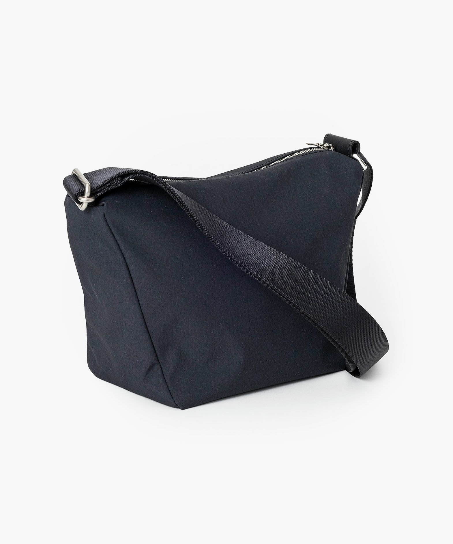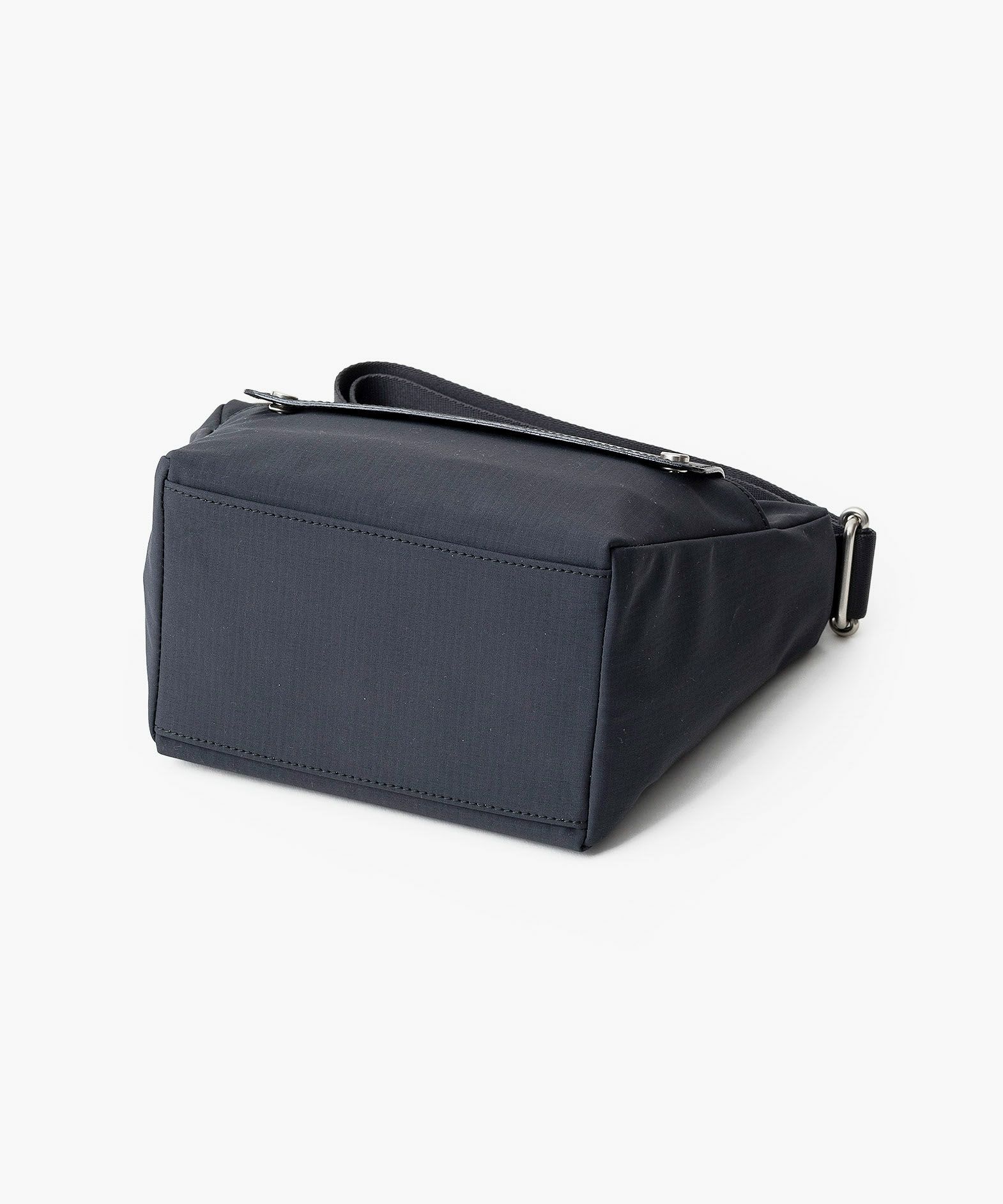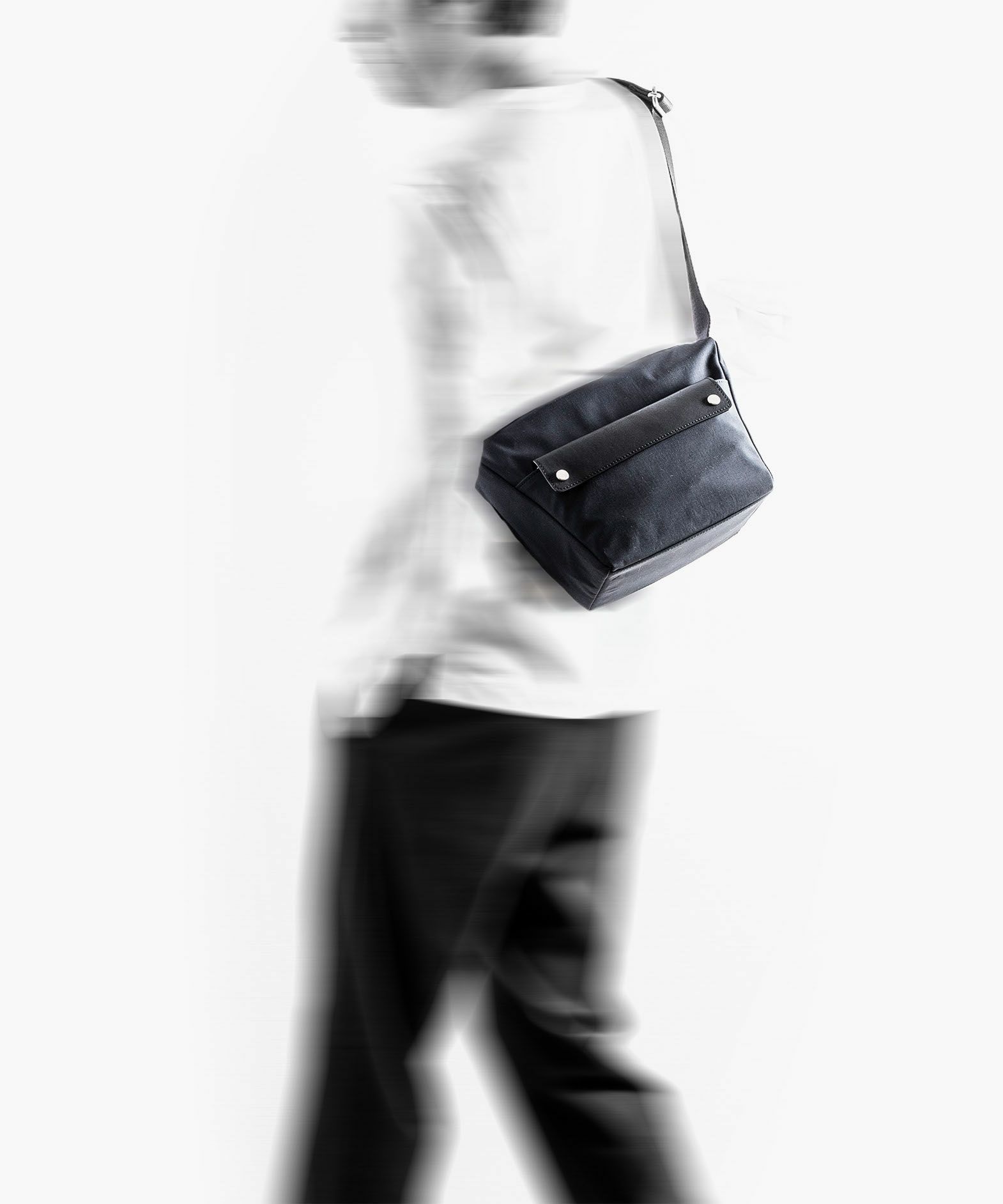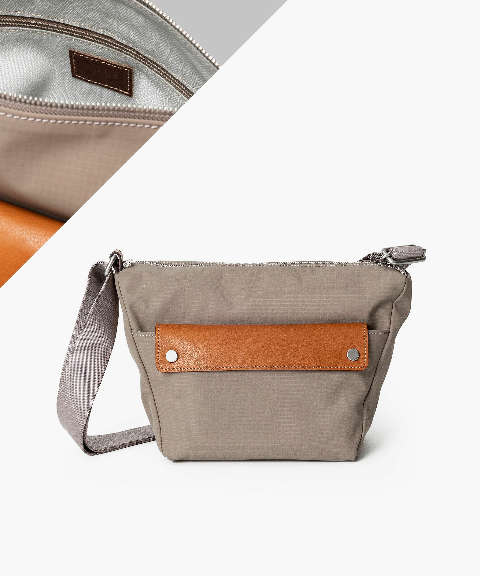 メインポケットのファスナーが大きく開いて、荷物の出し入れをしやすくするため、底部よりも天部を長くした台形のフォルムが印象的な、愛らしいミニショルダーバッグ。メインの素材には、海外メゾンからも信頼されているDICROSの「リップストップ生地」を採用し、Black・Khaki・Beigeの3色からセレクトオーダーを楽しむことも。しなやかな風合いが漂う外装のアクセントとして、前面ポケットのフラップに「ヌメ革」をあしらうことで、両サイドの斜めラインがさらに強調され、ソフィスティケートされた佇まいへと昇華。スマートフォンを前面ポケットに入れても影響ないように、マグネット式ではなくホック式にする配慮も。ジェンダーレスでスタイリッシュなデザインが、大人のセンスを引き立ててくれる。