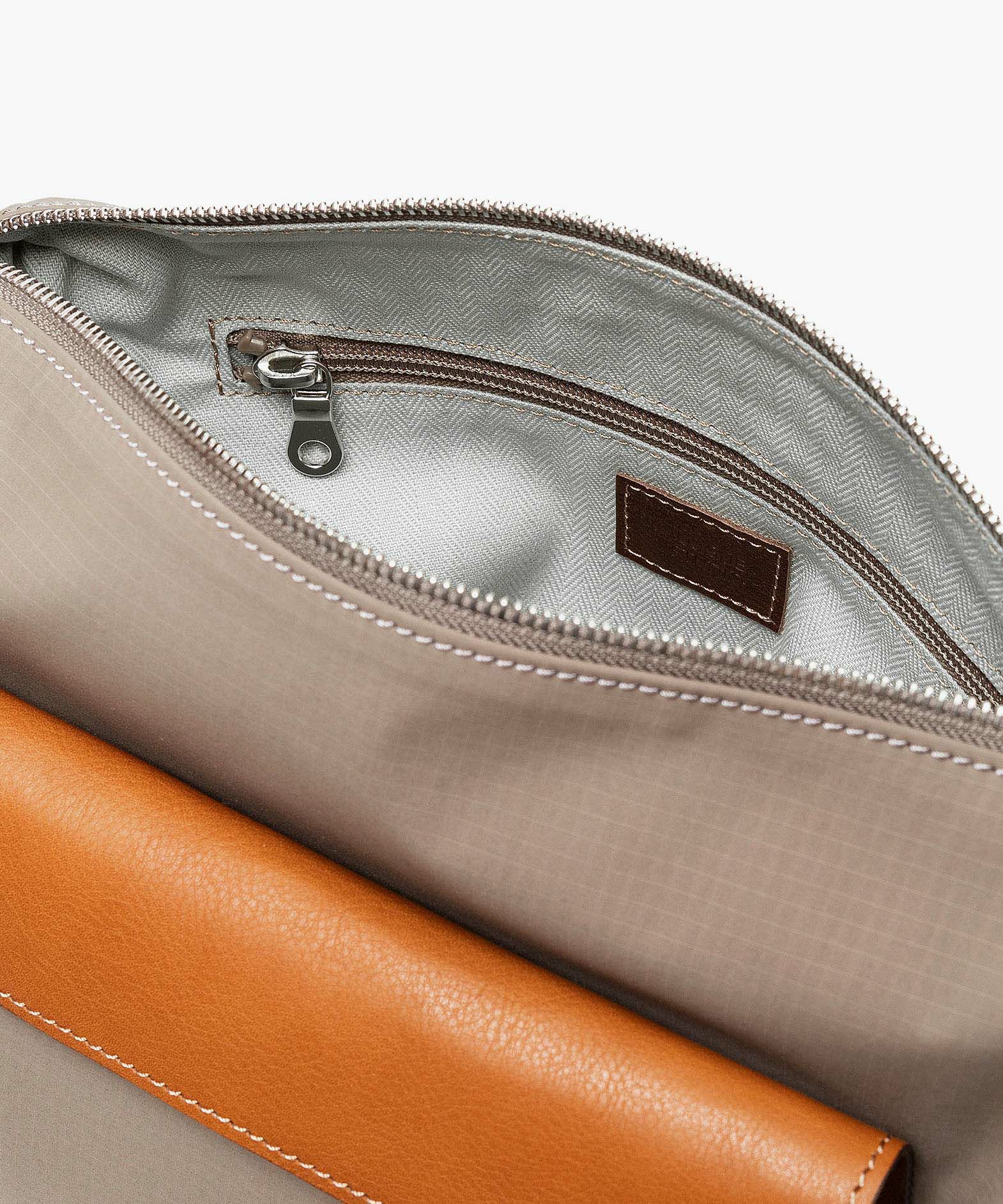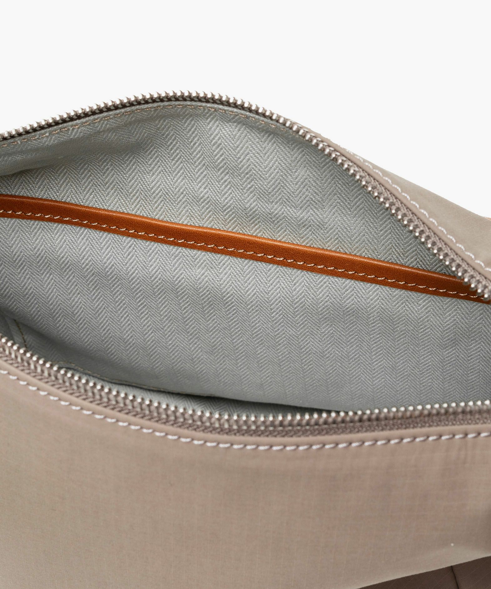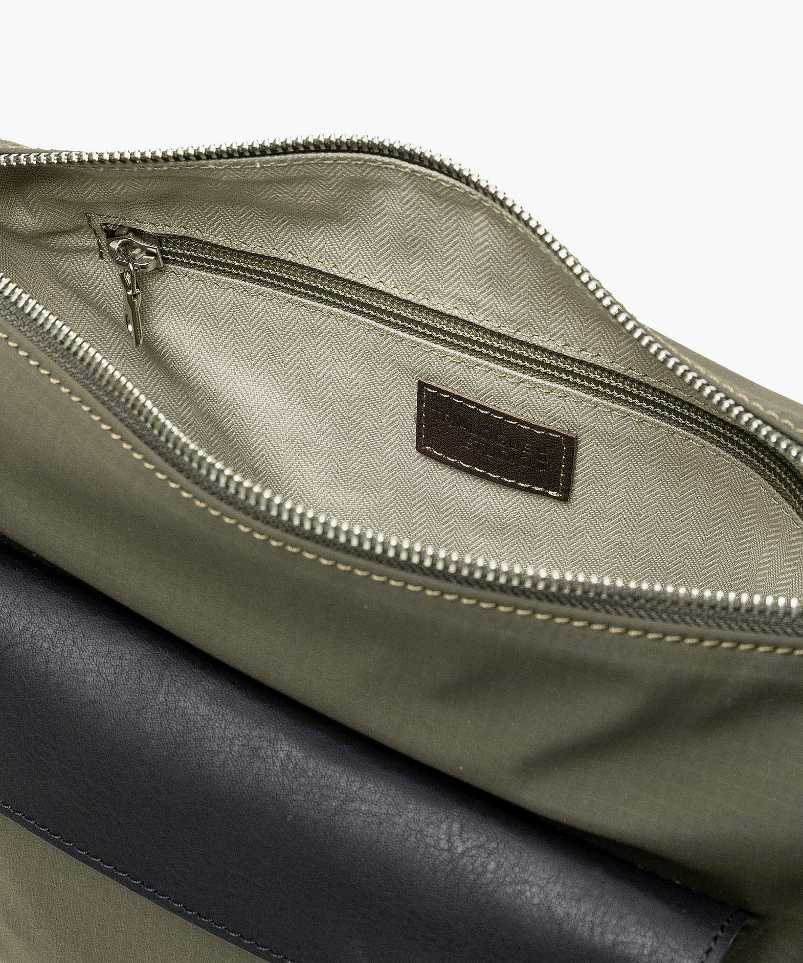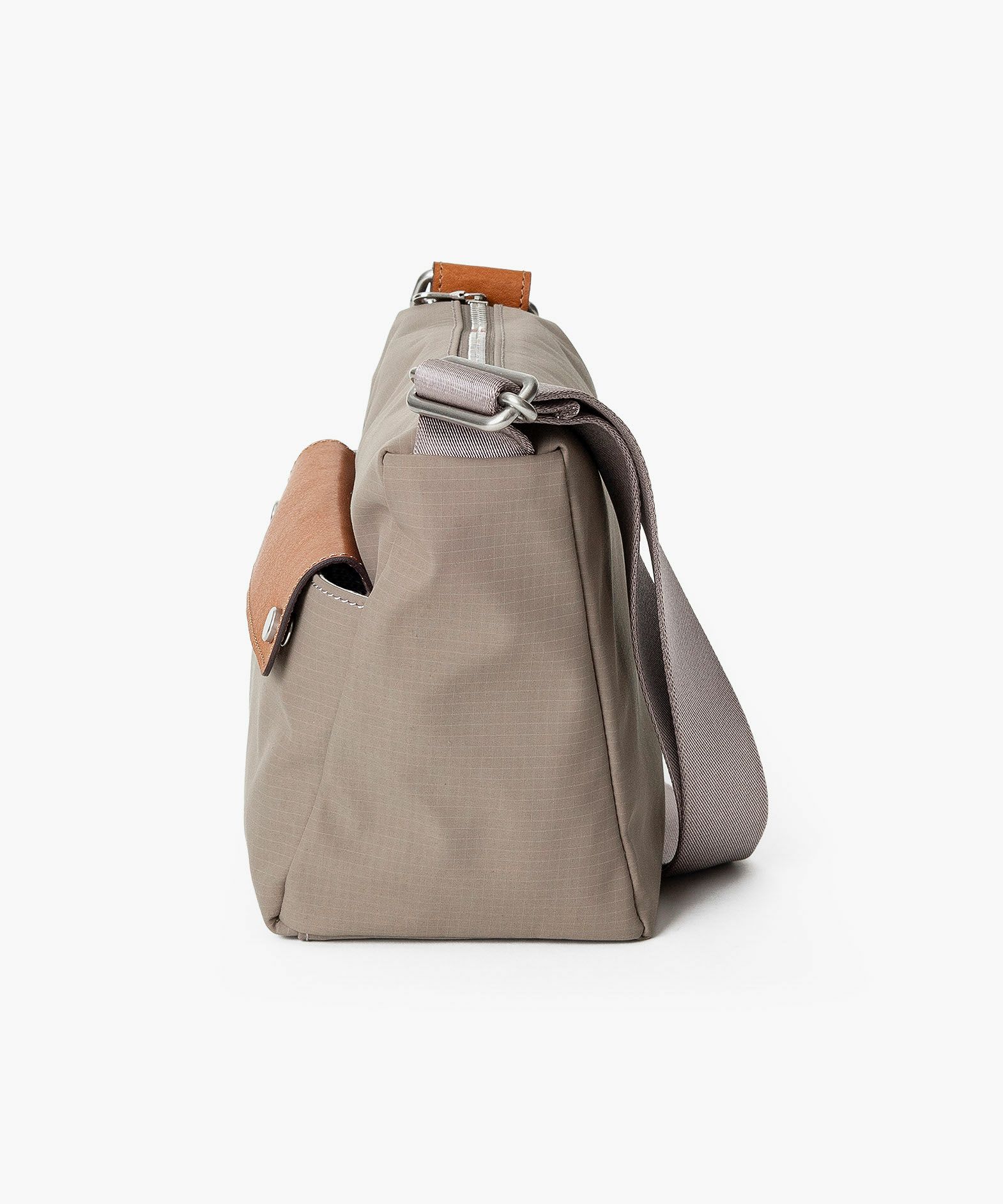 メインポケットのファスナーが大きく開いて、荷物の出し入れをしやすくするため、底部よりも天部を長くした台形のフォルムが印象的な、愛らしいミニショルダーバッグ。メインの素材には、海外メゾンからも信頼されているDICROSの「リップストップ生地」を採用し、Black・Khaki・Beigeの3色からセレクトオーダーを楽しむことも。しなやかな風合いが漂う外装のアクセントとして、前面ポケットのフラップに「ヌメ革」をあしらうことで、両サイドの斜めラインがさらに強調され、ソフィスティケートされた佇まいへと昇華。スマートフォンを前面ポケットに入れても影響ないように、マグネット式ではなくホック式にする配慮も。ジェンダーレスでスタイリッシュなデザインが、大人のセンスを引き立ててくれる。