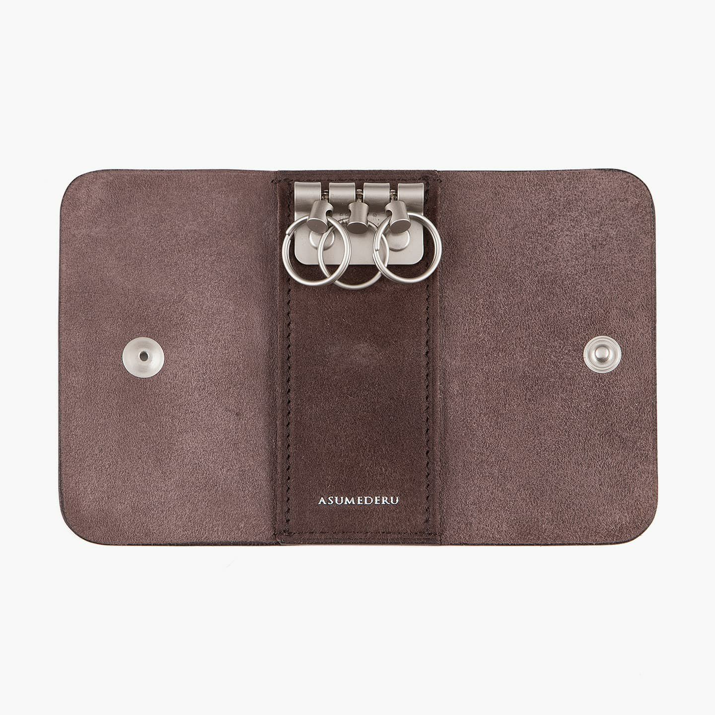 『ASUMEDERU』の金具類は、マット感のある質感が魅力。内装の中央上部に備わっている3連キーリングは、使い勝手が良く、ディテールの完成度も優れています。さらに、金具類を引き立てるために、「ベビーカーフ」の銀面と床面を組み合わせて色彩の立体感を生み出すことで、エレガントな雰囲気を創出。40年以上も財布を作り続けている豊富な経験を生かし、一流の技術が必要とされる薄くてシンプルなデザインを実現しています。