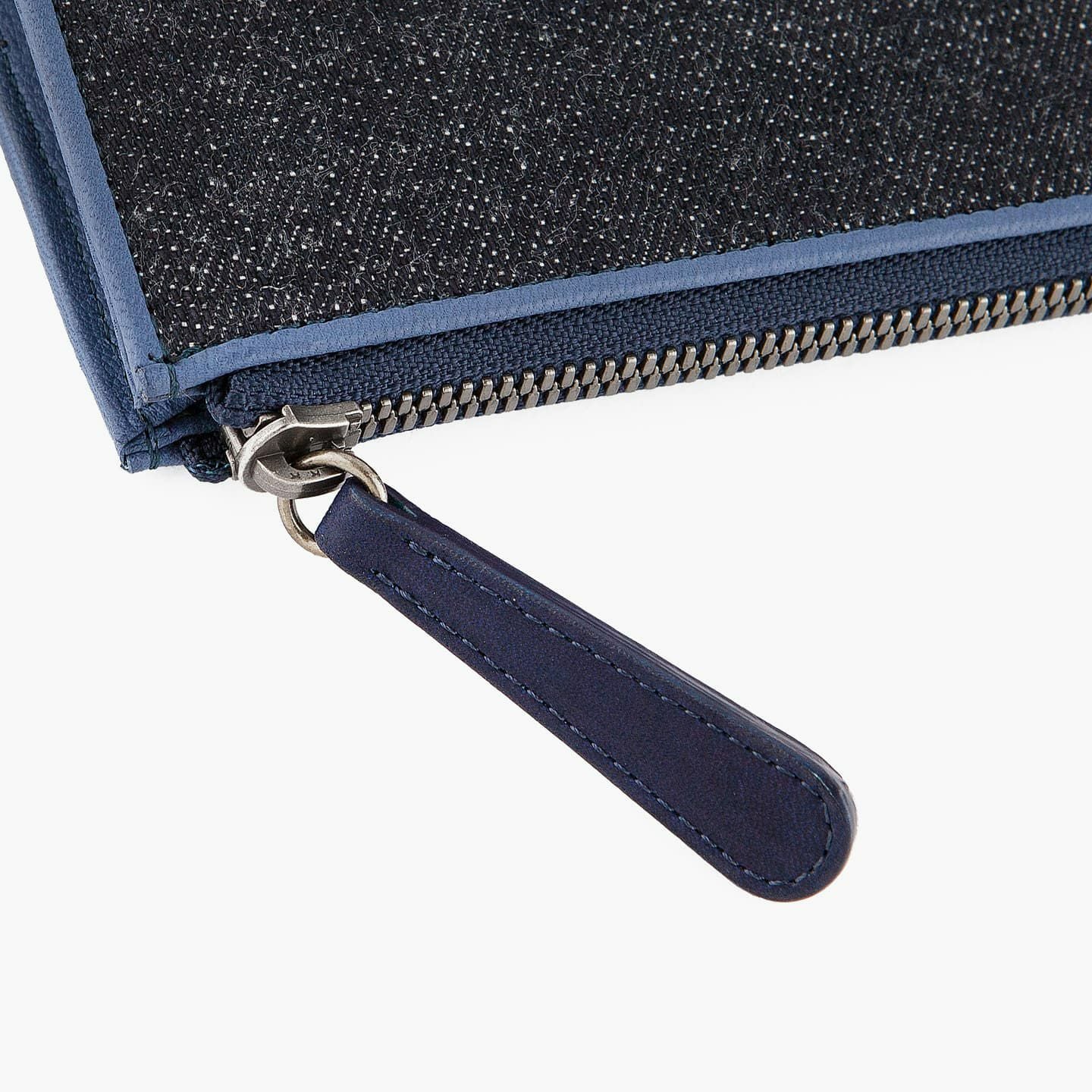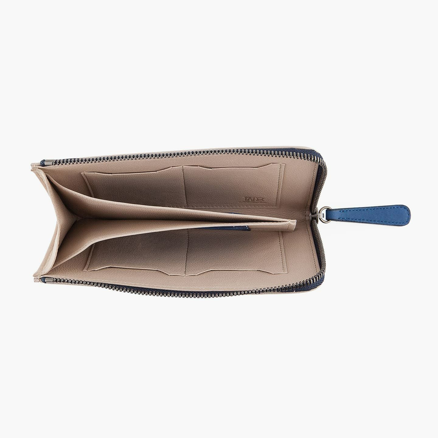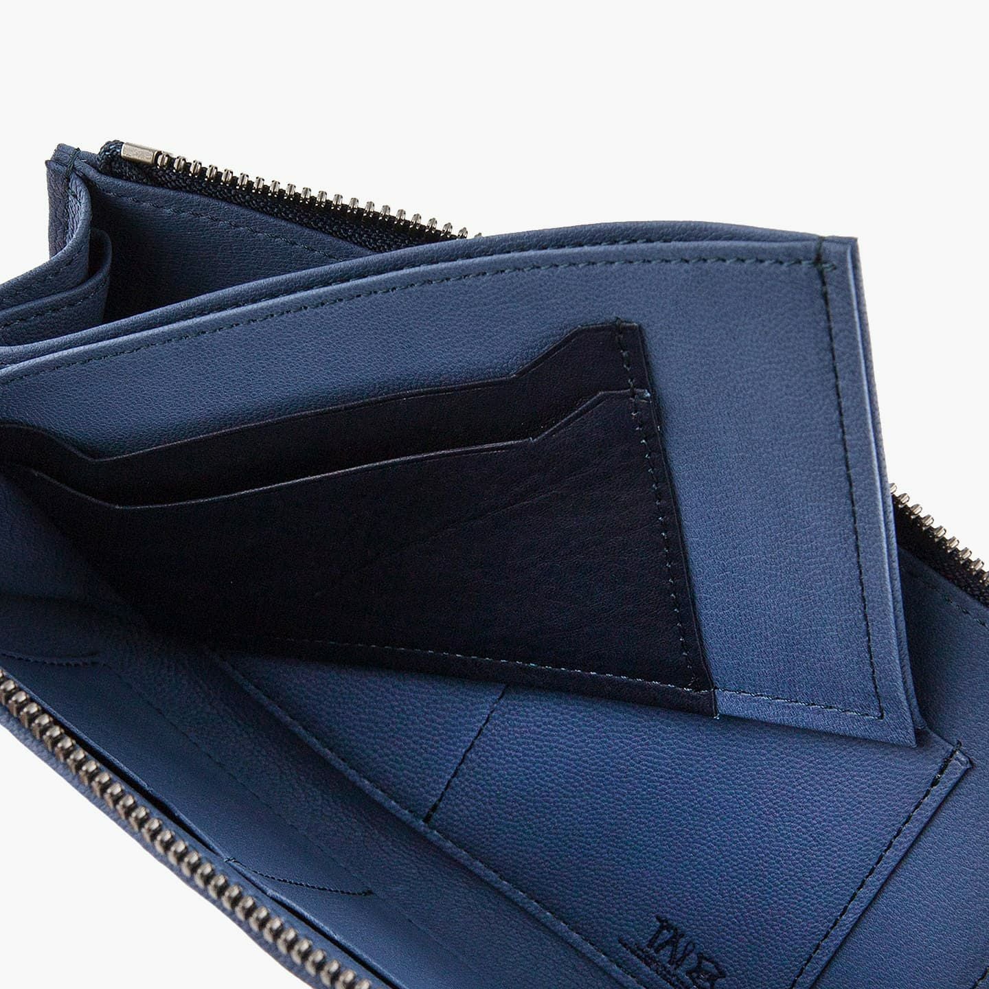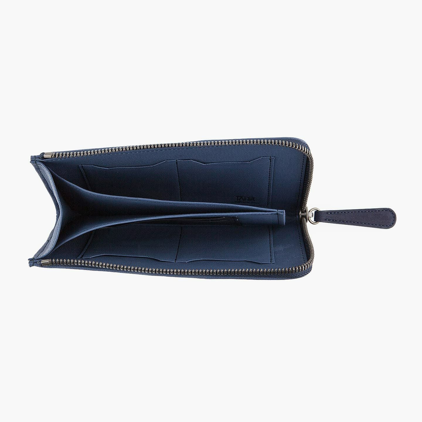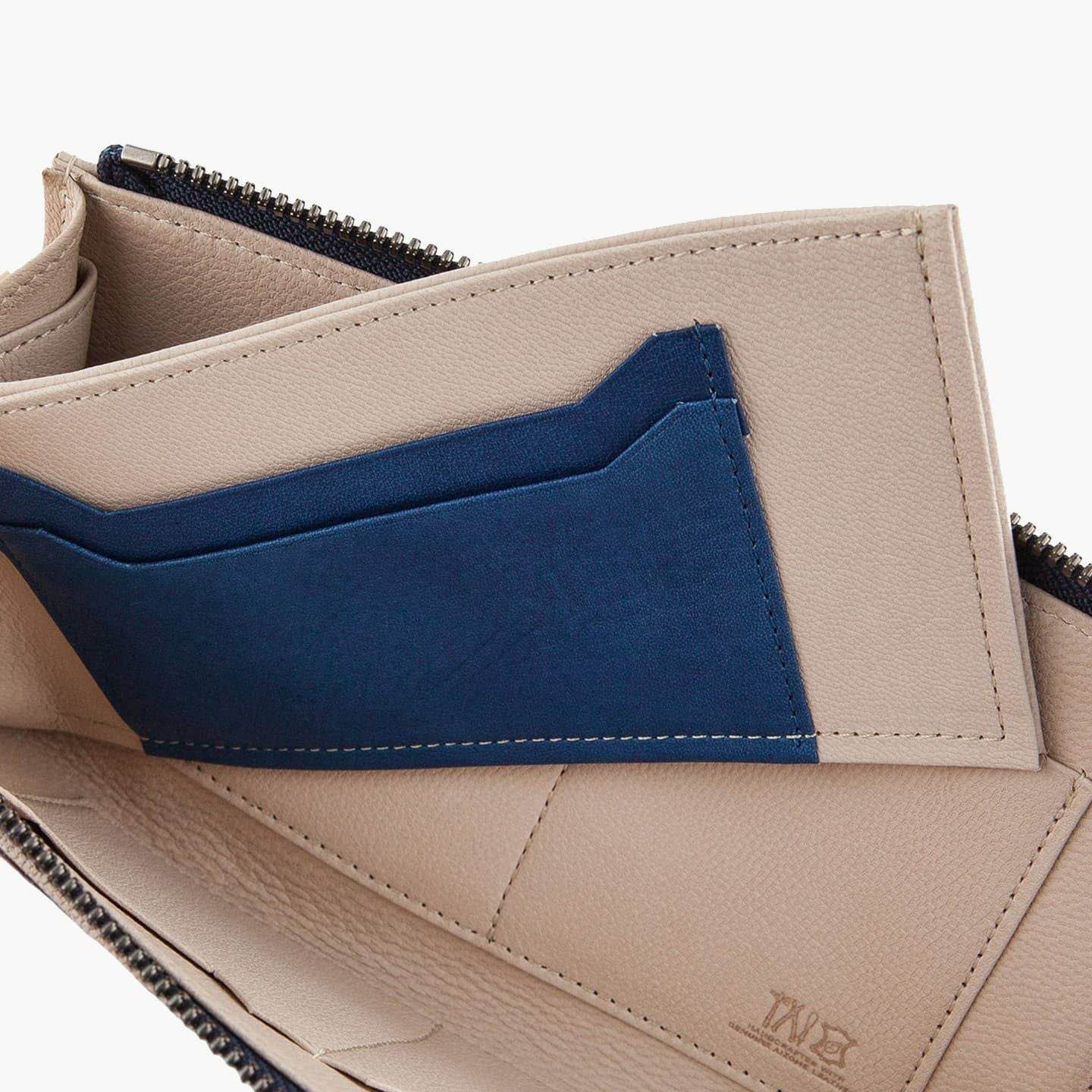 財布の内外ともに素材感があり、デザインの統一性も重視するため、あえてヌバックゴート革の銀面ではない裏面を使用。エイジングにより、手の脂などが染み込み、使うごとに自然なツヤが楽しめます。山羊革自体は、個性的な凹凸をしたシボと、独特な毛穴の形状が特長。薄くても丈夫で、型崩れしにくい特性があるため、高級レザー手袋やブランドのレザーシューズに使われることが多い素材です。また、しなやかで耐久性にも優れているので、身に付けるものやジャケットなどにも多く利用。アメリカ空軍がA-10フライトフローブ、アメリカ海軍がフライトジャケット(M-422)に使っていたことでも知られています。
