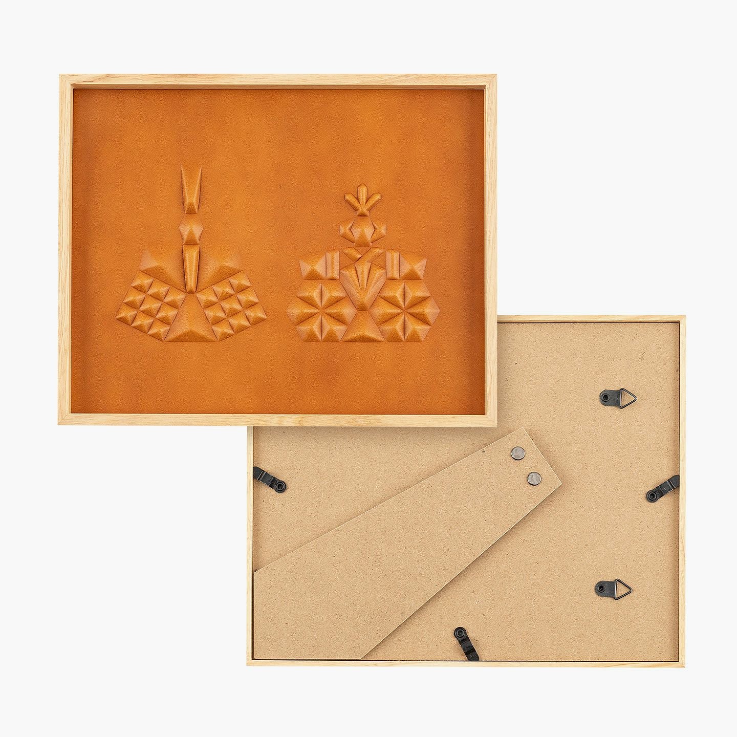 「ひな人形」をモチーフにして日本の伝統を取り入れながら、シンプルモダンなインテリアにもマッチする、高級感あふれる洗練されたデザインのアートパネル“hina”。革を立体的に成型させる伝統技術「革絞り」の製法と、3D切削加工の現代技術による原型を融合させ、手間暇を掛けながらレザーで「ひな人形」を表現。日本最大級の革の生産地・兵庫県たつの市のタンナー職人による「牛ヌメ革」を使い、贅沢な一枚革で魅力的なアートへ。わずか21mm厚の天然木フレームなので、場所を選ばず壁に掛けたり棚に置いたりすることも。オプションで名前・誕生日の刻印も追加でき、出産祝いなどの贈り物としてもセンスを響かせられる。