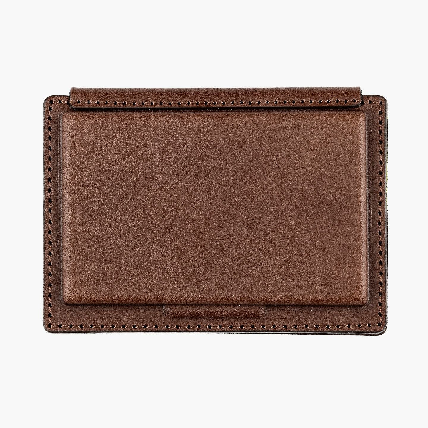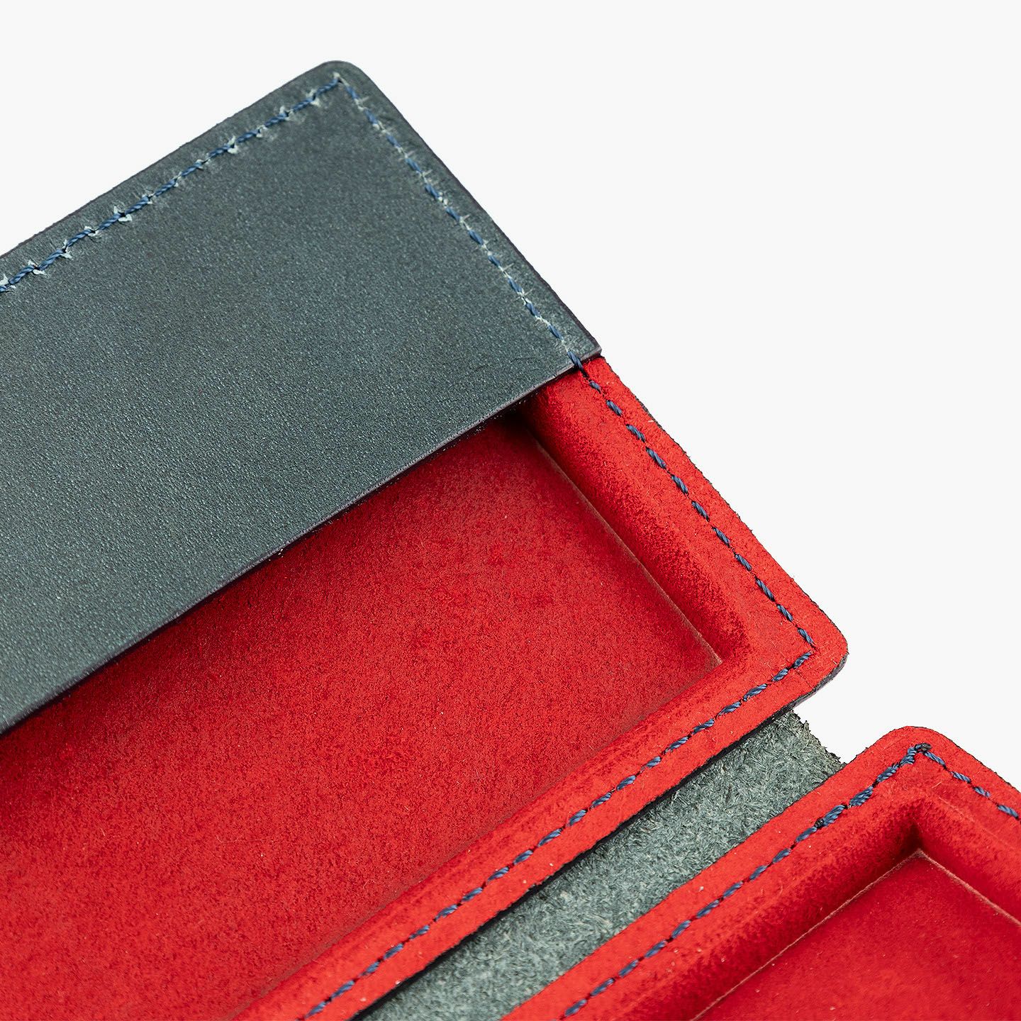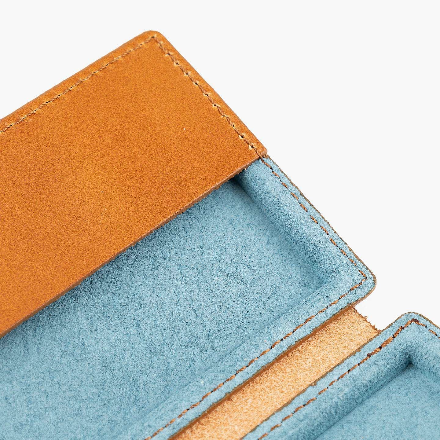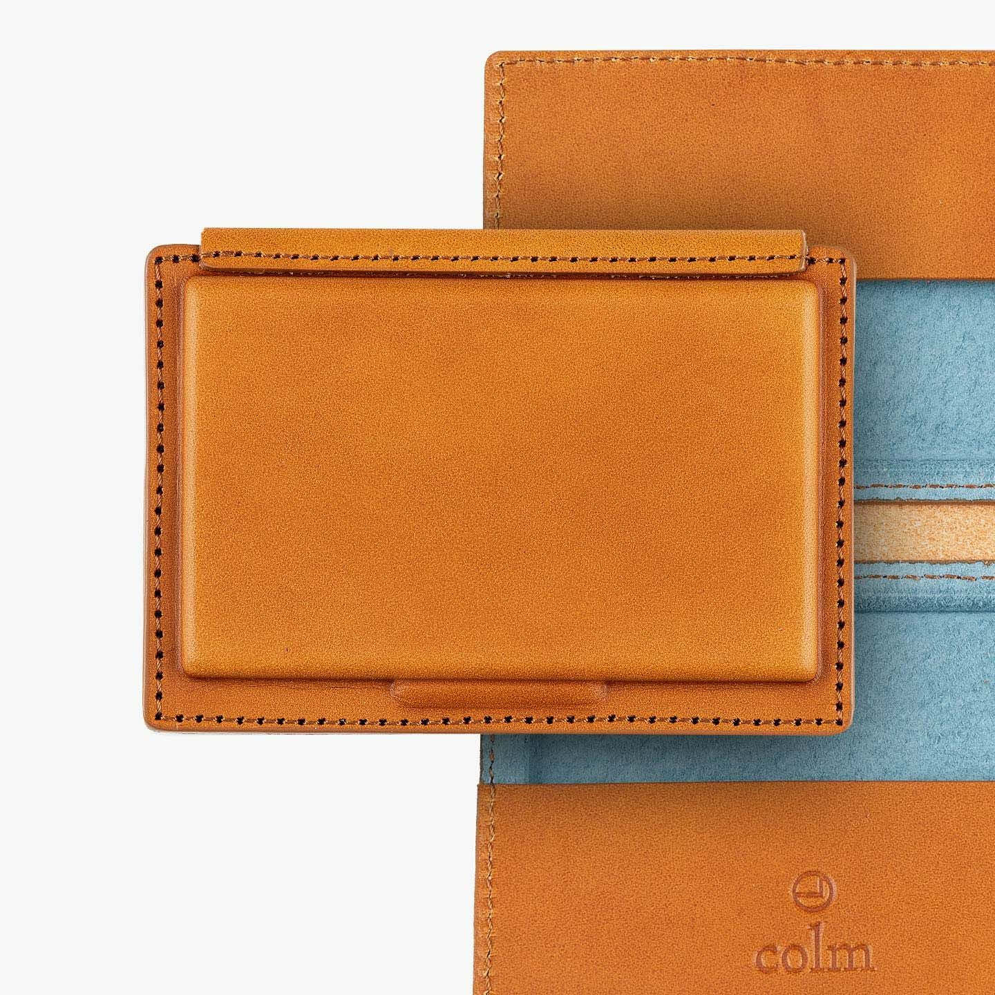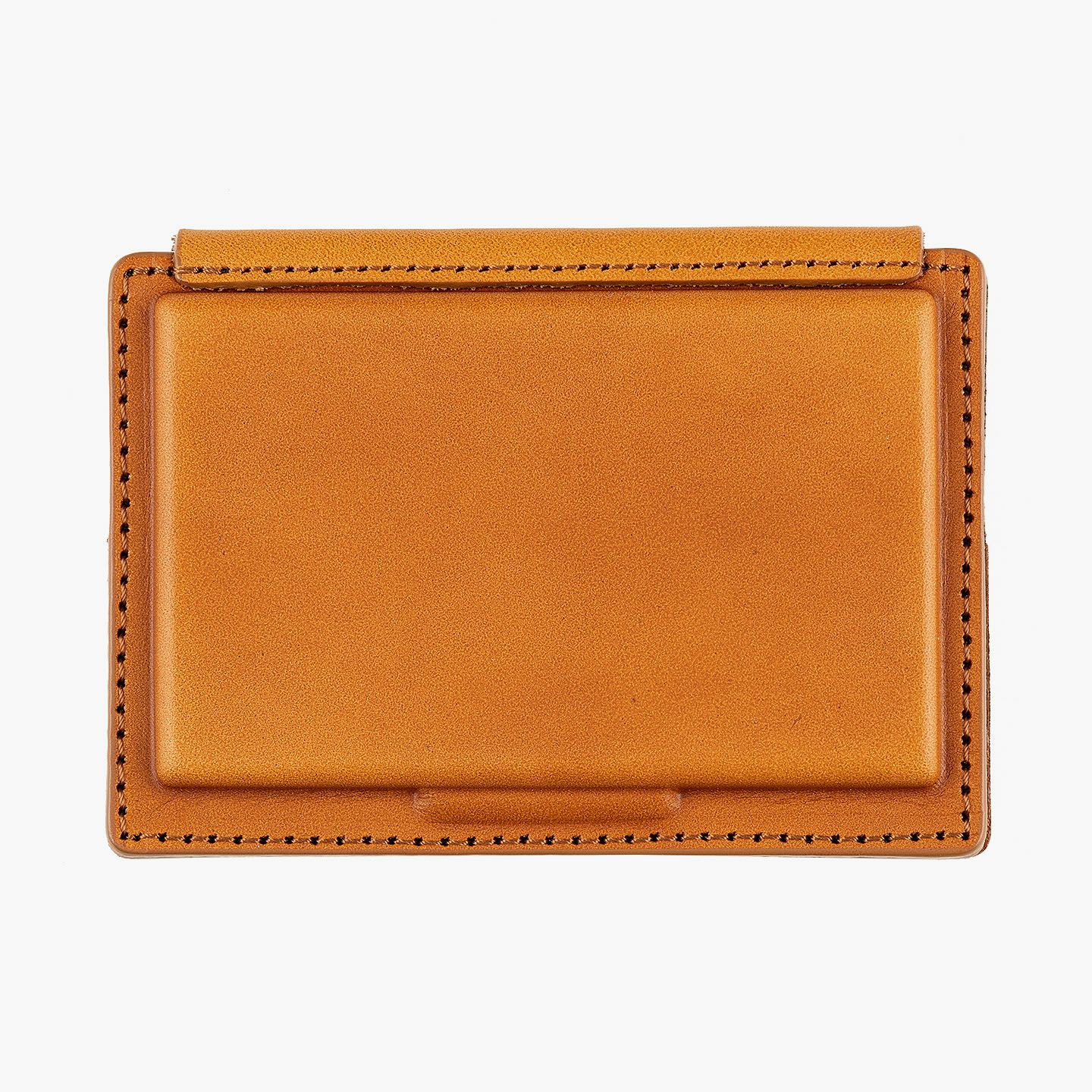 革を立体成型させる伝統技術「革絞り」と、3D切削加工の現代技術により生み出された、独創的なフォルムのカードケース。両サイドの窪んだスペースに、それぞれ15枚ほど(計30枚ほど)の名刺を収納でき、凸部分にはマグネットを内蔵していて開閉もスムーズ。外装には、日本最大級の革の生産地・兵庫県たつの市のタンナー職人の手により、植物タンニンで鞣した「牛ヌメ革」を採用。その表面加工をなるべく抑えることで、革本来の表情や経年変化を楽しめる仕立てに。内装には、カラフルな「ピッグスエード」を採用し、大人の隠れた遊び心も。日本の熟練職人による丁寧な縫製とともに、ビジネスシーンに上質な個性を輝かせてくれる。