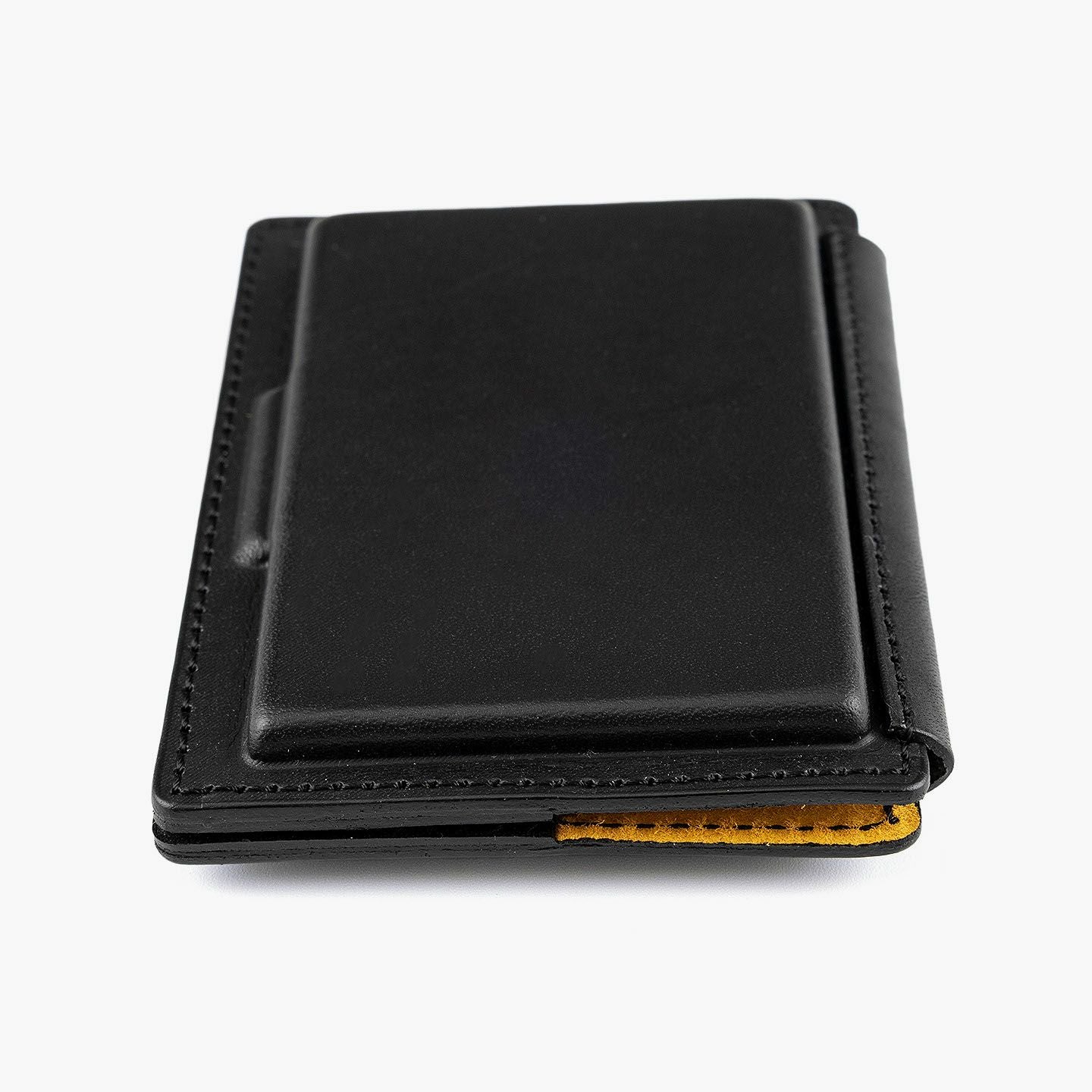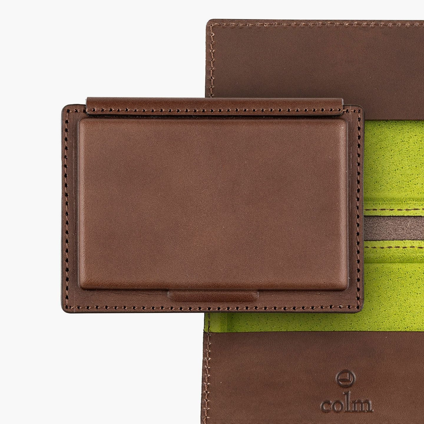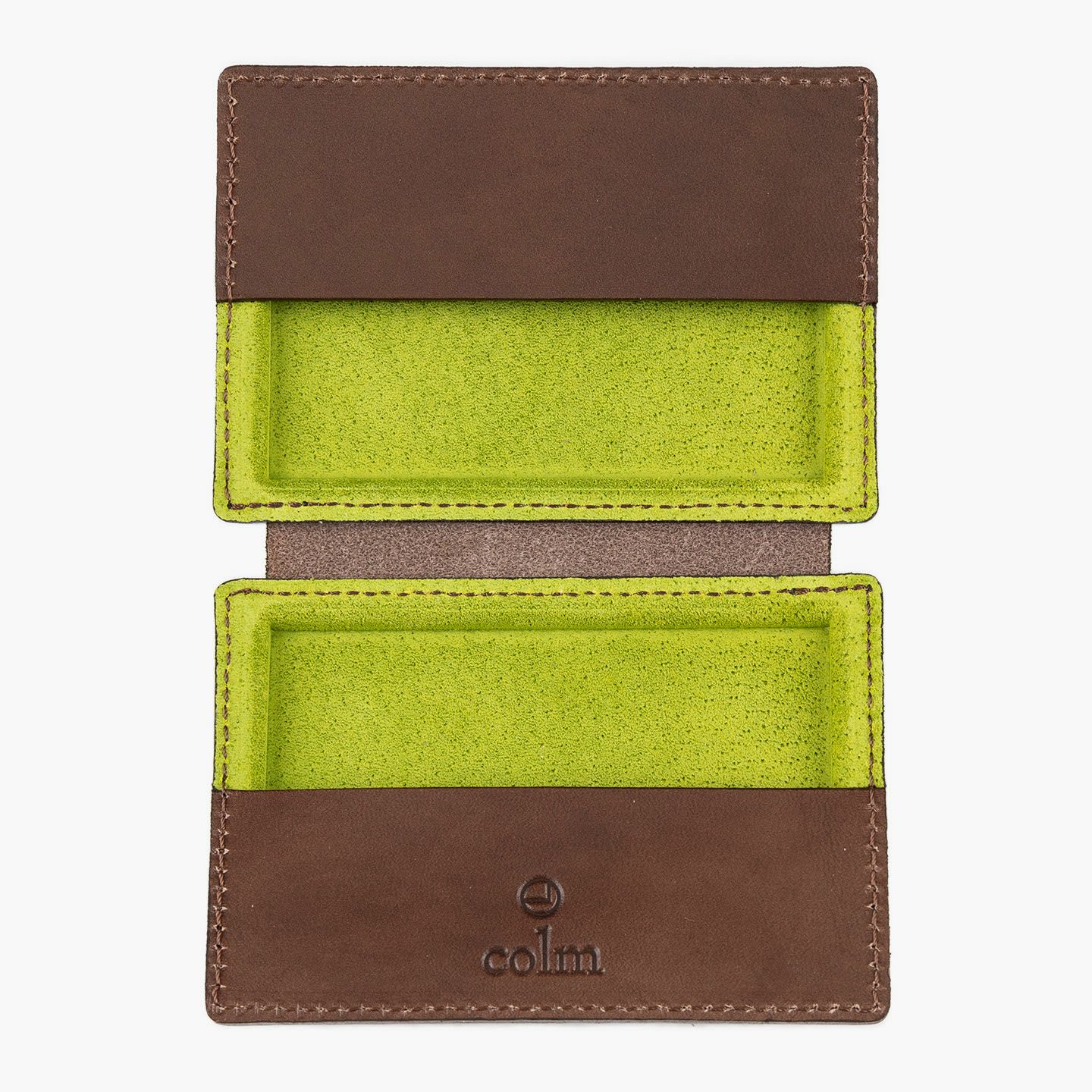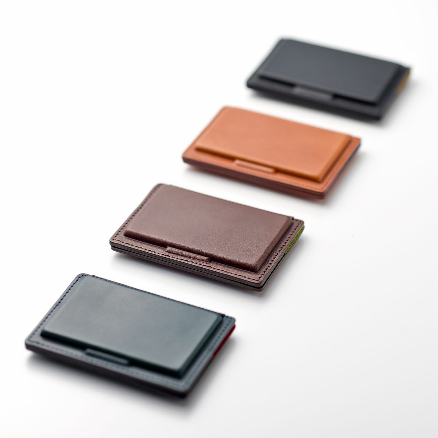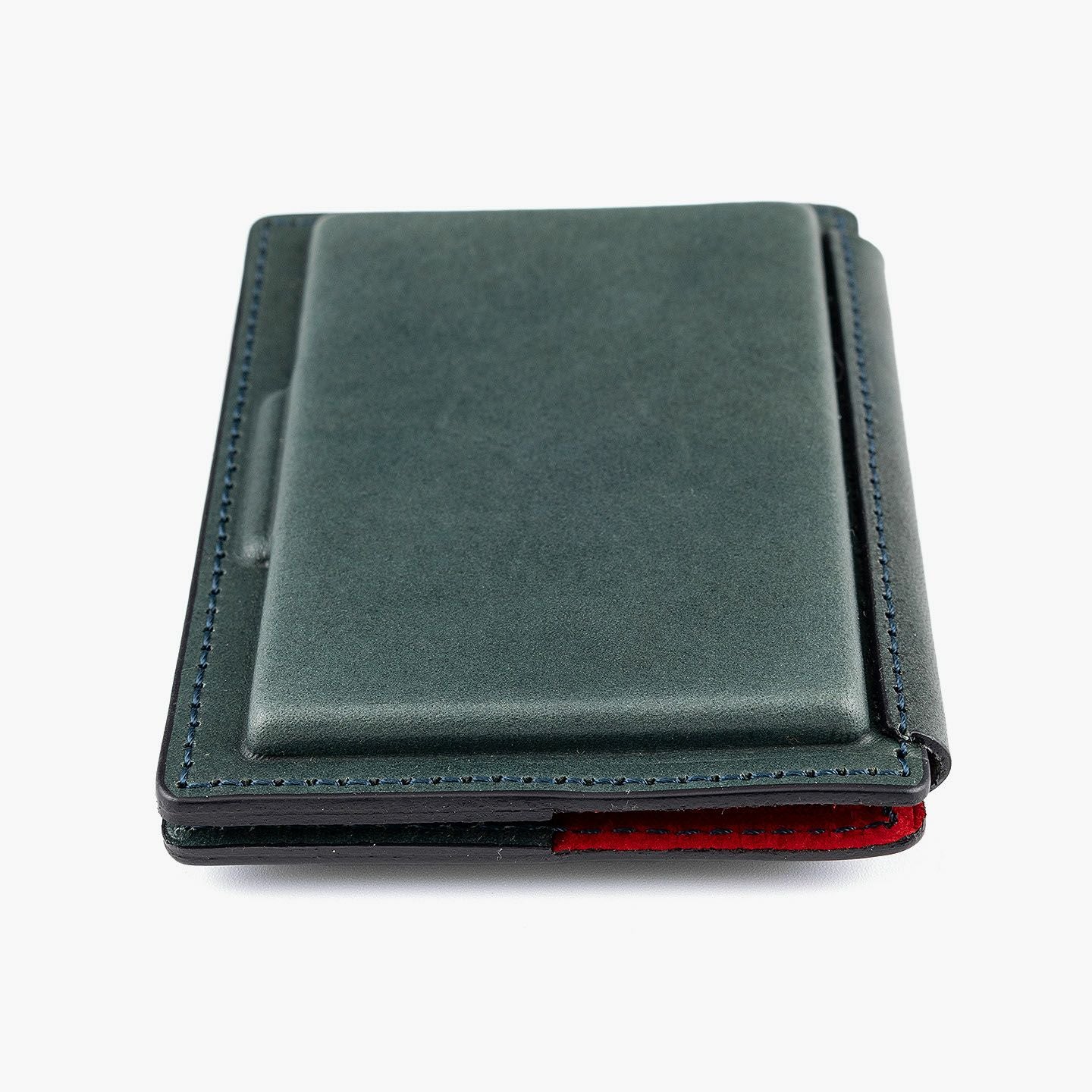 革を立体成型させる伝統技術「革絞り」と、3D切削加工の現代技術により生み出された、独創的なフォルムのカードケース。両サイドの窪んだスペースに、それぞれ15枚ほど(計30枚ほど)の名刺を収納でき、凸部分にはマグネットを内蔵していて開閉もスムーズ。外装には、日本最大級の革の生産地・兵庫県たつの市のタンナー職人の手により、植物タンニンで鞣した「牛ヌメ革」を採用。その表面加工をなるべく抑えることで、革本来の表情や経年変化を楽しめる仕立てに。内装には、カラフルな「ピッグスエード」を採用し、大人の隠れた遊び心も。日本の熟練職人による丁寧な縫製とともに、ビジネスシーンに上質な個性を輝かせてくれる。