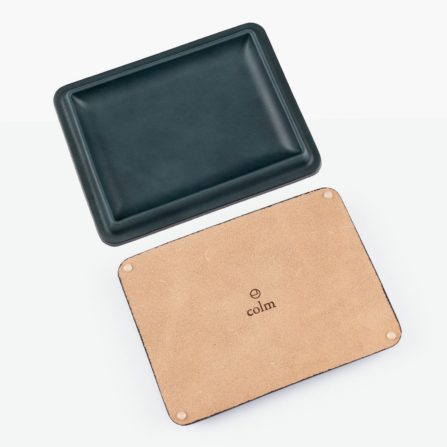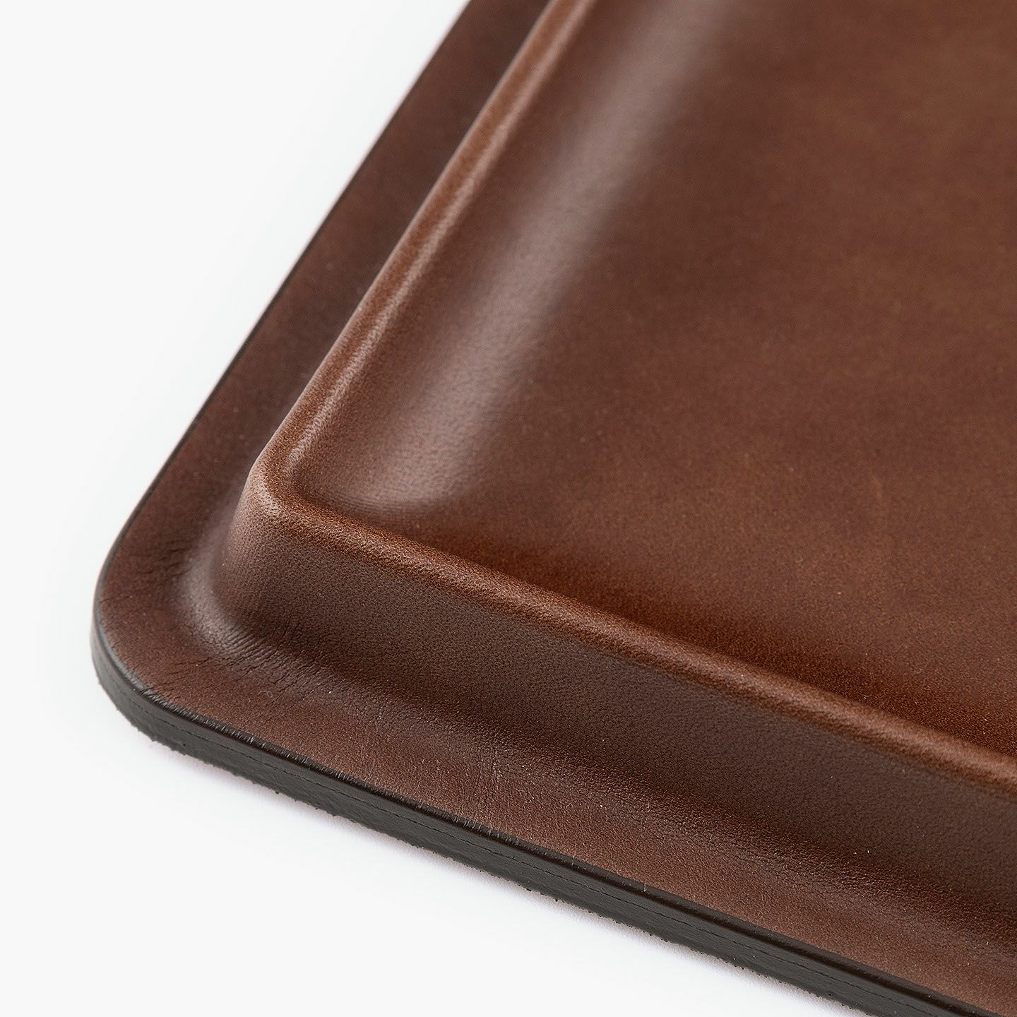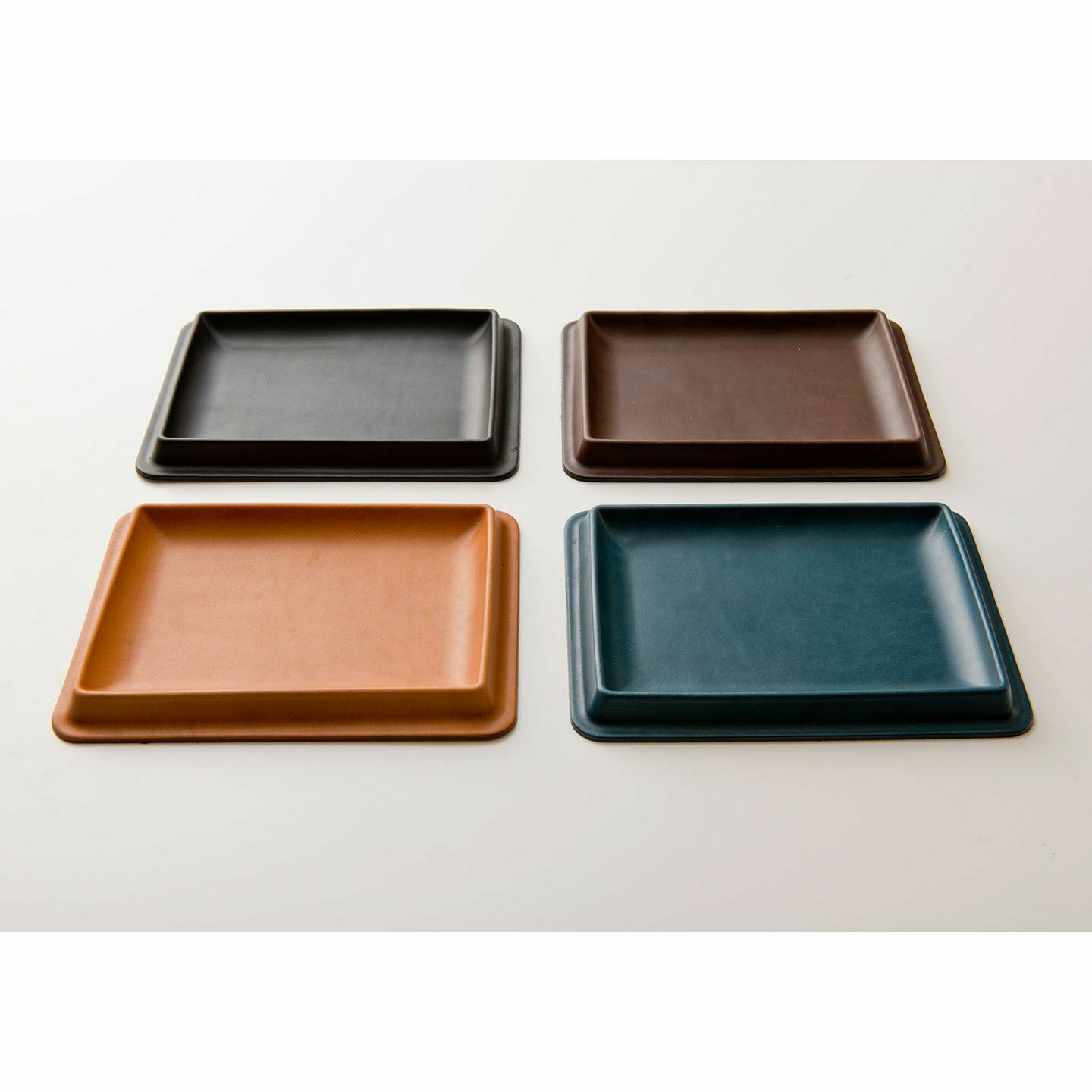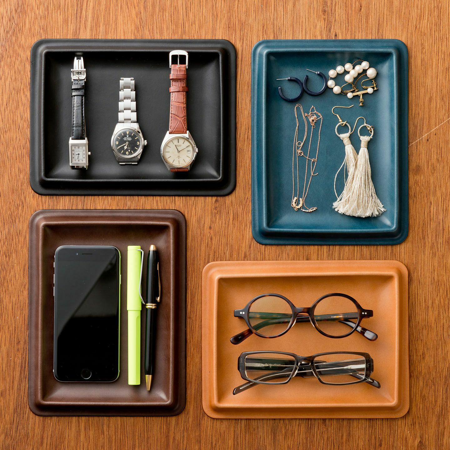 引き出しなどに日常的に使っている大切な物を入れておくのではなく、手が届きやすく目が留まりやすい場所に美しく置いておける、シンプルなデザインの立体的なトレー。素材の「牛ヌメ革」は、デニムのように深みのあるBlue・ナチュラルな雰囲気を醸すCamel・上質な高級感を漂わせるBrown・クールな洒落感あふれるBlackの4カラーから、自分の好みや使い方に合わせて選ぶことができます。また、このLサイズの他に、鍵・指輪・カードなどを置くのに最適なSサイズ・ペントレーやメガネ置きに最適なMサイズもラインナップ。各サイズとも厚さが同じで、Lサイズの長辺・短辺は2サイズの長辺と同じ長さなので、異なるサイズと揃えて使ってもキレイに組み合わせることができ、置いている空間をさらにスタイリッシュにしてくれます。