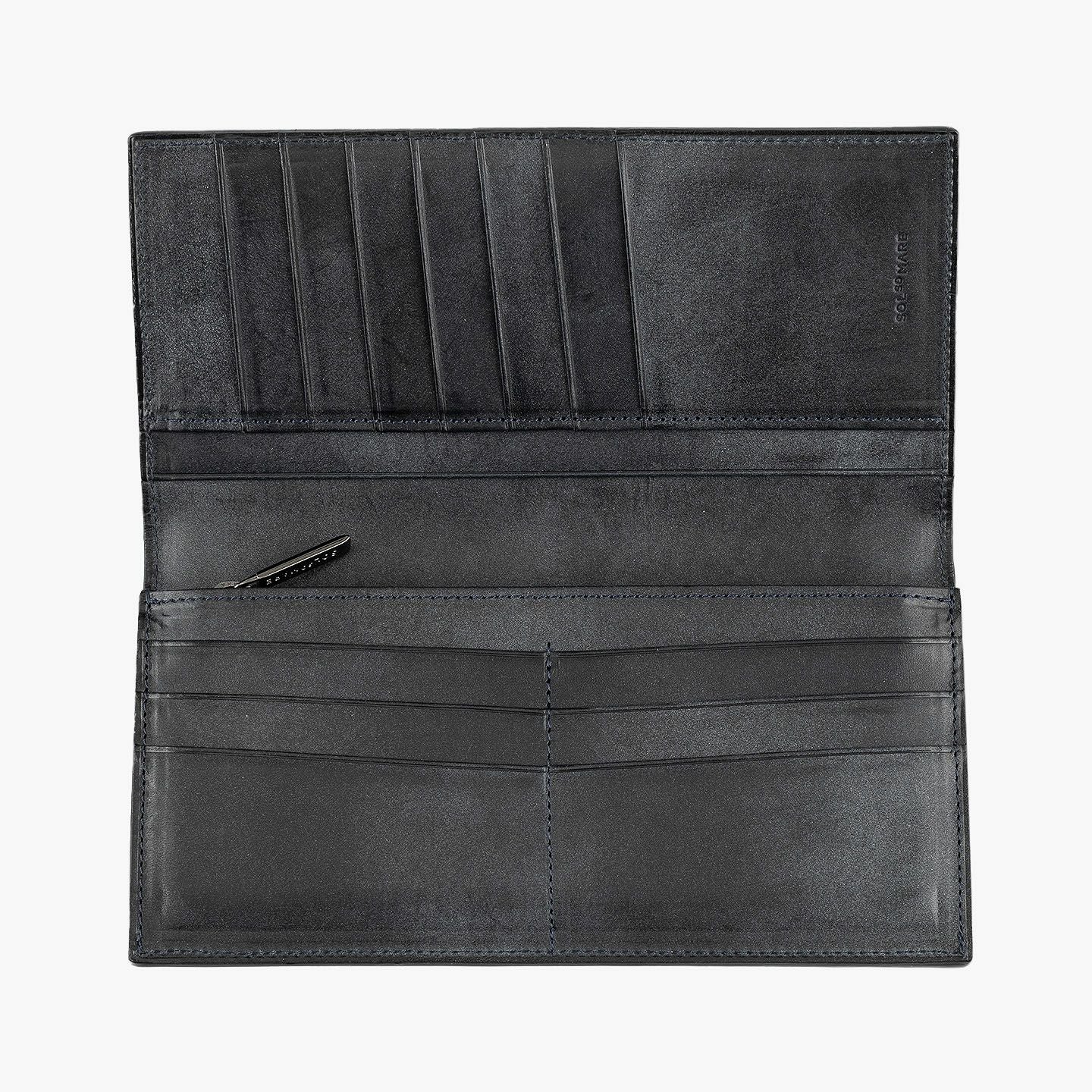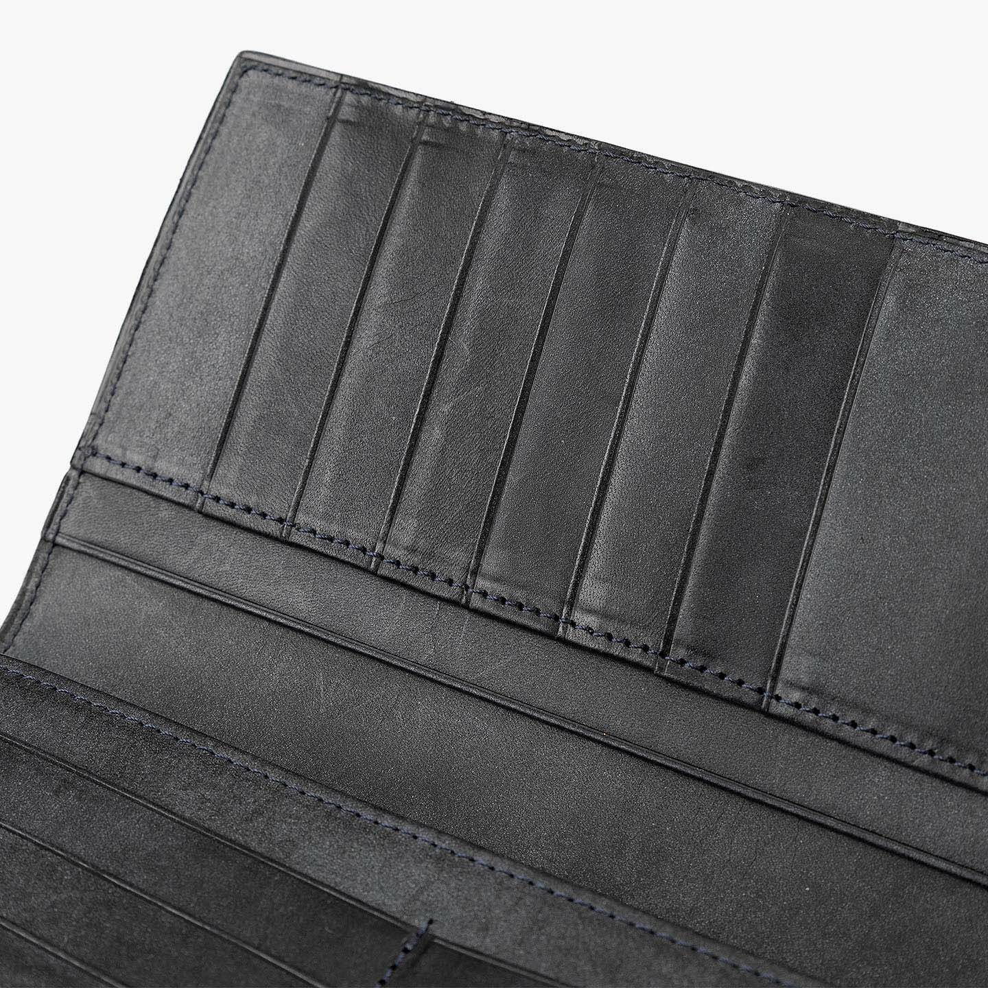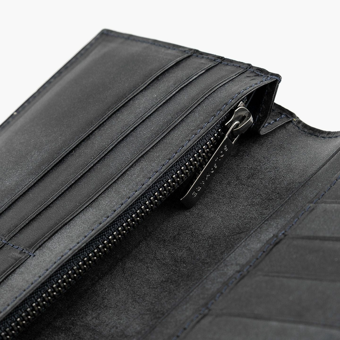 きらめく太陽や海など、自然の情緒と色彩の感動を綴っていく物語を、デザインのモチーフにしている、ファクトリーブランド『SOLSOMARE』のササマチ長財布。使い込むほどに柔らかく手に馴染む「ロロマ」は、Orange・Navy Blue・MLS別注Grigioの3カラーからセレクトでき、色味と透明感が深まっていくエイジングが愛着感を醸成。ポケットやバッグなどにスマートに入れられるスリムなフォルムながら、カードを13枚も収納できるとともに、ファスナー付きコインポケット2・フリーポケット3・札入れマチ付きポケット2による抜群の収納力で、日常でもビジネスでも活躍してくれる。
