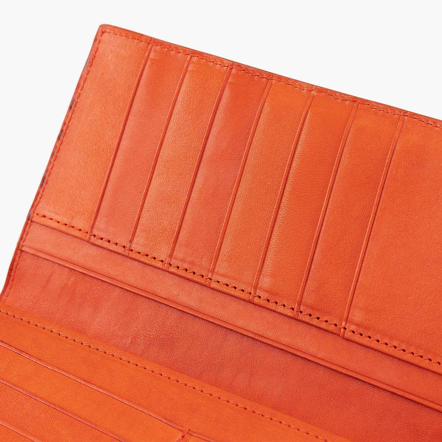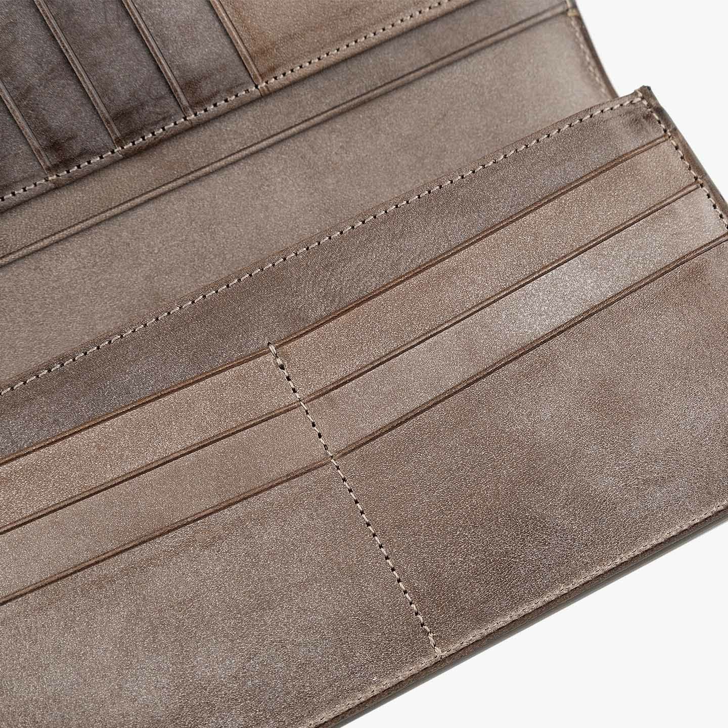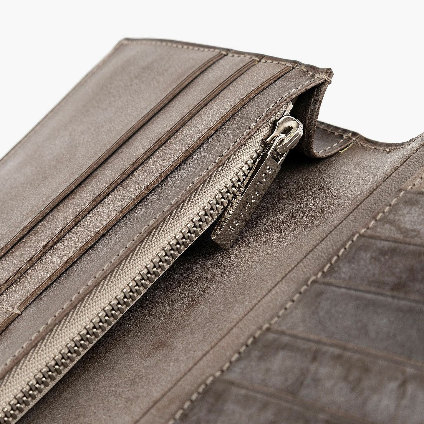 きらめく太陽や海など、自然の情緒と色彩の感動を綴っていく物語を、デザインのモチーフにしている、ファクトリーブランド『SOLSOMARE』のササマチ長財布。使い込むほどに柔らかく手に馴染む「ロロマ」は、Orange・Navy Blue・MLS別注Grigioの3カラーからセレクトでき、色味と透明感が深まっていくエイジングが愛着感を醸成。ポケットやバッグなどにスマートに入れられるスリムなフォルムながら、カードを13枚も収納できるとともに、ファスナー付きコインポケット2・フリーポケット3・札入れマチ付きポケット2による抜群の収納力で、日常でもビジネスでも活躍してくれる。
