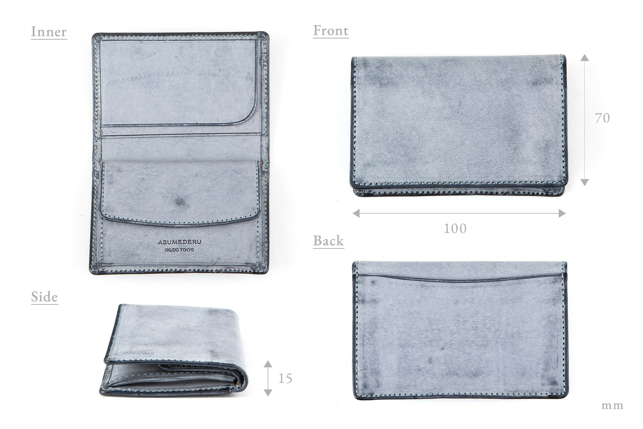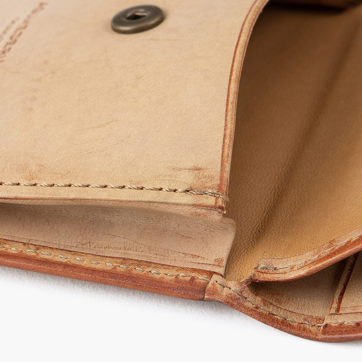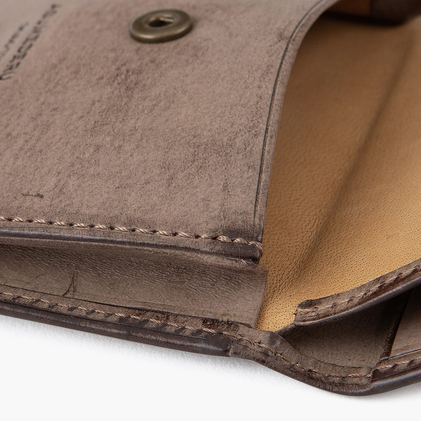 イタリア・トスカーナ地方サンタクローチェ地区のタンナー、イタルペル社製の「トゥクソン・ワックス」。繊維密度が高く丈夫なダブルショルダー(成牛の肩部)を用い、伝統的なバケッタ製法で作られたフルベジタブルタンニン鞣し牛革の表皮に、時間をかけてパラフィンワックスを垂らしながら仕上げています。バームクーヘンの作り方のように、ロールにして回しながら上からワックスを滴下していく技法で、回転させる加減により常温時に白くなるワックスが白い濃淡が生まれて、個性的な表情を創出。使用前の淡白い風合いと、使い込んで革色の浮き出てきた風合いが、劇的に変化する個性的な素材で、ワックスが革の内部に溶け込んで、革だけでは表現できない独特なツヤが魅力です。また、ダブルショルダーは首に近い部位でもあるので、“トラ目”と呼ばれる原皮のシワも味として残ることがあり、アイテムとして新たな楽しみ方も見つけられます。