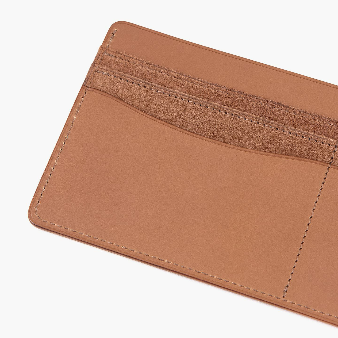 縫製で厚くしない工夫から、裏地も用いずに「ベビーカーフ」の床面を効果的に活用。ツヤのある銀面とスエード調の床面は、色彩に立体感を与えるデザイン性とともに、カードや紙幣などが滑り落ちにくい実用性も兼ね備えています。