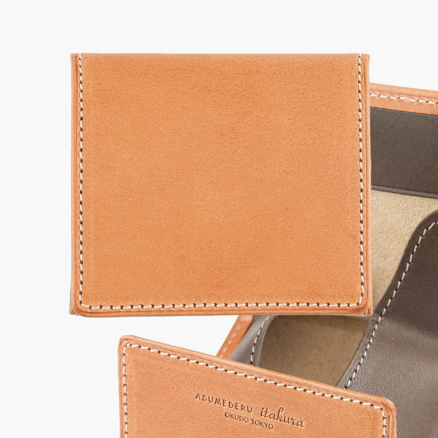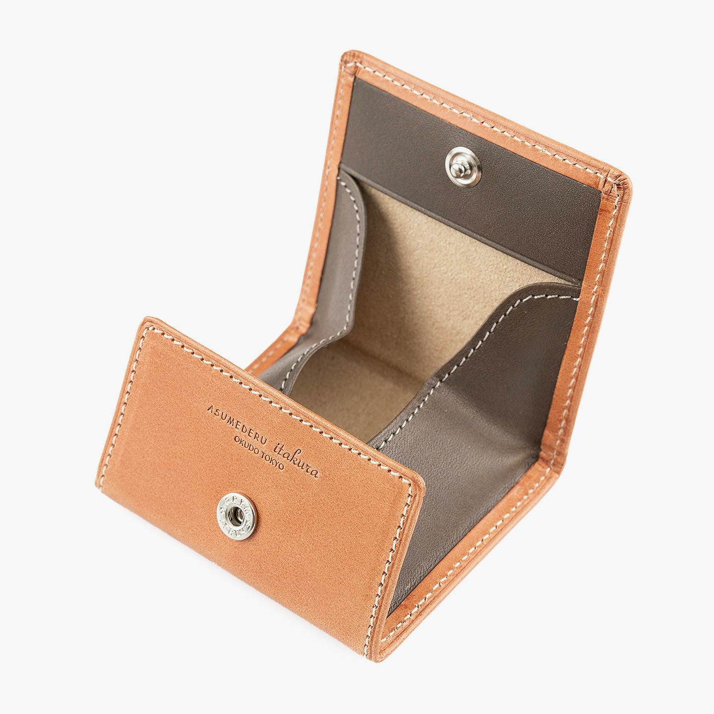 挑戦し続けるという想いや技術・感性を注ぎ込みながら試行錯誤を重ね、40年以上も財布を作り続けている革製品ブランド『ASUMEDERU』のコインケース。収納物の出し入れしやすさを徹底的に追求したボックス型小銭入れは、垂直ではなく斜めに大きく開く舟形の設計にすることで、とても小さいサイズ感ながらマチも倒れず扱いやすい機能美を実現。パンツのサイドポケットにも楽に入れて軽やかに携えられるスマートな外装として、イタリア・ワルビエ社の伝統的な技法による最高級ヌメ革「ブッテーロ」を贅沢に纏わせ、しっかりとした手触りと新鮮なツヤ感による上質感あふれる魅力で、愛らしいフォルムを際立たせてくれる。
