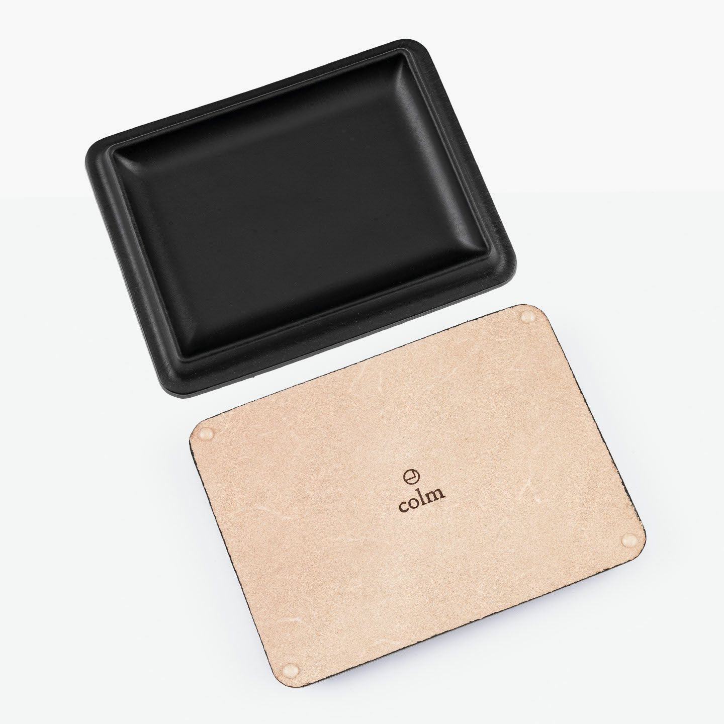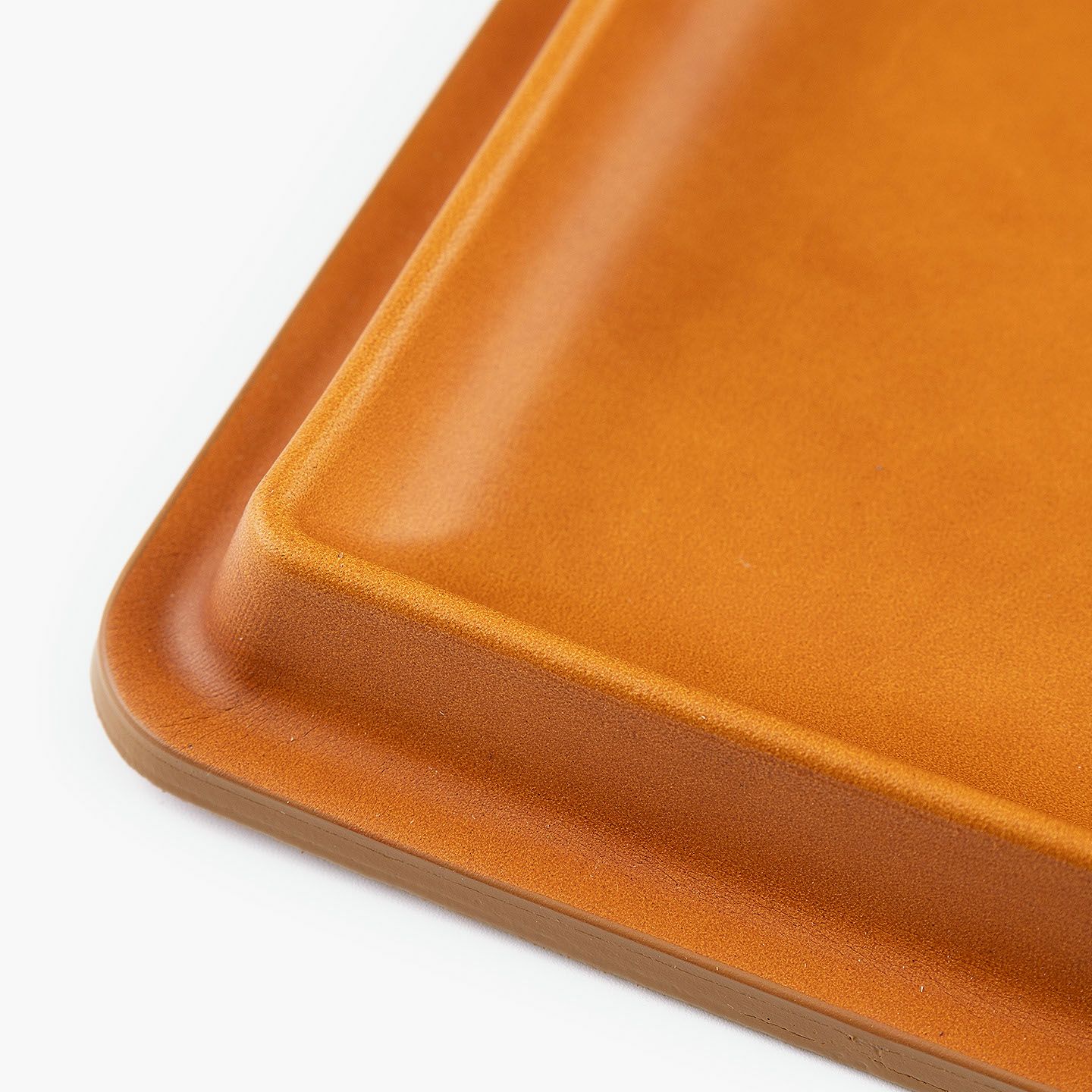 引き出しなどに日常的に使っている大切な物を入れておくのではなく、手が届きやすく目が留まりやすい場所に美しく置いておける、シンプルなデザインの立体的なトレー。素材の「牛ヌメ革」は、デニムのように深みのあるBlue・ナチュラルな雰囲気を醸すCamel・上質な高級感を漂わせるBrown・クールな洒落感あふれるBlackの4カラーから、自分の好みや使い方に合わせて選ぶことができます。また、このLサイズの他に、鍵・指輪・カードなどを置くのに最適なSサイズ・ペントレーやメガネ置きに最適なMサイズもラインナップ。各サイズとも厚さが同じで、Lサイズの長辺・短辺は2サイズの長辺と同じ長さなので、異なるサイズと揃えて使ってもキレイに組み合わせることができ、置いている空間をさらにスタイリッシュにしてくれます。