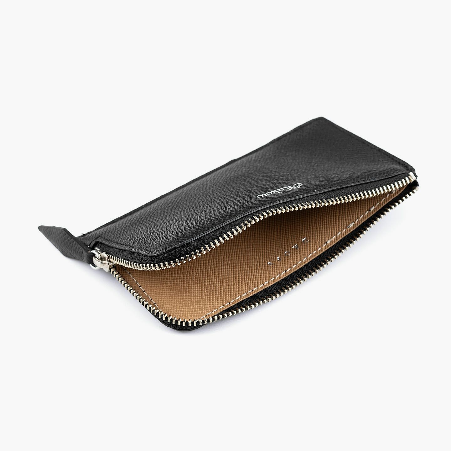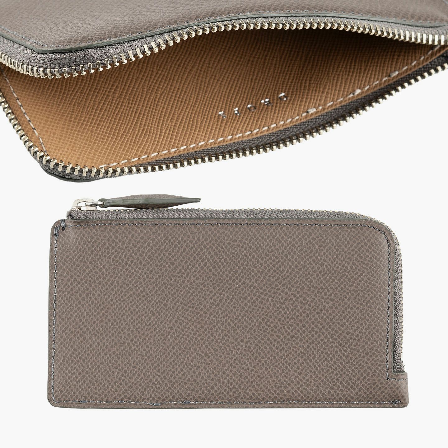 ヨーロッパの有名老舗メゾンにも人気がある、フランス・アース社製の「ダービー」を、外装として纏ったフラグメントケース。宝石のロゼンジカットを模した引き手にも、同じマテリアルを象徴的にあしらい小粋なアクセントに。細かな型押しのマットな表情が、小石模様の陰影を想わせる美しさとともに、小キズ・水分への強さと堅牢さで、ラフに扱える気楽さも魅力。スーツのポケットやバッグのなかに入れてもかさばらないスリムなフォルムと、カード・小銭・紙幣(三つ折り)を収納できる使いやすいサイズ感が、普段使いを楽しくしてくれるアイテムへ。気持ちを上げてくれるスタイリッシュな佇まいが、心に彩りをもたしてくれる。