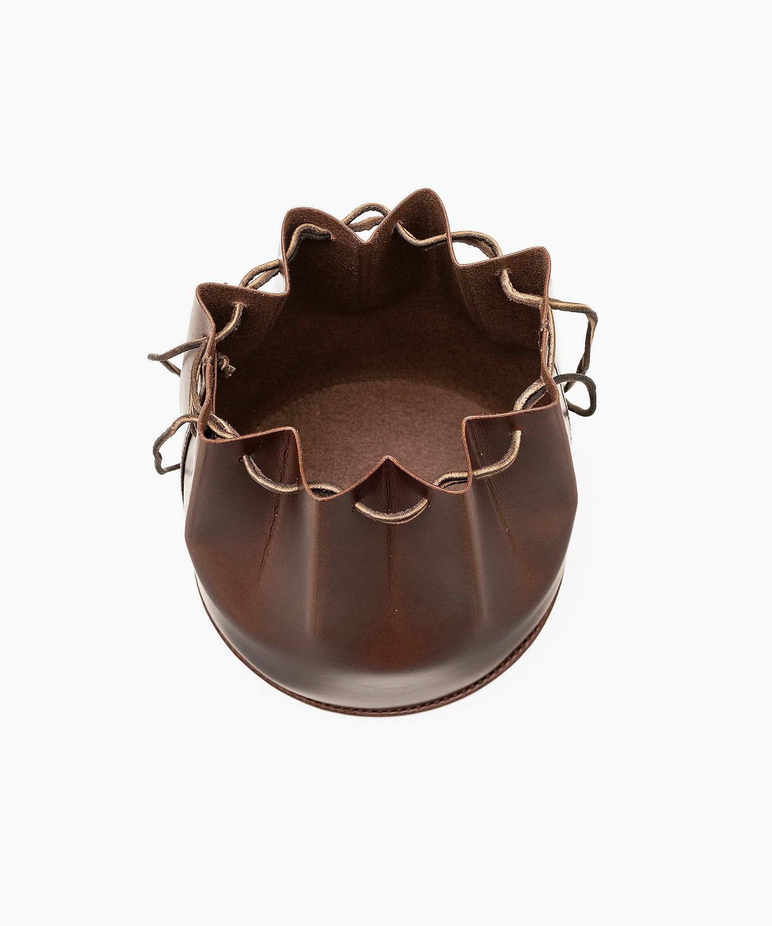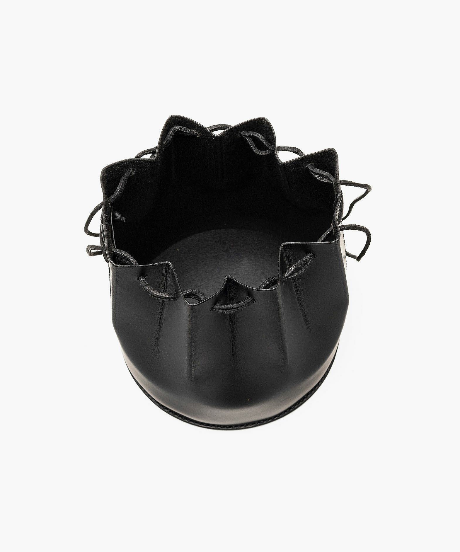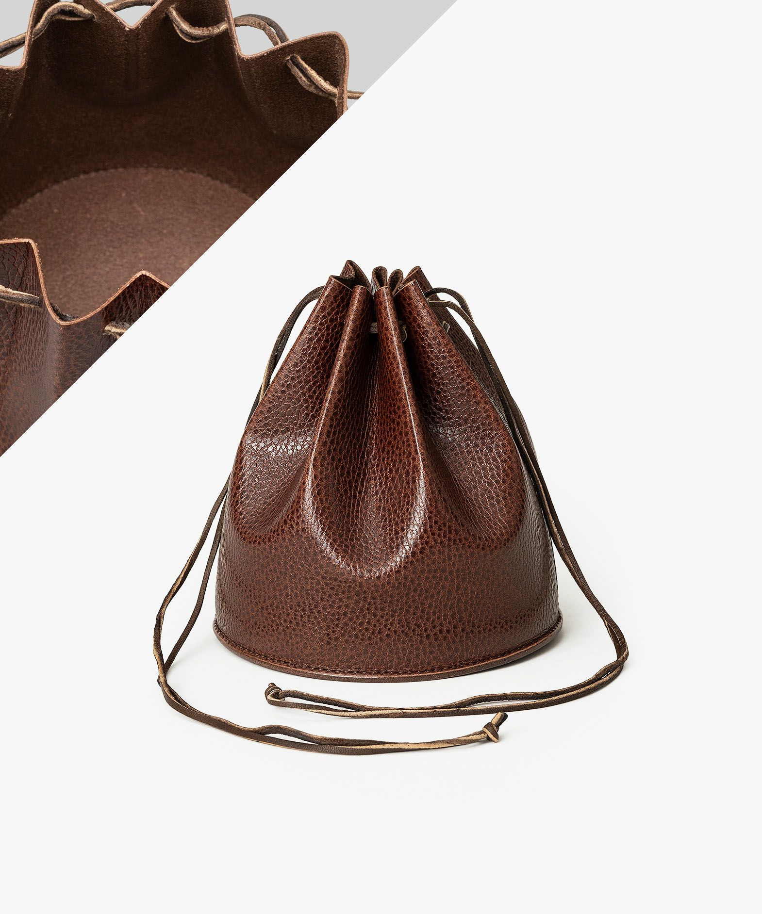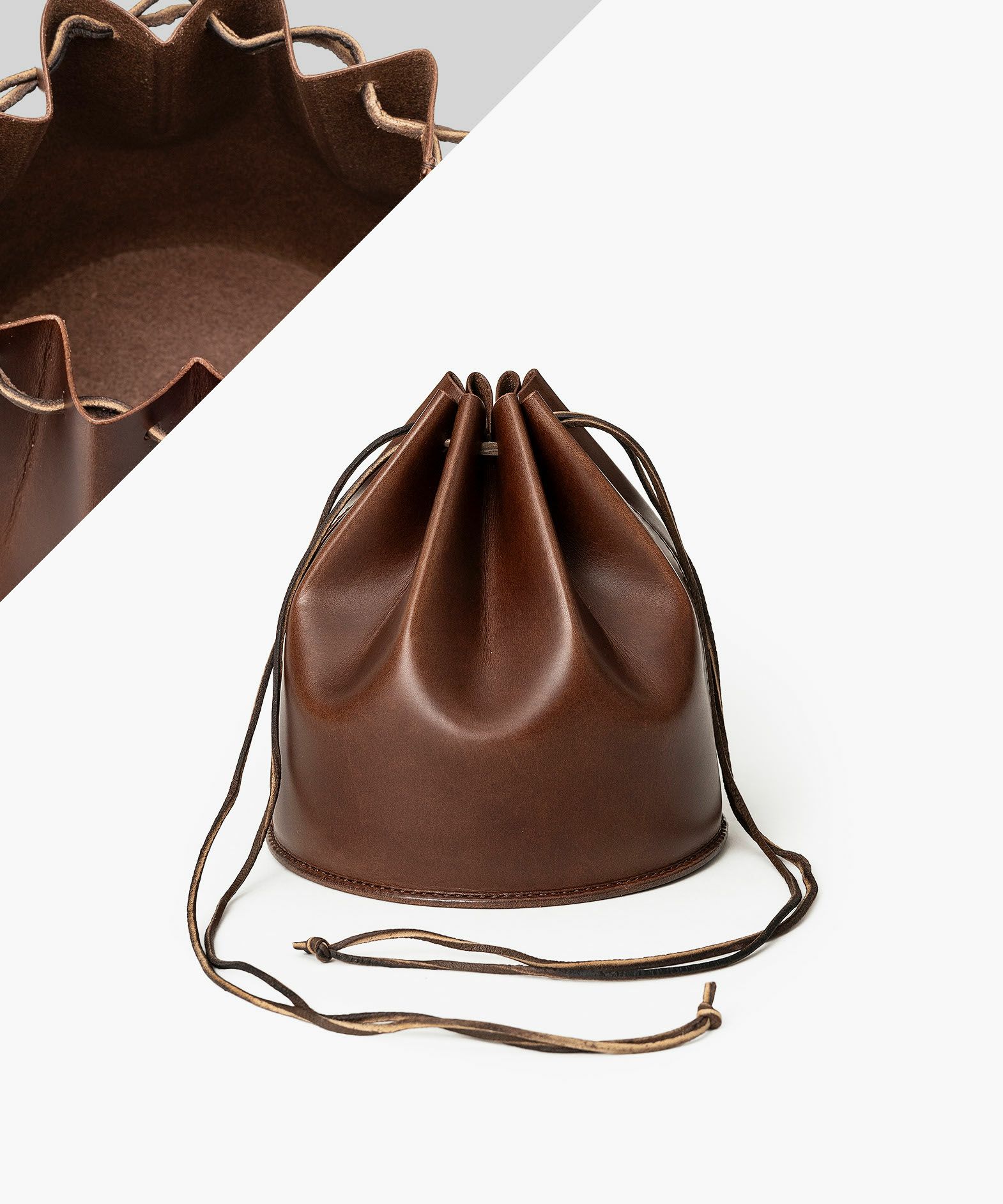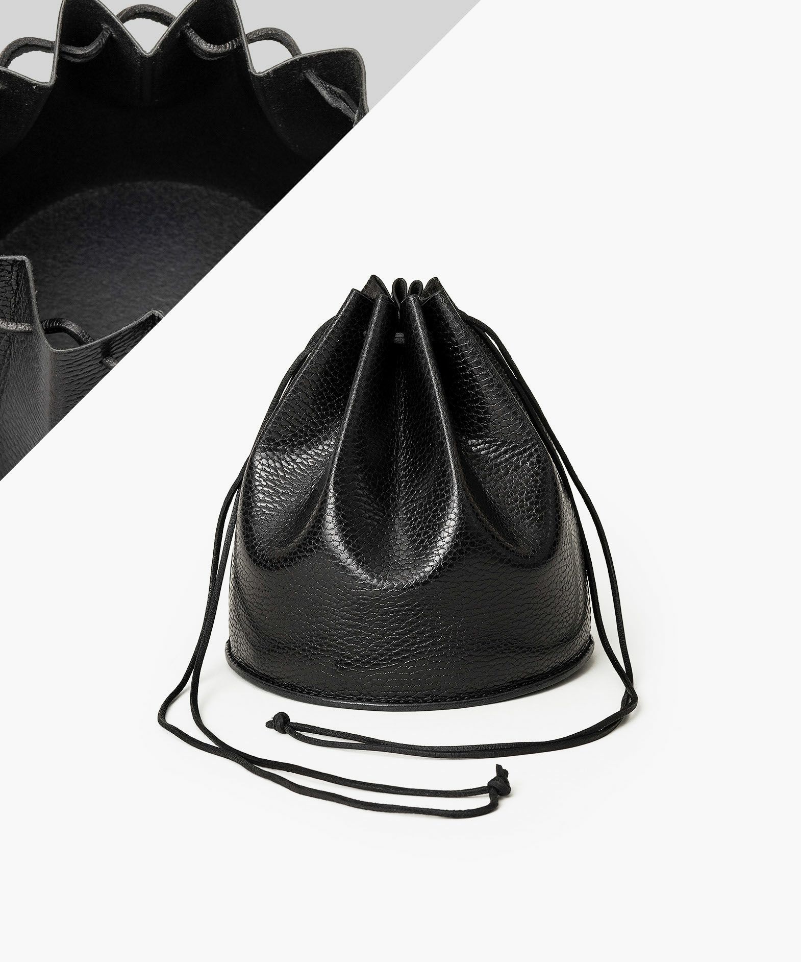 シャープで美しいドレープ(ヒダ)が、立体的なフォルムを引き立てながら、ミニマルなデザインをさらに洗練させている、巾着バッグ“AKATSUKI”。ハリ・コシのあるハードで上質なイタリアンレザーを用いて、総手縫いとともに底面を円形にすることで、しっかり自立する構造美を叶えながら、印象的な佇まいの存在感へ。ブラック・ダークブラウンの2色から、スムース・型押しの2タイプと組み合わせて、自分好みのセレクトオーダーができるのも魅力。オプションのアタッチメントストラップを装着すれば、手持ち・肩掛け・斜め掛けもしやすくなり、軽やかに持ち歩きたいときに活躍。コンパクト財布やスマートフォンを収納できる実用性と、使う人を選ばないユニセックスな汎用性が、洒落感あふれる大人のセンスを纏わせてくれる。
