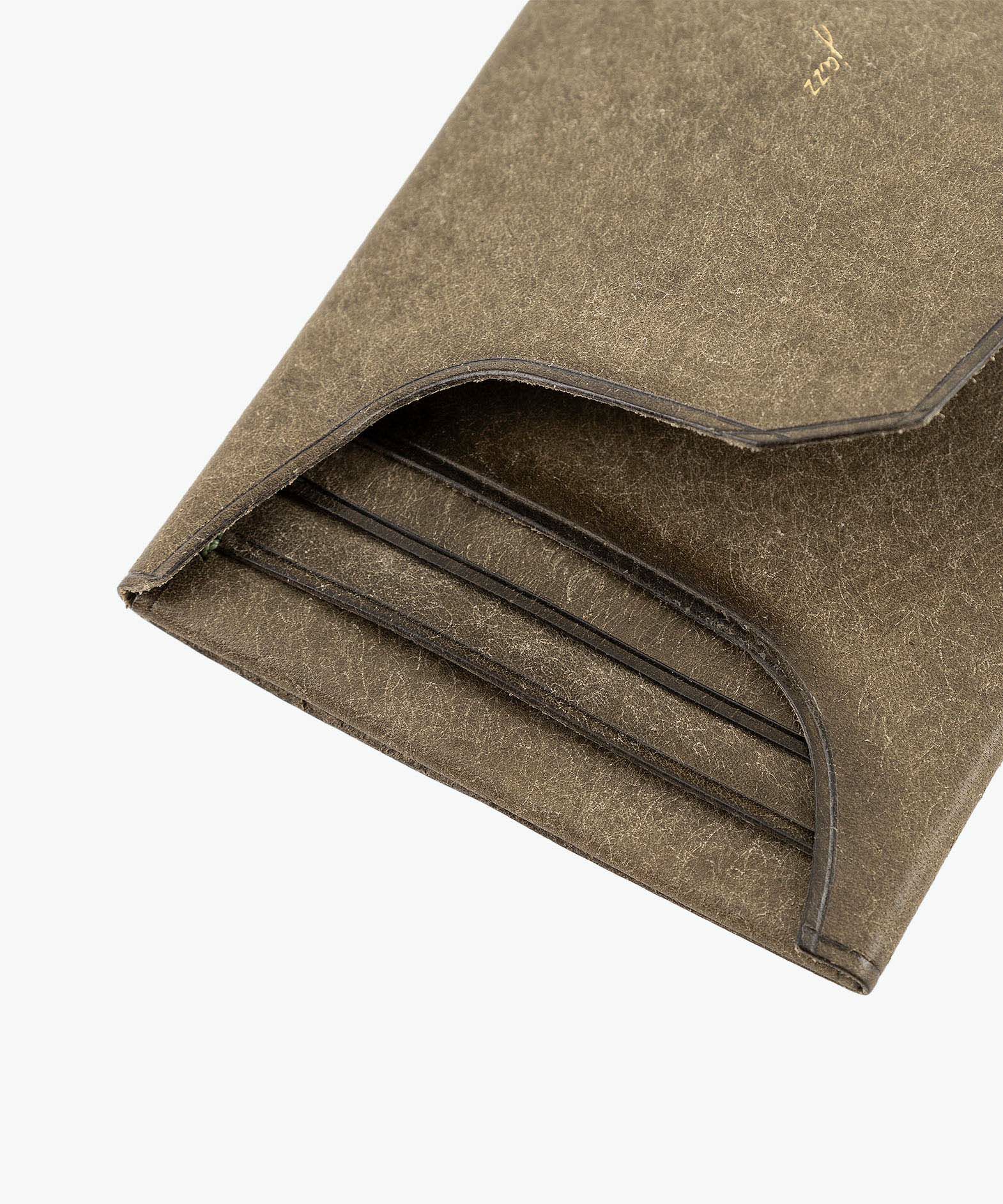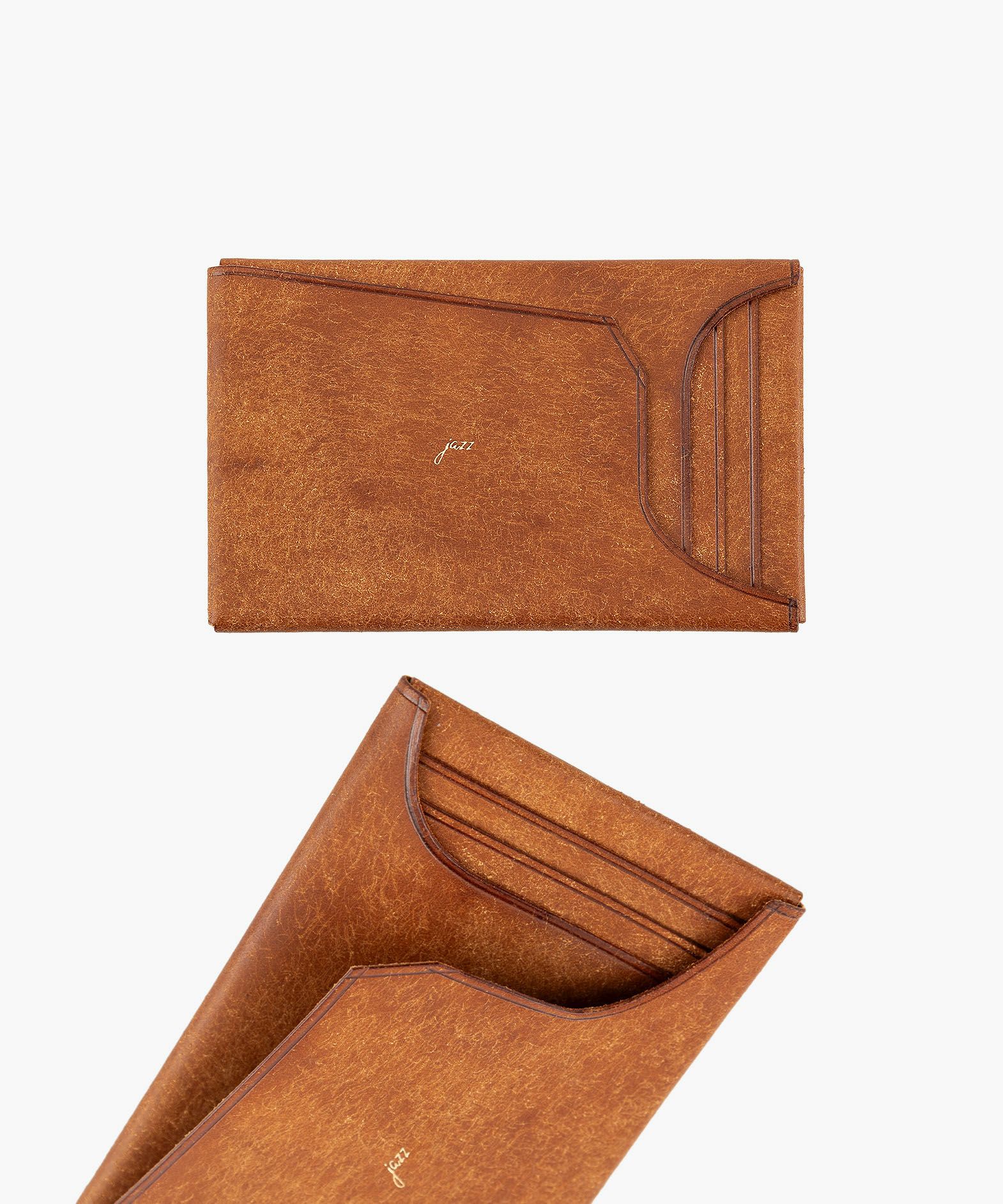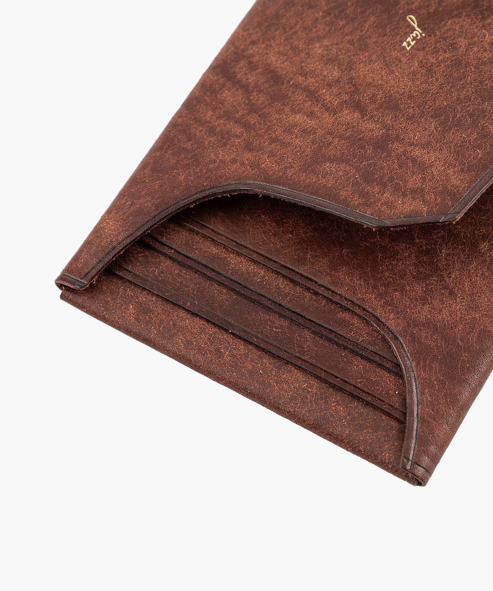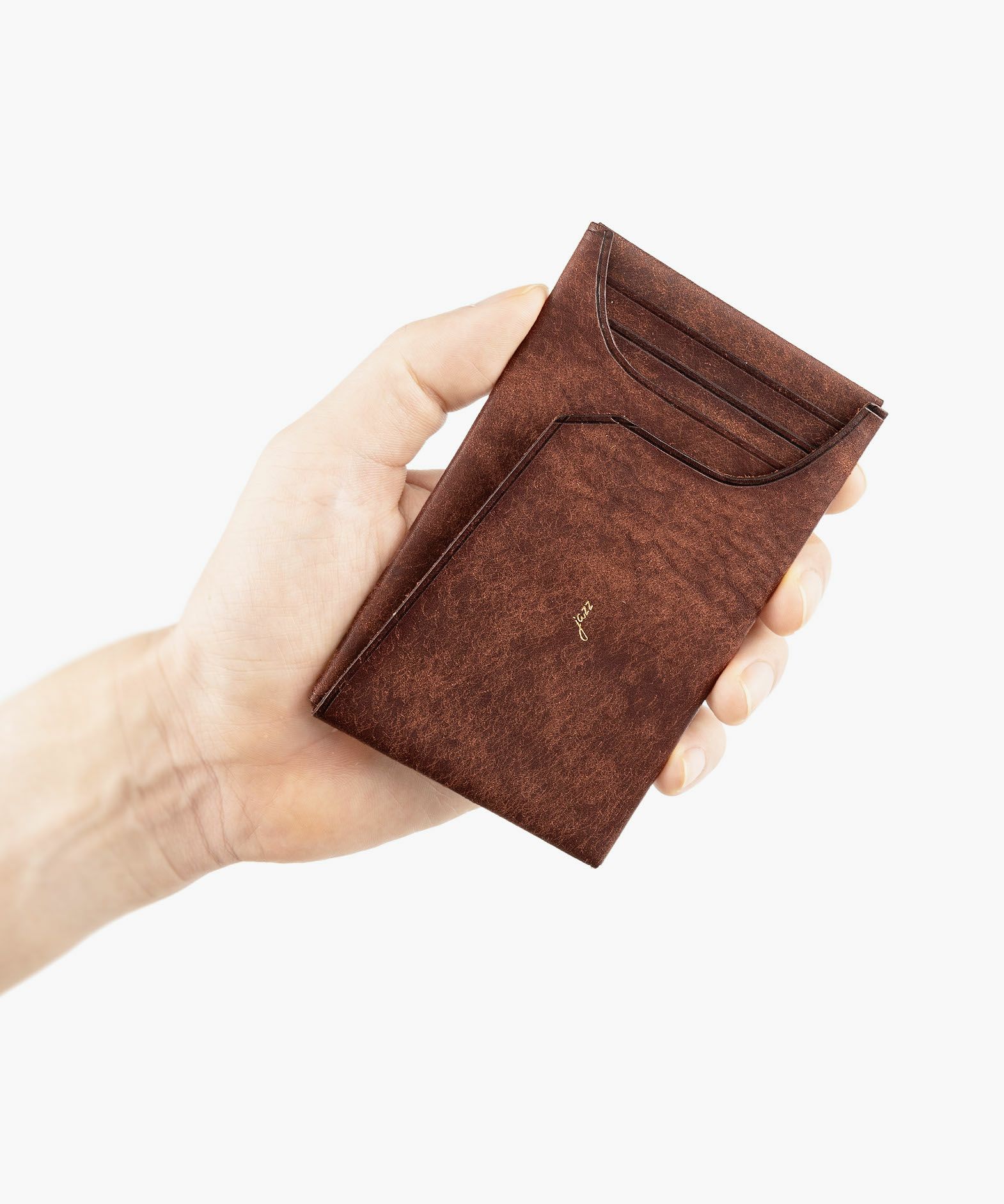 和紙のように表面を起毛させた独特な風合いが魅力的な「プエブロ」の一枚革を、折り紙のように折り畳んで独創的なデザインへと昇華させている、名刺入れ“リスカム 1.0”。サラザラした肌触りから、使い込むほどに美しいツヤ肌になっていき、ビンテージ感が漂う経年変化を楽しめる。丁寧に総手縫いを施しながら、あえて縫い目を見せないようにすることで、洗練されたスタイリッシュ感も創出。胸ポケットにも軽やかに収まり、スマートに使いこなせる所作は、さまざまなビジネスシーンで洒落た印象へ。5色(Cognac・Grigio・Napori・Black・Tabacco)からセレクトでき、カードケースとしても使えるので、自分用としてはもちろん、大切な人へのプレゼント用としても、ひとつ上のセンスを発揮させてくれる。