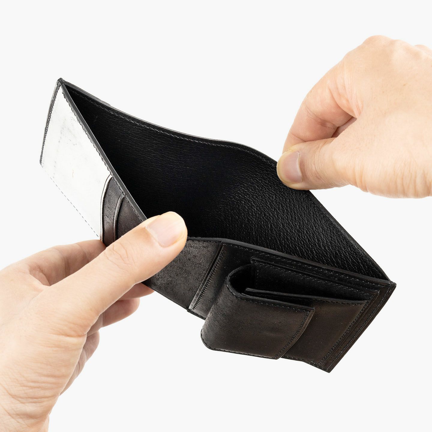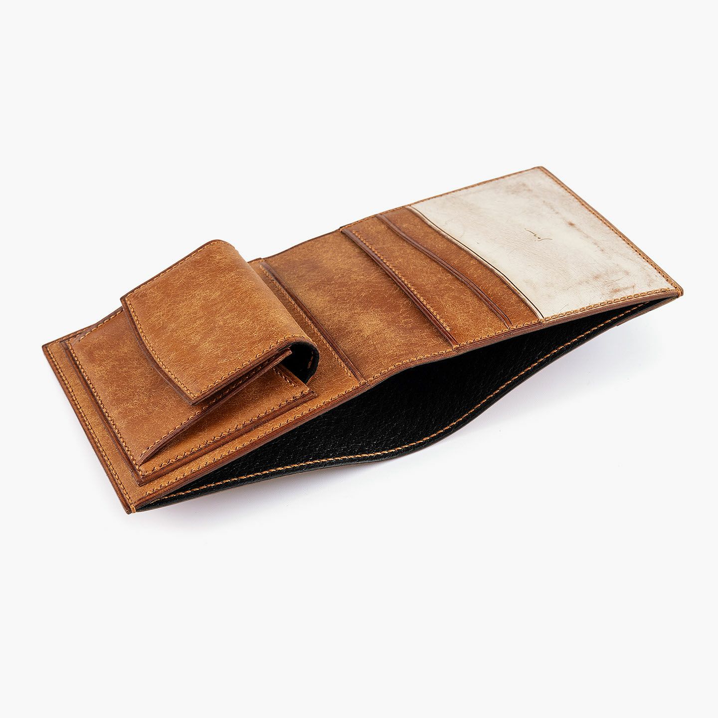 外装のアクセントとして高級エキゾチックレザー「クロコダイル」を纏わせ、コンパクトなサイズ感ながら存在感を漂わせている、二つ折り財布(小銭入れ付き)“ワイスホルン 1.1”。その腑模様とは相反する外装・内装の「プエブロ」は、和紙のように表面を起毛させた独特の風合いを醸しながら、ビンテージ感あふれる美しいツヤ肌へと経年変化していく楽しみも。曲線を施したカードポケットのカットラインが、見た目のデザイン性と出し入れしやすい機能性を両立。そのカードユニットの最下段には、内装のアクセントとしてホワイトワックス仕上げを施した「ブーロ」を採用。使い込むほどに内装と同系色の色味が露出していき、「プエブロ」とは異なるエイジングへ。外装・内装それぞれ異なるアクセントが、独創的な感性を演出してくれる。