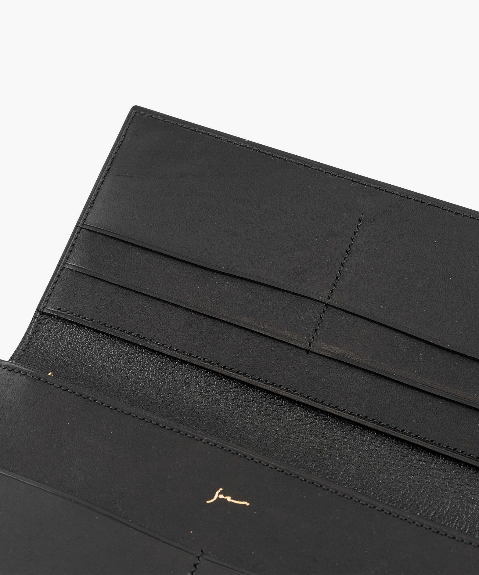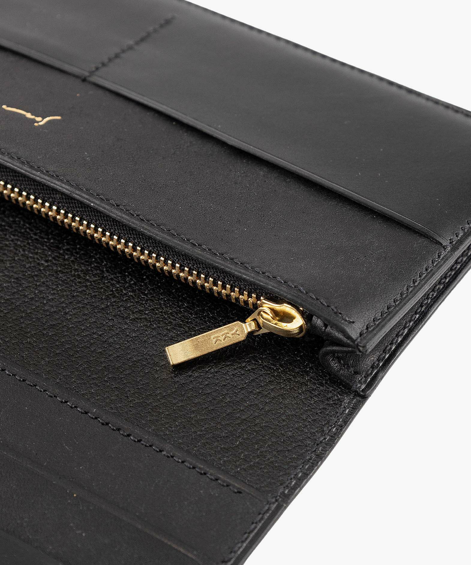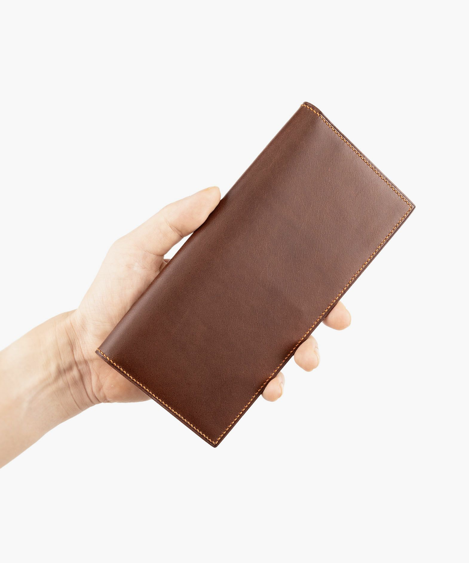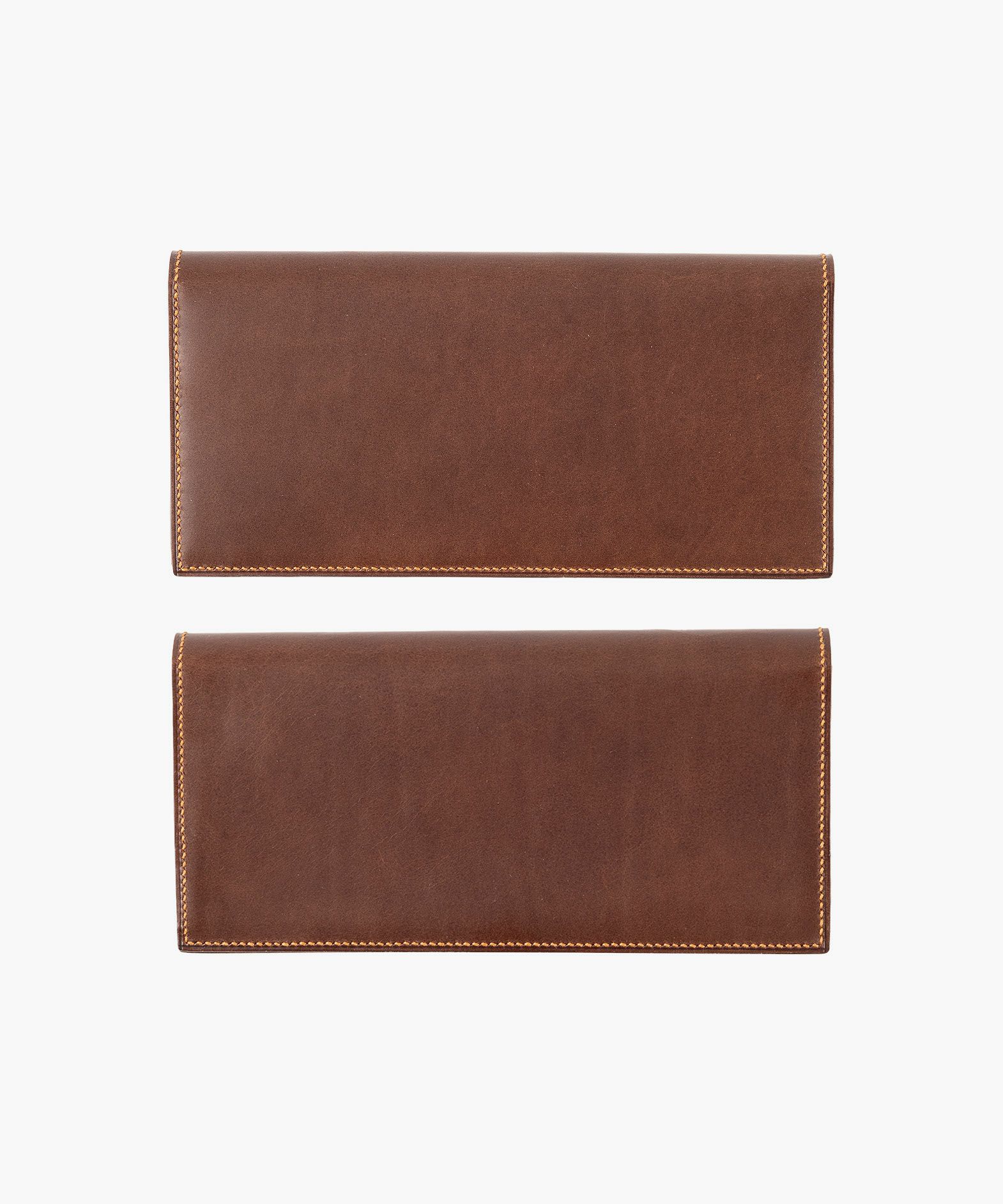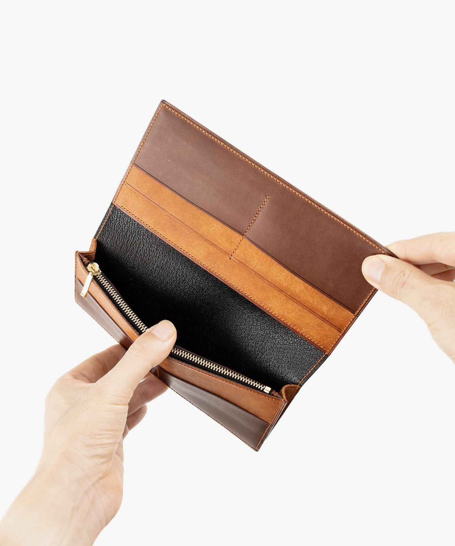 スリムでベーシックなフォルムに、ファスナータイプのコインケースと横型のカードポケットを備えさせた、長財布(小銭入れ付き)“ウィルヘルム 2.0”。イタリアスムースレザーの最高峰「ブッテーロ」による素晴らしい上質感を、外装だけでなく内装にもあしらい、同じく内装として採用している「プエブロ」の細かな毛羽立ちと、美しく組み合わせているのも魅力。異なる風合いと色合いを融合させることで、程よいビンテージ感を漂わせ、味わい深い独特の魅惑感へ。好みに合わせて2カラーからセレクトできる2種類のレザーは、想像以上にオイルを含んでいるので、使い込むほどにエイジングを堪能できるのも特長。シンプルな機能性とスタイリッシュなデザイン性が、何気ない普段使いに愛おしさも育んでくれる。