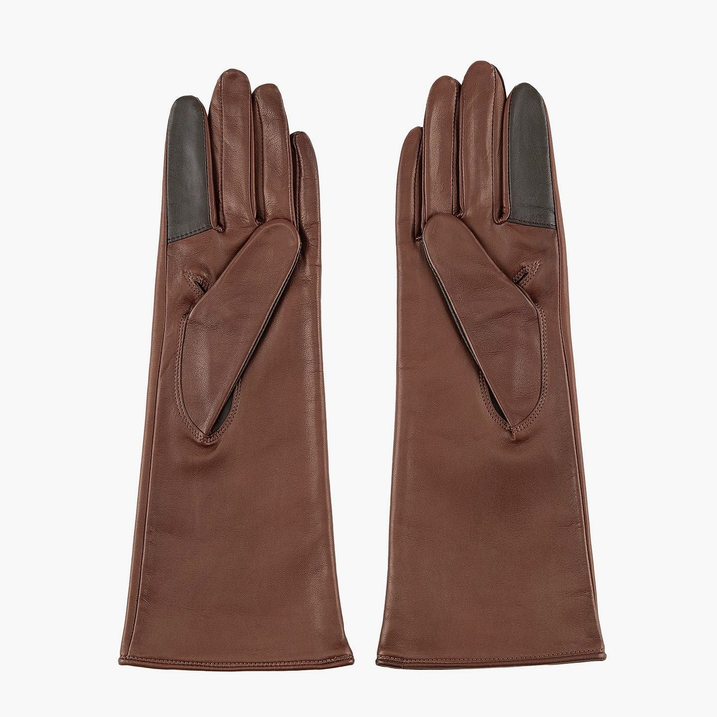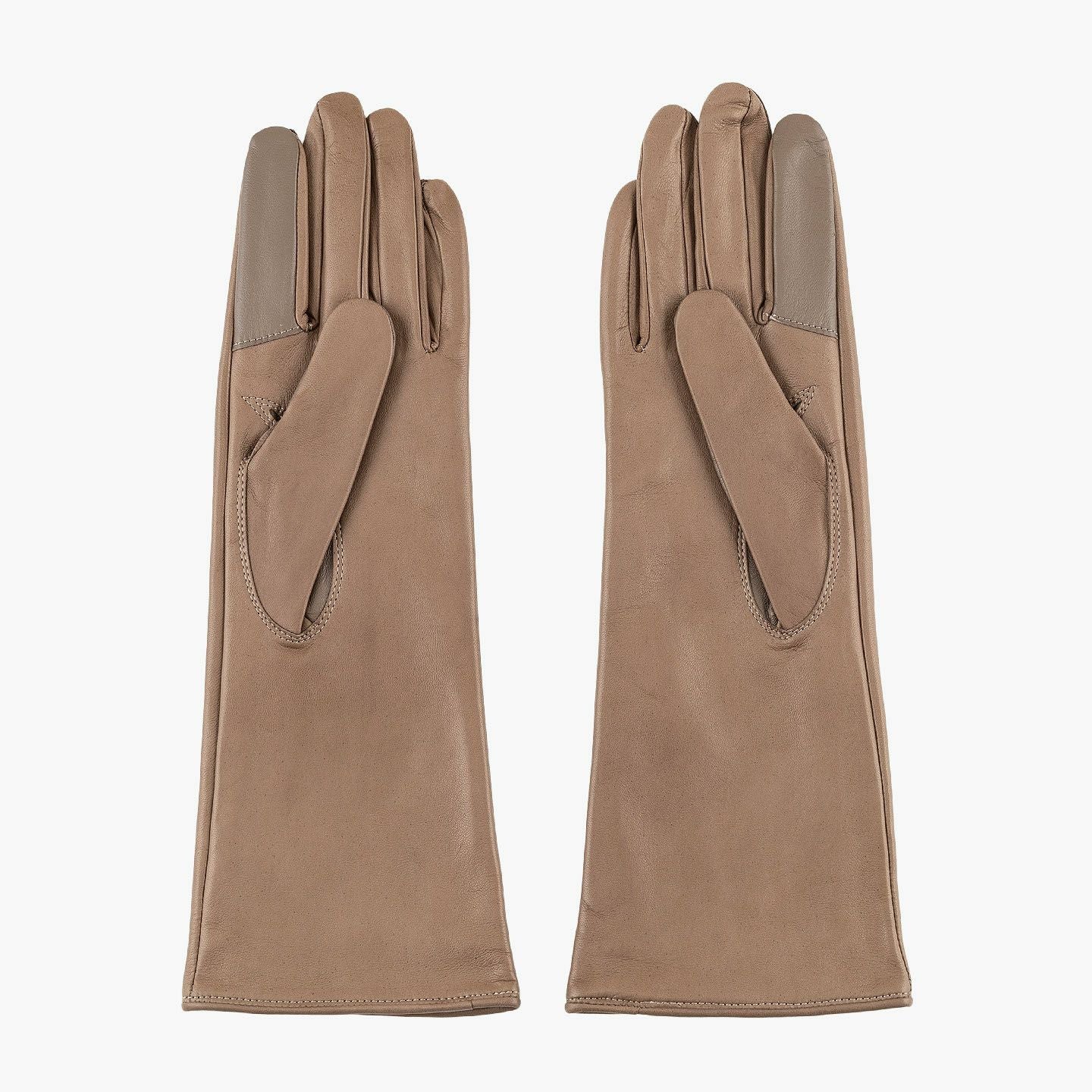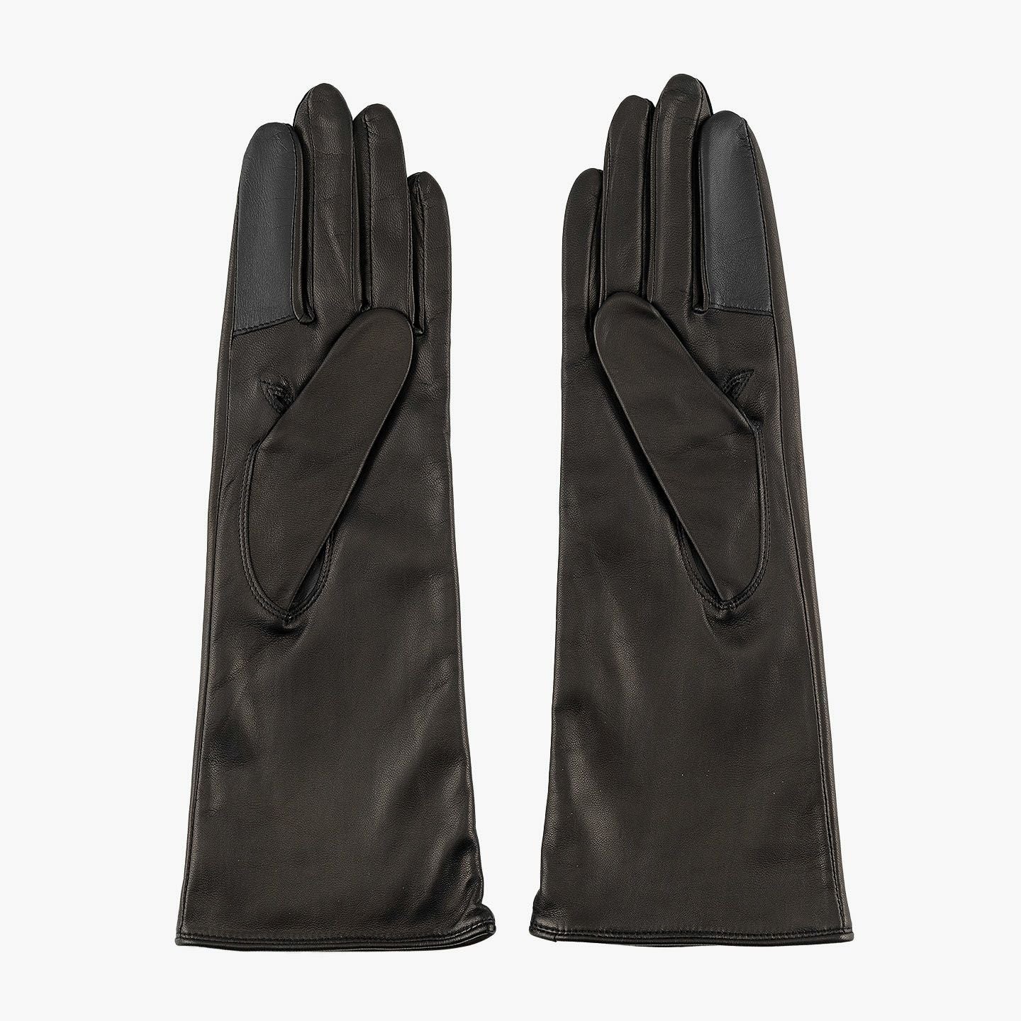 イタリア・ポルトラーノ社による発色の良い羊革「イタリアンラムレザー」を、ロングレザーグローブとして贅沢に使用した、イタリアンシープ手袋 “Long-Touch Panel”【WOMEN】。柔らかく滑らかでモチモチとした触り心地と、使い込むほど手に馴染んでいくことも魅力。手のひらサイドの親指・人差し指には導電革を施しているので、装着したままスマートフォンなどのタッチパネル操作も可能。裏地には、手をスムーズに入れやすく肌への刺激も少ない、吸湿発熱効果のあるベンベルグを採用。“ピケ縫い”という指先を長くキレイに見せる、こだわりの縫製を用いて日本で丁寧に仕立てることで、スッキリとした細身のルックスで女性の手をさらに引き立ててくれる。