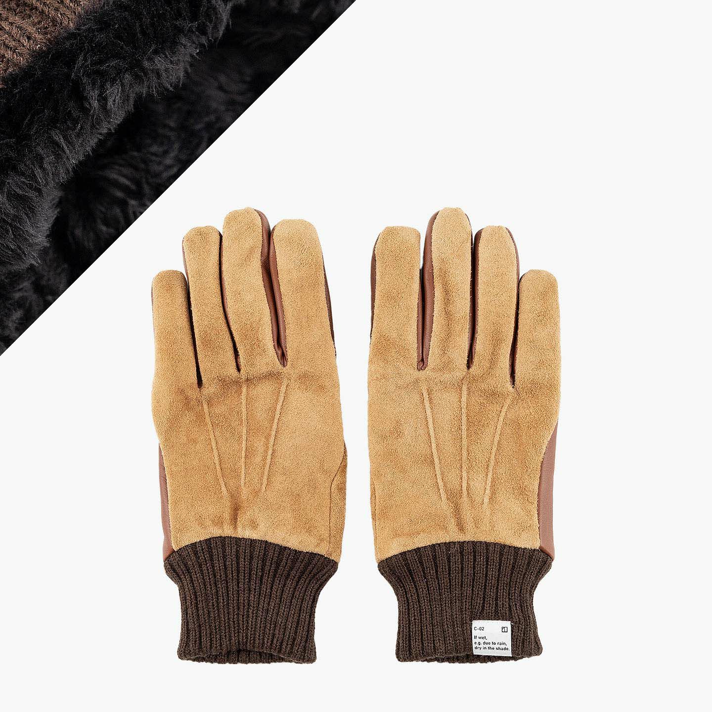 豚革のスエードと柔らかな羊革を組み合わせた、異素材によるコンビネーショングローブ、ピッグスエード×シープ手袋 “Cuffs-Touch Panel”【MEN】。手のひらサイドの親指と人差し指に特殊な加工を施した導電革を採用し、寒いなかでもグローブを装着したままスマートフォンなどのタッチパネル操作が可能。手首まわりにリブニット切り替えでフィットさせるカフス付きの設計で、手袋のなかの温かさを逃さず、冷たい外気の侵入も防いでくれるので防寒性もアップ。さらに、裏地にはマイクロボアを使用していて、保温性も抜群。また、スタイリュシュな3種類のカラーから選ぶことでき、自分らしい配色のコーディネートで冬場のファッションを彩ってくれる。