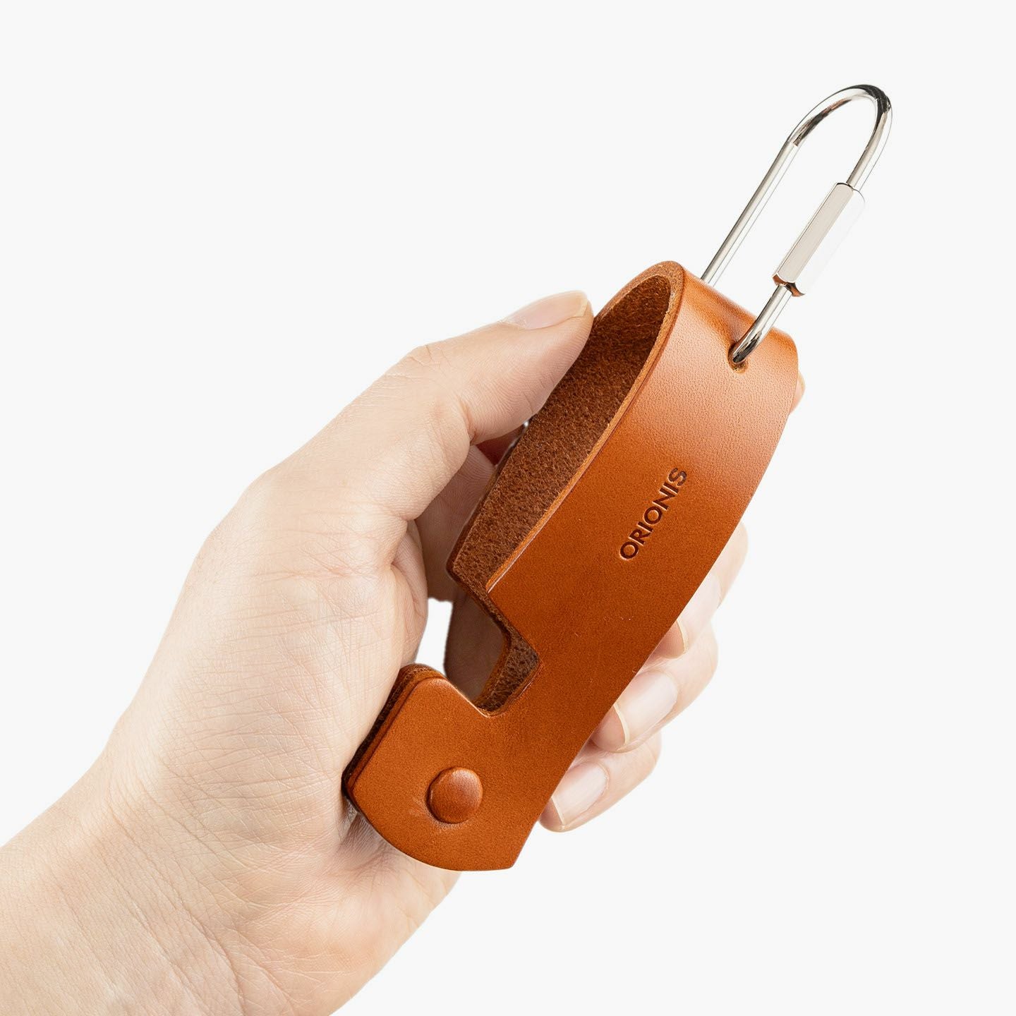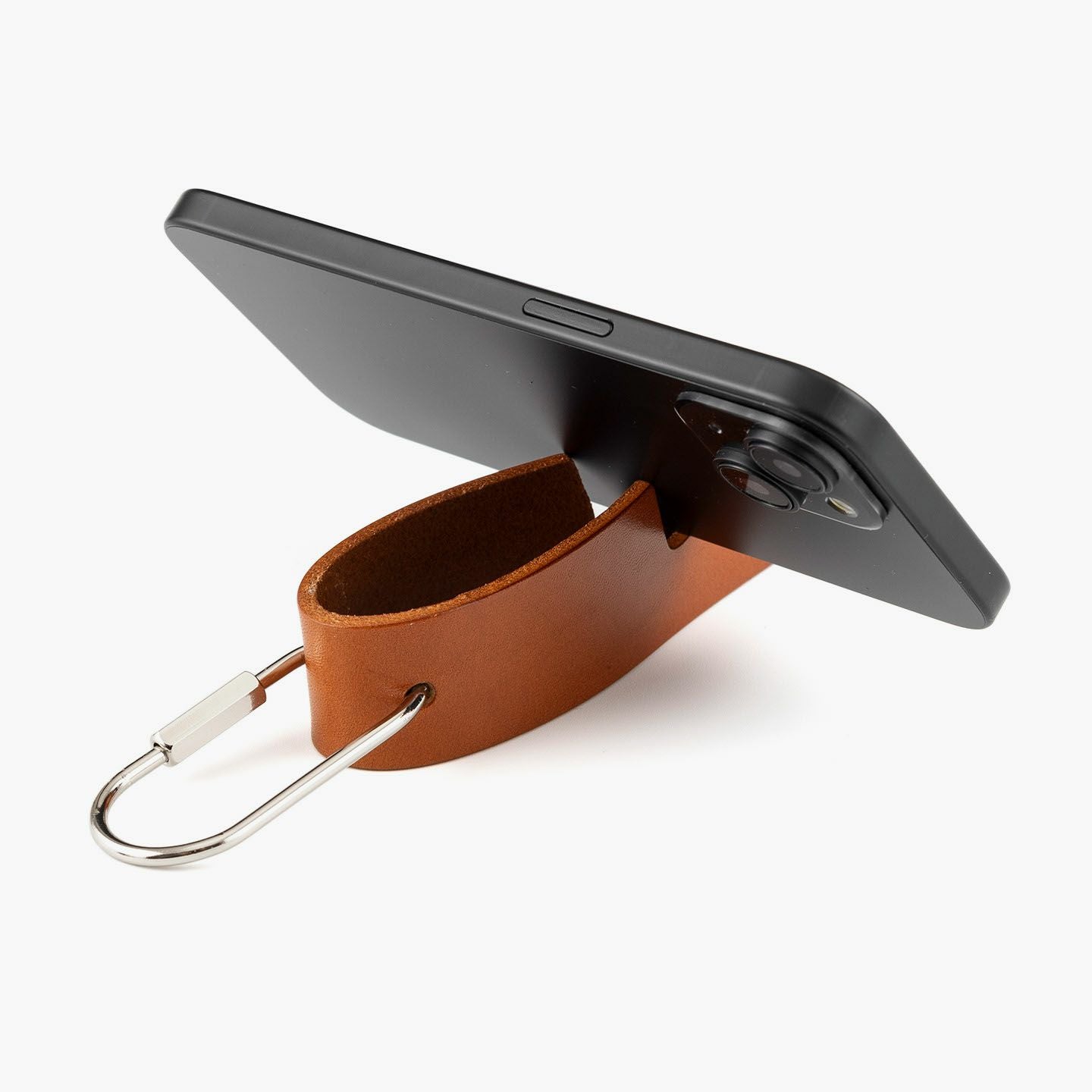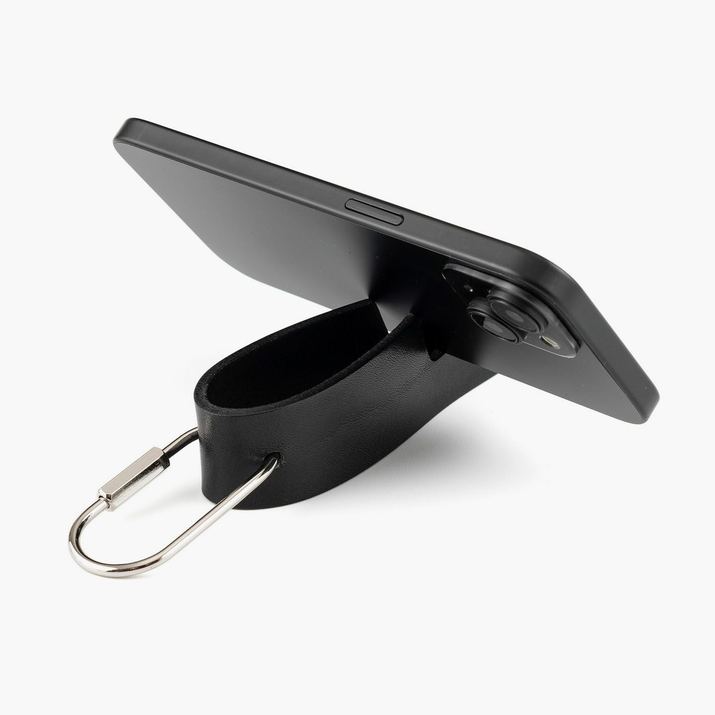 横置きにも縦置きにも自由にスマートフォンを立て掛けて、動画視聴やビデオ通話などができる、便利なスマホスタンドキーホルダー。厚みのあるイタリア・M.P.G.社製「イングラサットLUX」により、しっかりとスマホを支えることができ、イタリアンレザーならではの発色の良いBlack/Camelからセレクトして、美しいツヤ感で普段使いを演出。ネジ式で回して着脱できるカラビナには、鍵を4〜5本収納でき、車のスマートキーは間に狭まず外に出しておけば接続も可能。お洒落で高級感のある一つ二役のアイテムながら、購入しやすい価格でもあるので、自分用してだけでなく、プレゼント用などとしても大人のセンスを光らせてくれる。