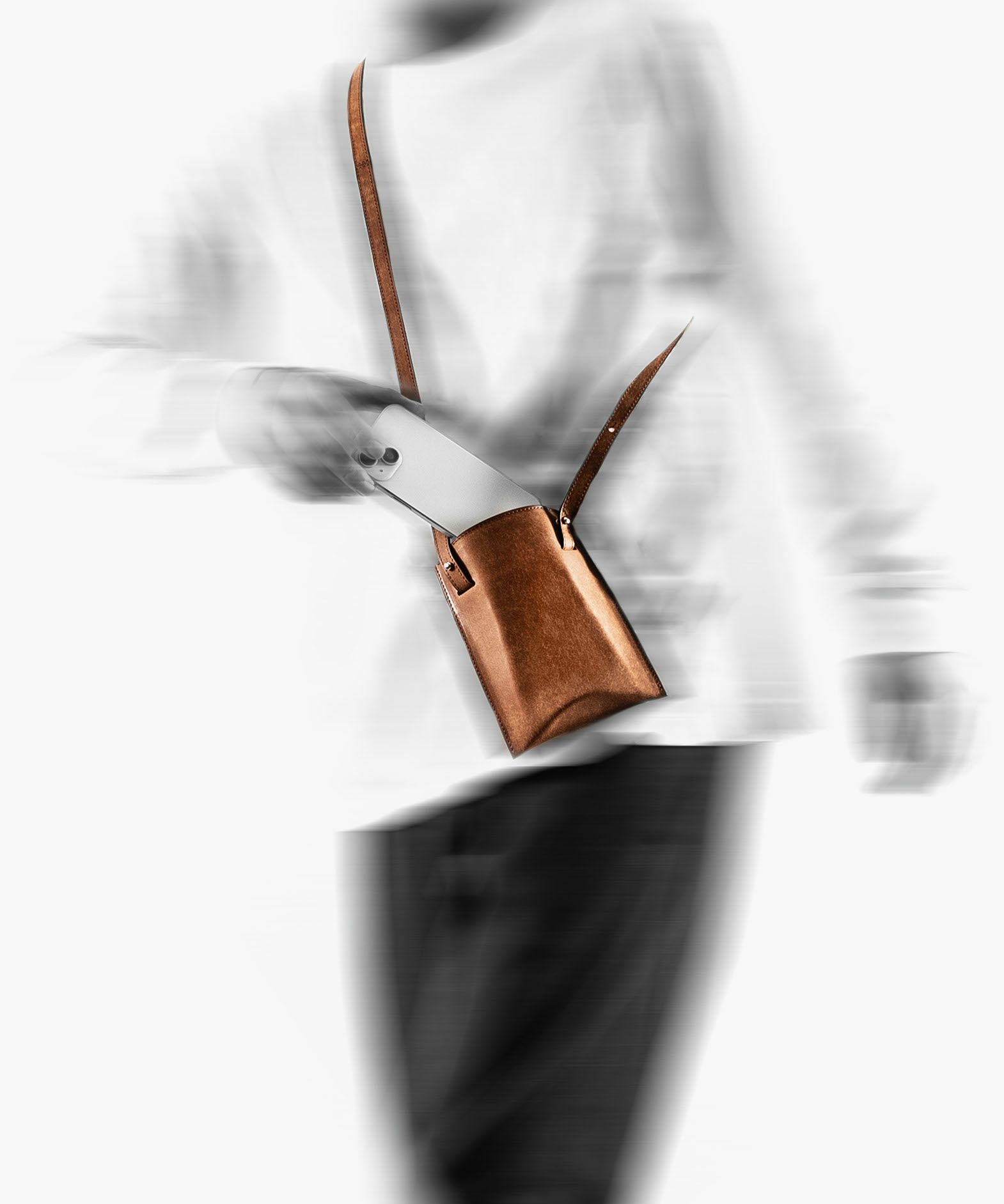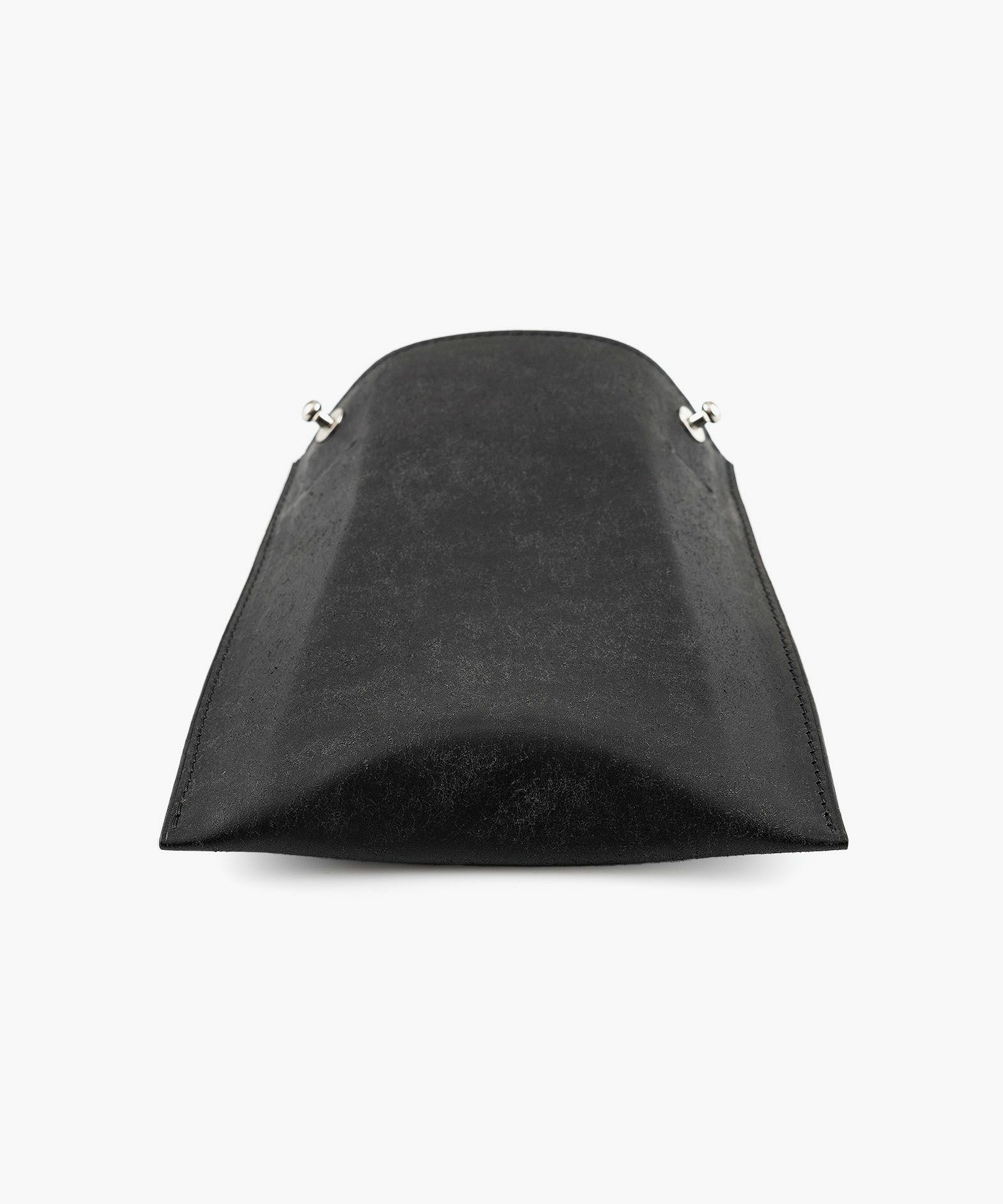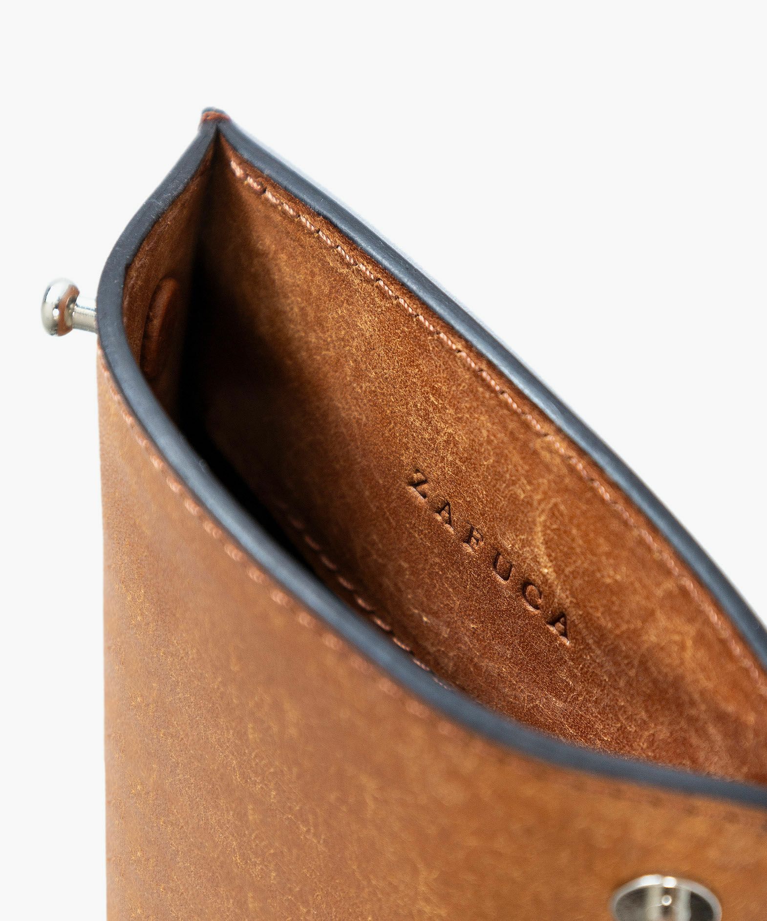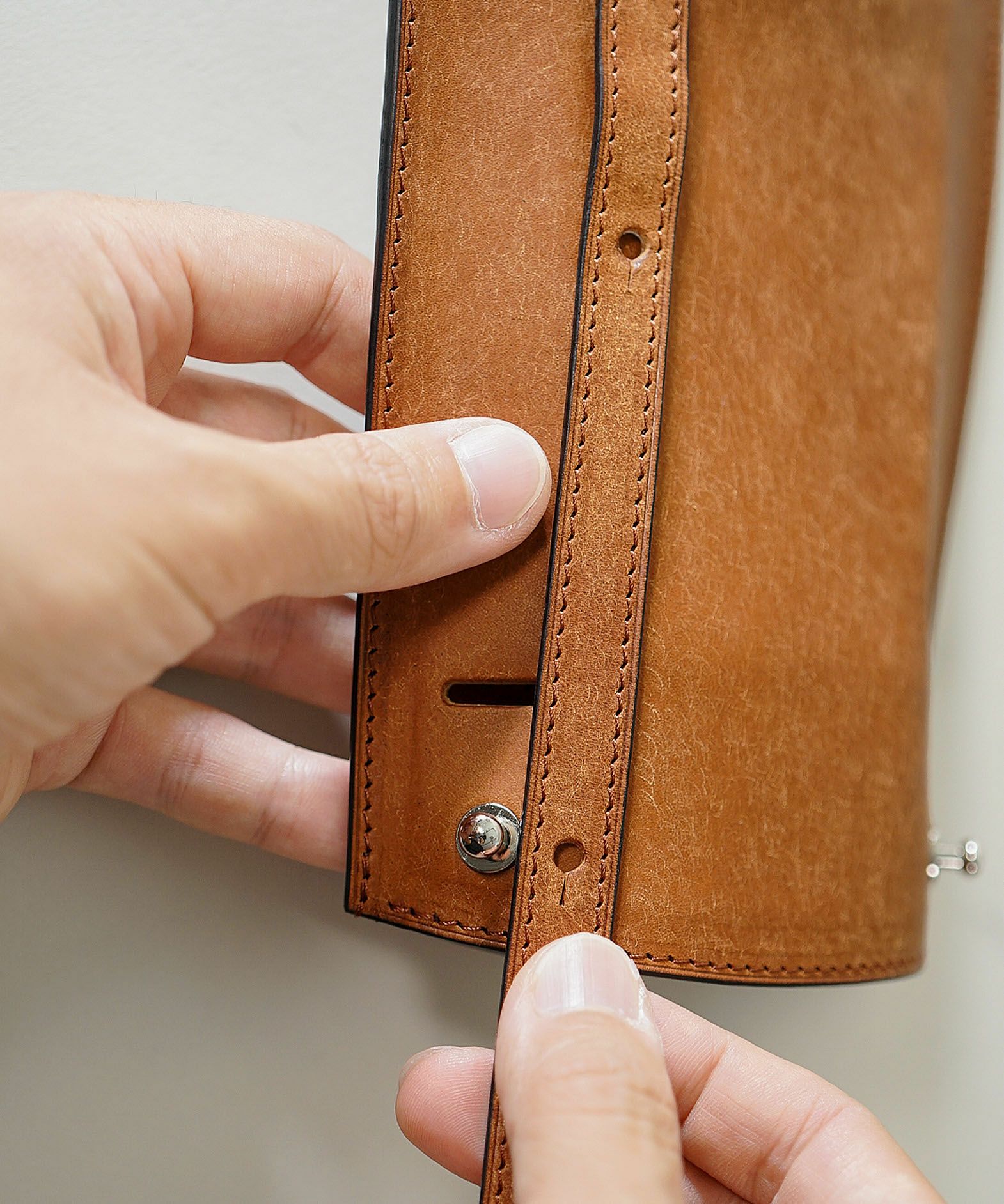 曲線の折れ目(=FOLD)が印象的なシルエットと、カブセを排したクール(=COOL)なデザインと使い心地から、2つを組み合わせた造語をアイテム名にした、スマホポシェット“FOLCO”。和紙のように表面を起毛させた独特の風合いが魅力的な「プエブロ」の一枚革を、前面と背面で形状を変えて縫い合わせ、独特の膨らみを形作った立体感を創出。2種類の芯材を組み合わせながら、裏面に少し溝を彫ることで、美しく柔らかいラインの折り目へと昇華。ショルダーベルトは、スッキリ感のあるギボシで接続させ、両サイドそれぞれで長さを調整することも。スマートフォン1台をスマートに収納できる、遊び心あふれる量産できない独創的なポシェットが、性別も年齢も問わず、すべての人たちを楽しませてくれる。