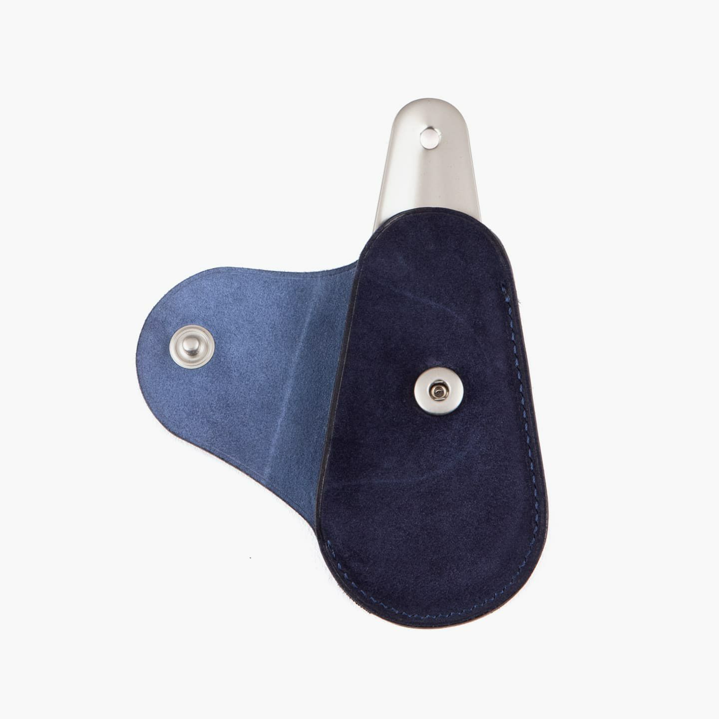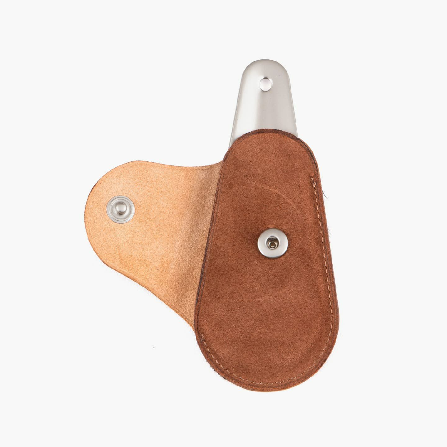 上質なマット感が、洗練さを醸す真鍮製の靴べら。靴のデザインをモチーフにした、芯も裏地も使わない一枚仕立てのホック付きカバーを付属し、拳銃のホルスターのように洒落たアクセサリーとして身につけることも可能。可能な限りパーツを分割せず、革が繋がるように設計し、滑らかな質感・しなりが感じられる丁寧な折りによる造形を実現しています。