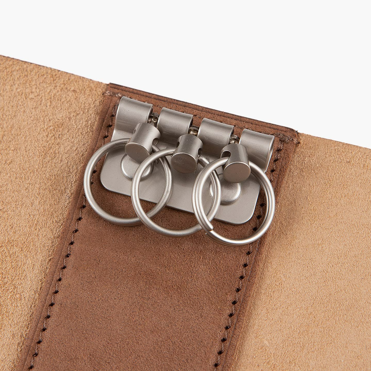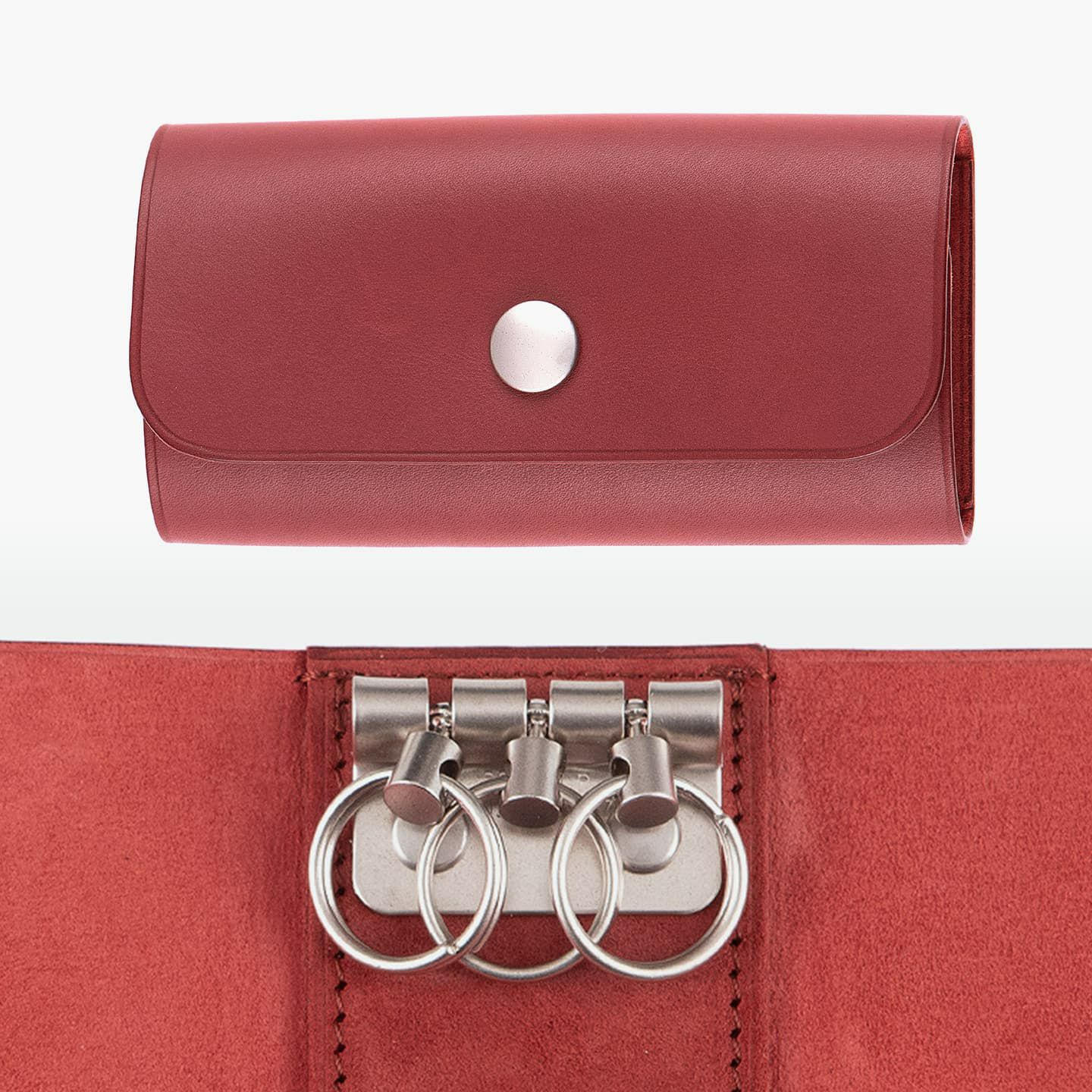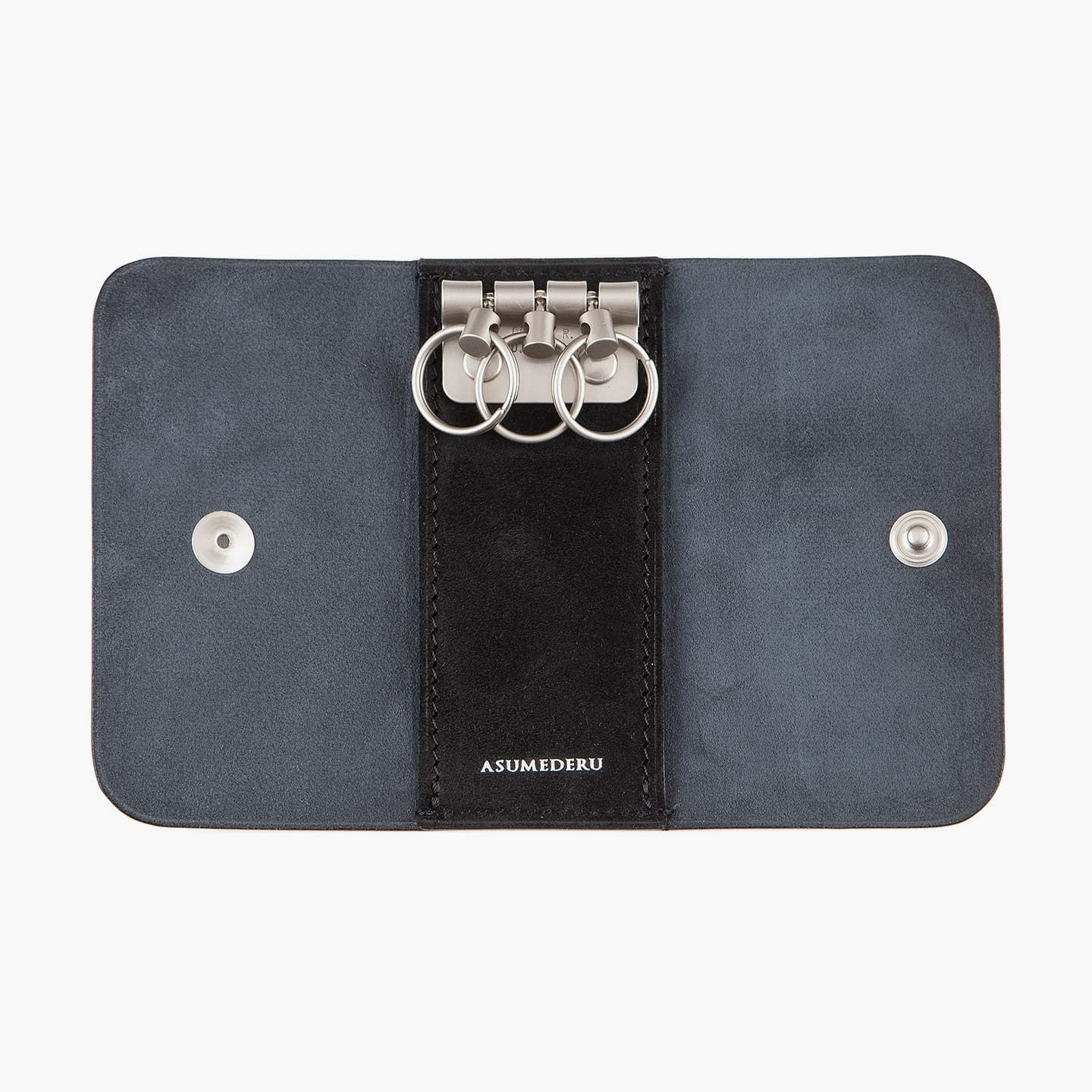 『ASUMEDERU』の金具類は、マット感のある質感が魅力。内装の中央上部に備わっている3連キーリングは、使い勝手が良く、ディテールの完成度も優れています。さらに、金具類を引き立てるために、「ベビーカーフ」の銀面と床面を組み合わせて色彩の立体感を生み出すことで、エレガントな雰囲気を創出。40年以上も財布を作り続けている豊富な経験を生かし、一流の技術が必要とされる薄くてシンプルなデザインを実現しています。