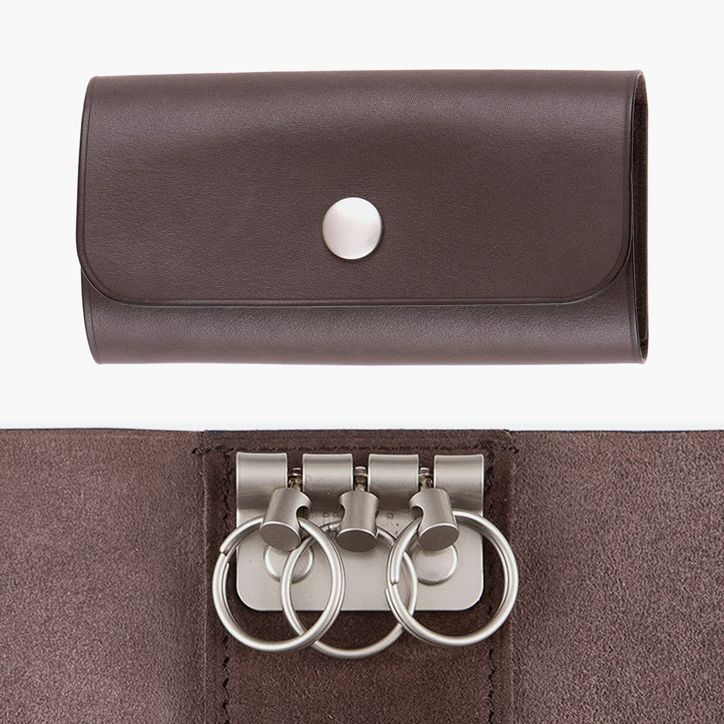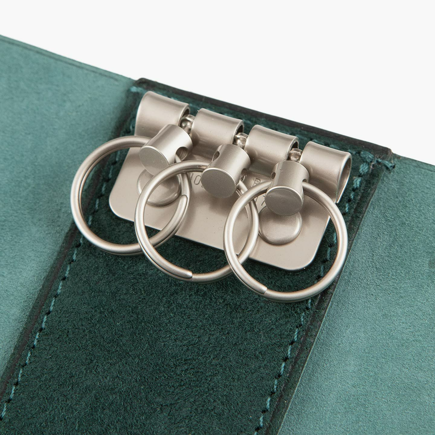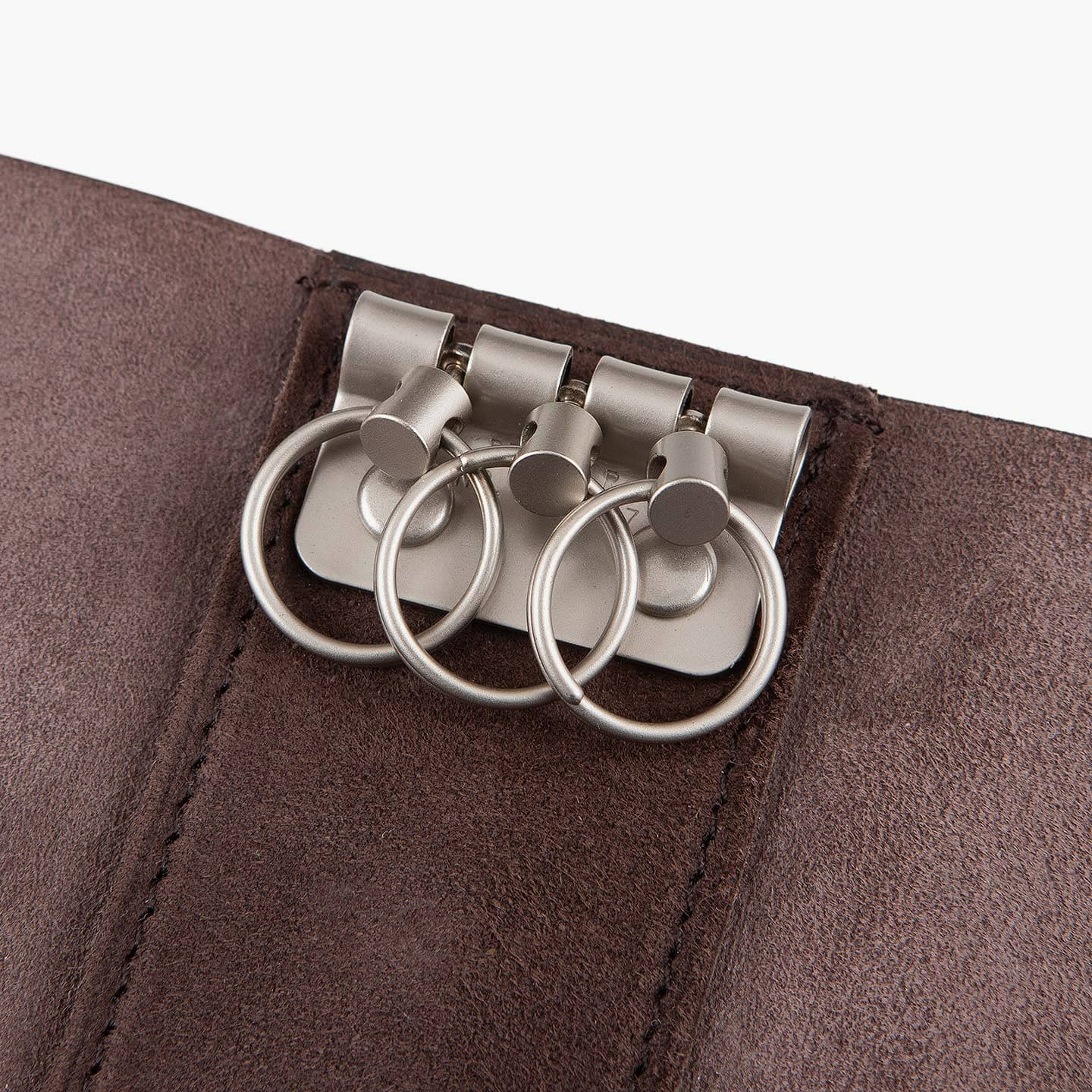 『ASUMEDERU』の金具類は、マット感のある質感が魅力。内装の中央上部に備わっている3連キーリングは、使い勝手が良く、ディテールの完成度も優れています。さらに、金具類を引き立てるために、「ベビーカーフ」の銀面と床面を組み合わせて色彩の立体感を生み出すことで、エレガントな雰囲気を創出。40年以上も財布を作り続けている豊富な経験を生かし、一流の技術が必要とされる薄くてシンプルなデザインを実現しています。