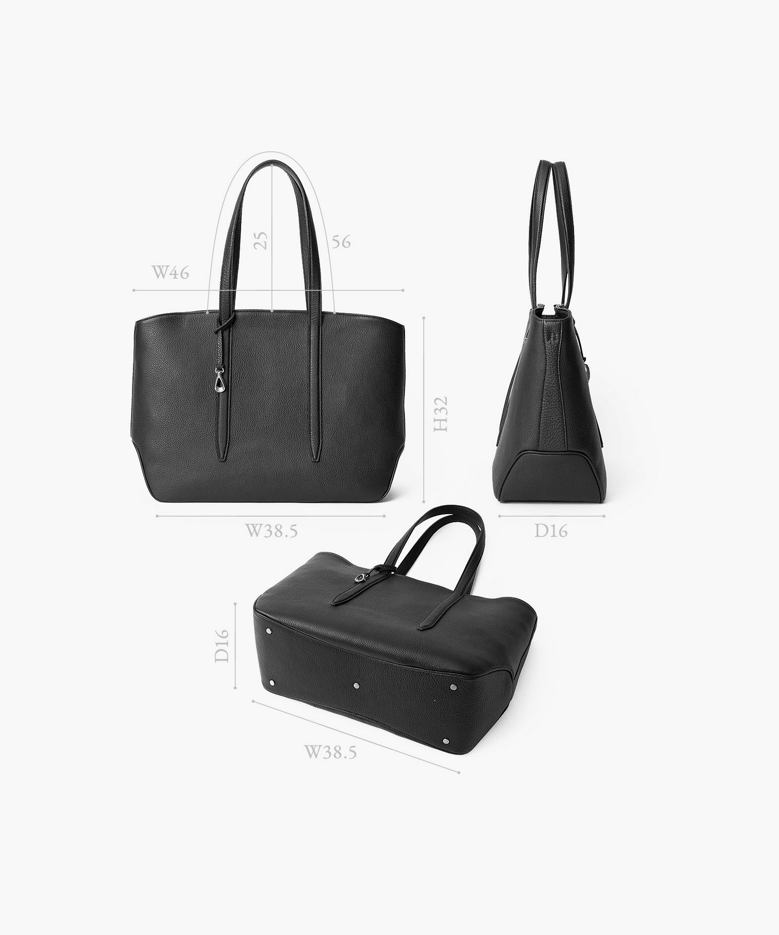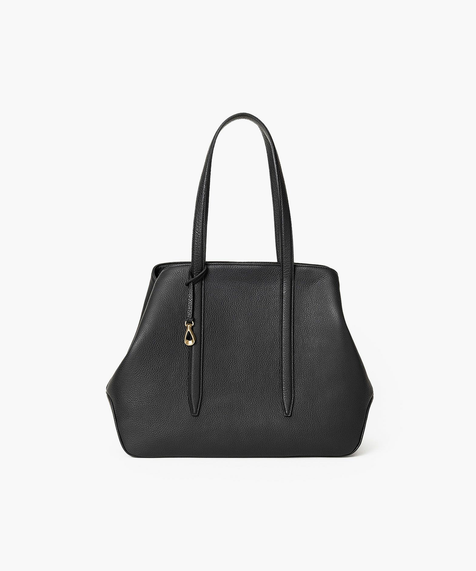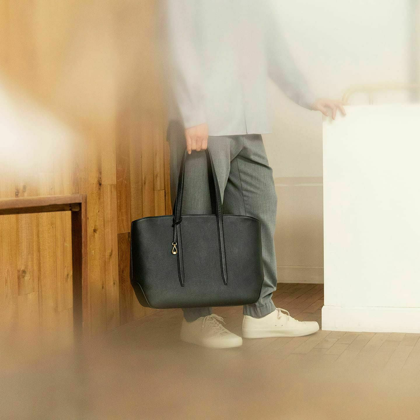 ファスナー開閉式で、B4サイズ・15インチのノートパソコンが収納可能。マチを内側に折り畳んでコンパクトにすることができ、用途に合わせて2通りのシルエット・サイズを楽しめます。また、バッグの上部を、左右のマチに向かって下がっていくラインにすることで、マチを内側に折り畳んでも天ファスナーがぶつからない機能性と、個性的でエレガントな見た目の美しさを両立。さらに、くびれをセンターに施した底マチは、肩掛けするときに体にフィットしてスムーズに持ち歩ける実用性と、独特のライン&フォルムがアクセントになるデザイン性を兼ね備えています。