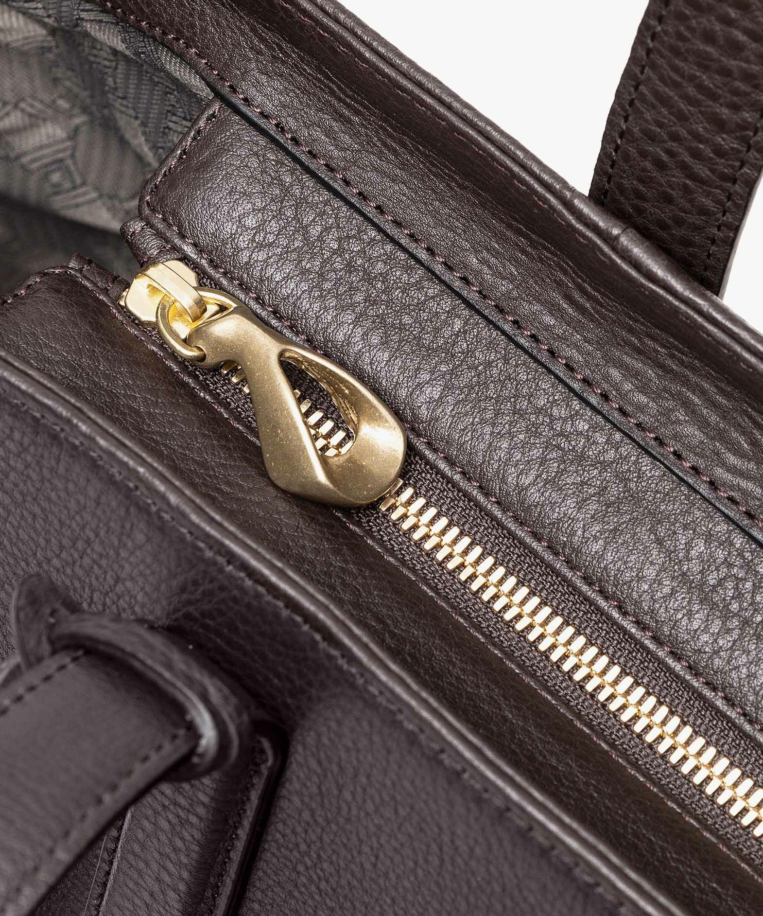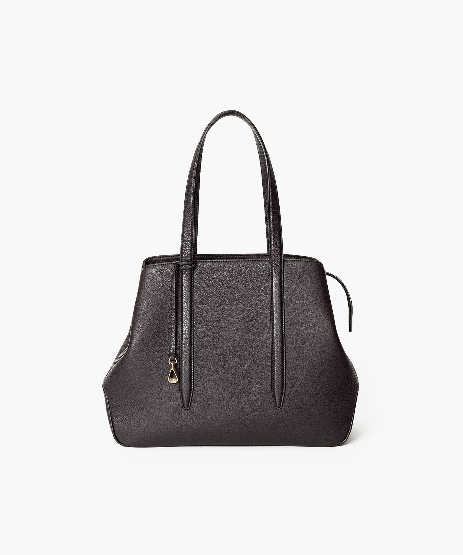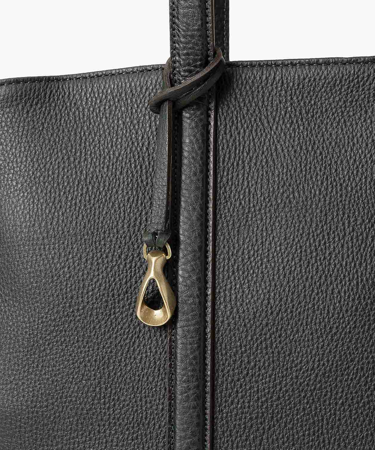ファスナー開閉式で、B4サイズ・15インチのノートパソコンが収納可能。マチを内側に折り畳んでコンパクトにすることができ、用途に合わせて2通りのシルエット・サイズを楽しめます。また、バッグの上部を、左右のマチに向かって下がっていくラインにすることで、マチを内側に折り畳んでも天ファスナーがぶつからない機能性と、個性的でエレガントな見た目の美しさを両立。さらに、くびれをセンターに施した底マチは、肩掛けするときに体にフィットしてスムーズに持ち歩ける実用性と、独特のライン&フォルムがアクセントになるデザイン性を兼ね備えています。