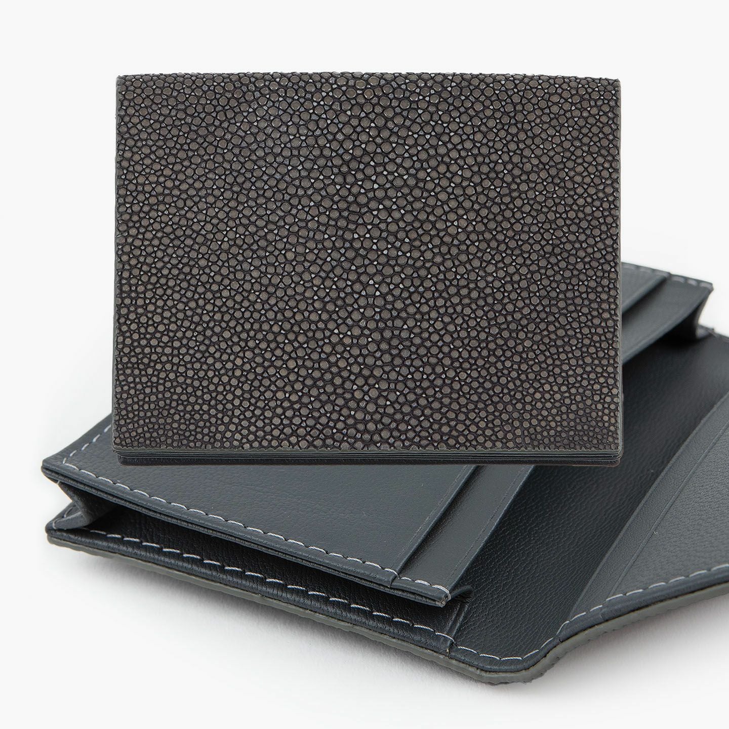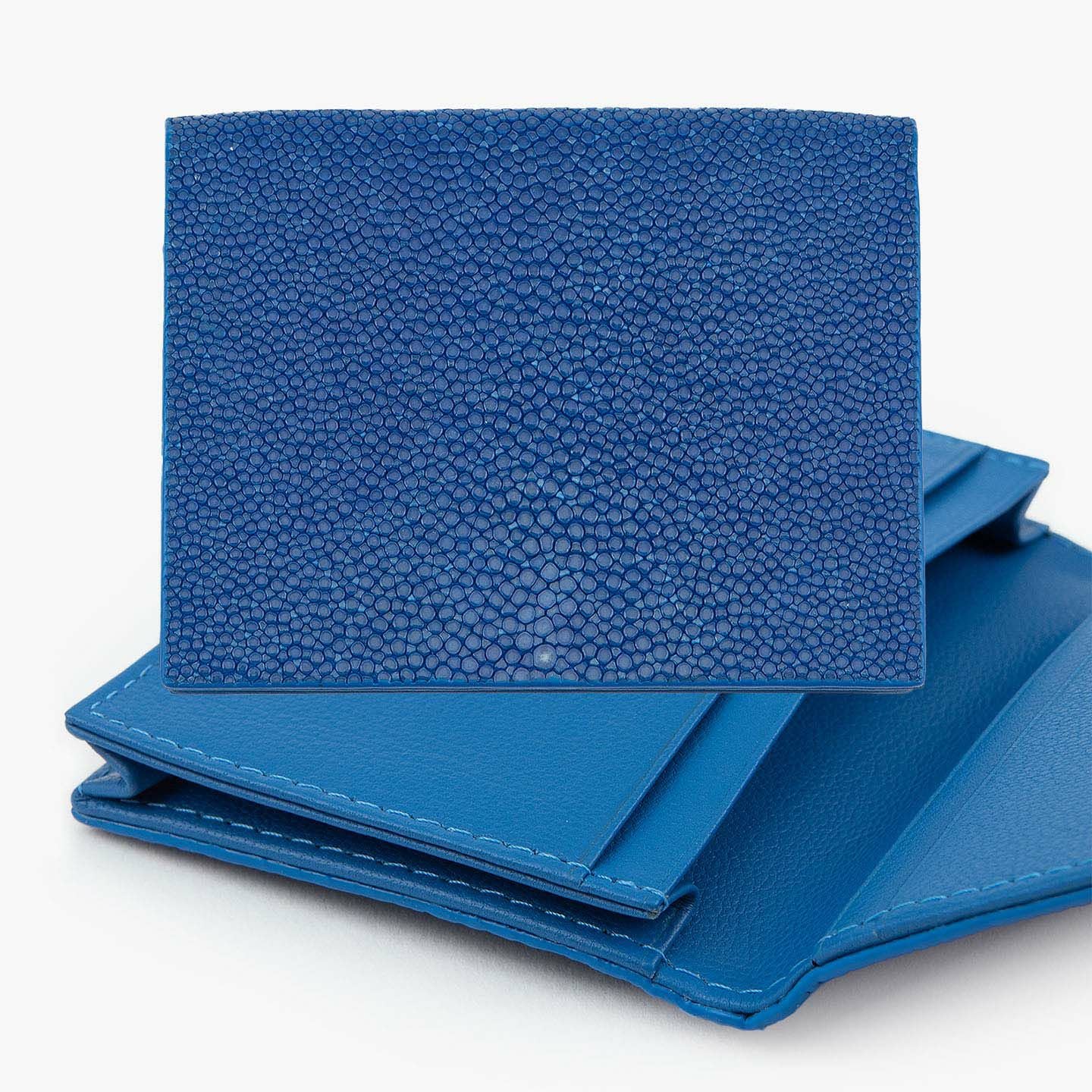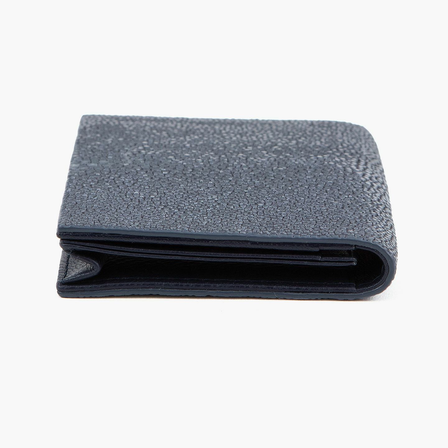 革製品としての最高のパフォーマンスを実現するために、革職人たちが飽くなき探求と努力、クリエイティビティとクオリティを追求しているブランド『Atelier AKNAS』の名刺入れ(S)。メインポケットには、紙袋のように底部までマチが付いている「通しマチ」を採用し、一般的な名刺の厚さであれば30枚ほどまで入れられるとともに、3つのサブカードポケットも備えて名刺の仕分けができ、その収納性と実用性で貢献。ガラスビーズを散りばめたような小さな鱗が美しいたエイ革「ガルーシャ」を、外装として贅沢に纏わせながら、古来より“ラッキーフィッシュ”と呼ばれてきた縁起の良さも、ビジネスシーンにもたらしてくれる。