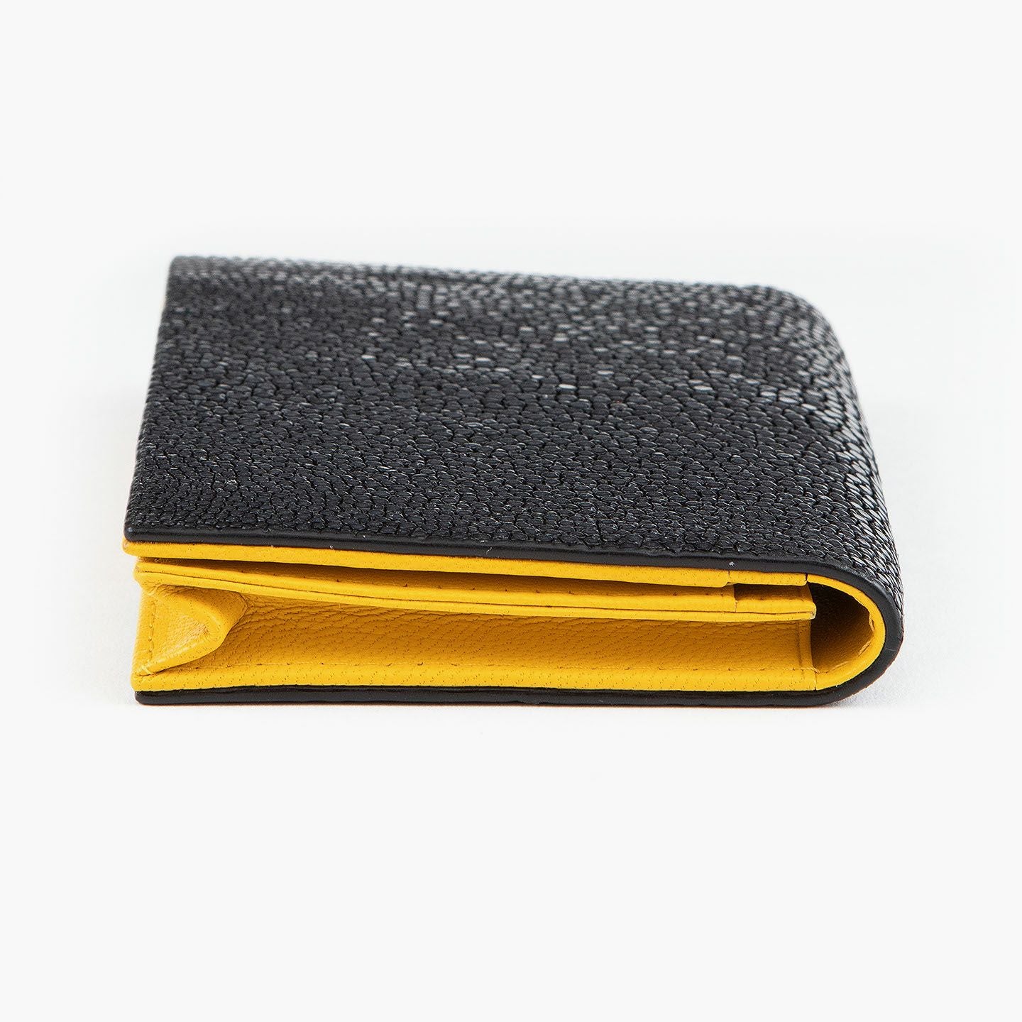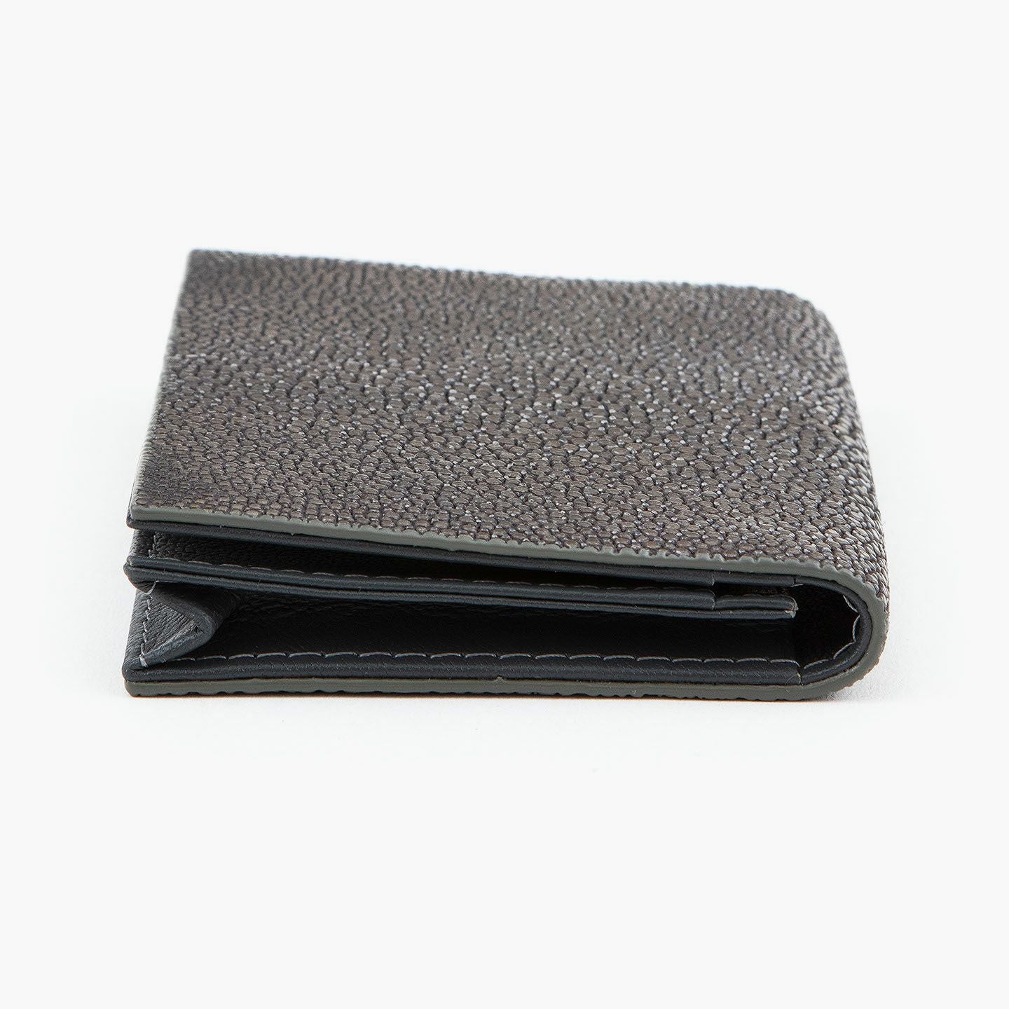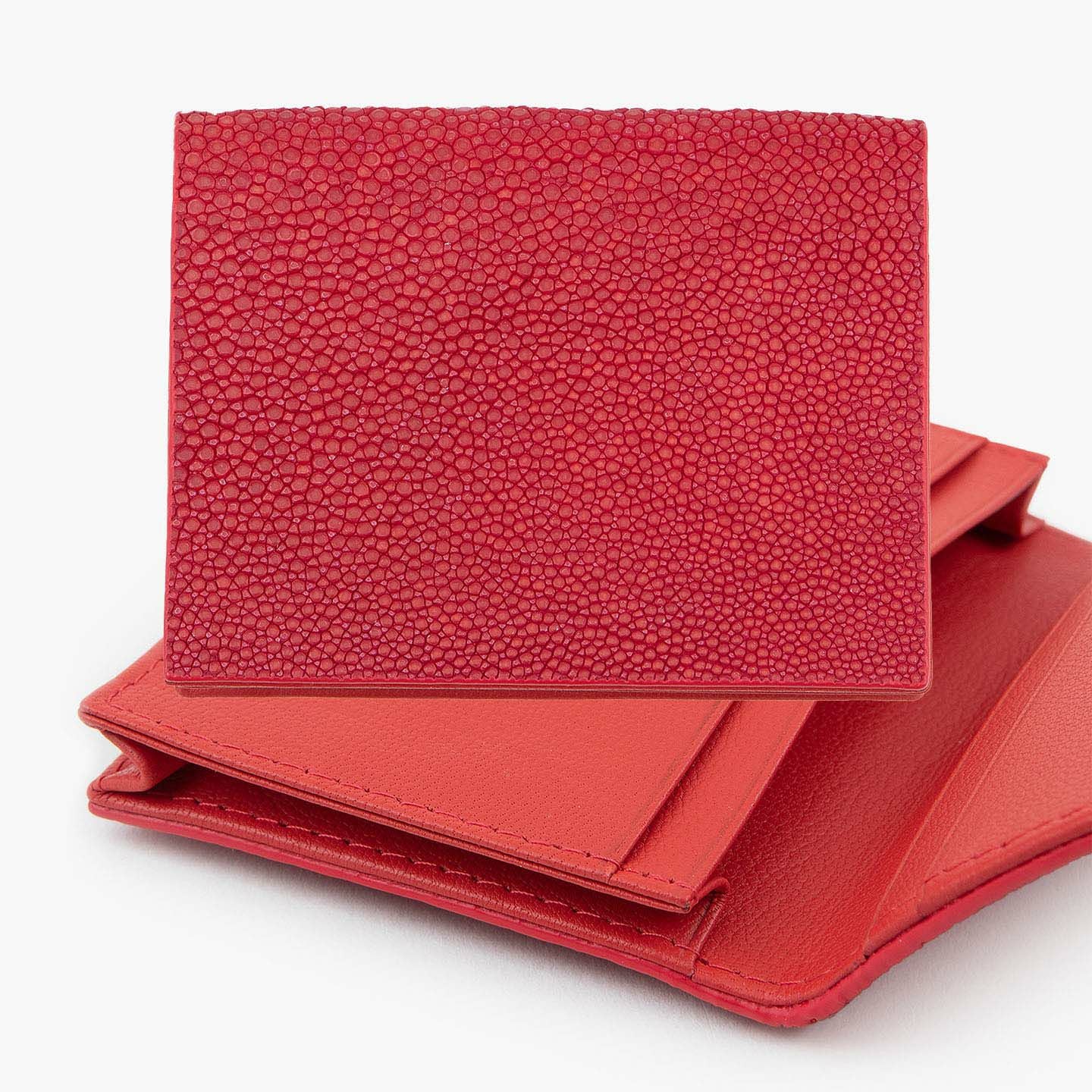 革製品としての最高のパフォーマンスを実現するために、革職人たちが飽くなき探求と努力、クリエイティビティとクオリティを追求しているブランド『Atelier AKNAS』の名刺入れ(S)。メインポケットには、紙袋のように底部までマチが付いている「通しマチ」を採用し、一般的な名刺の厚さであれば30枚ほどまで入れられるとともに、3つのサブカードポケットも備えて名刺の仕分けができ、その収納性と実用性で貢献。ガラスビーズを散りばめたような小さな鱗が美しいたエイ革「ガルーシャ」を、外装として贅沢に纏わせながら、古来より“ラッキーフィッシュ”と呼ばれてきた縁起の良さも、ビジネスシーンにもたらしてくれる。